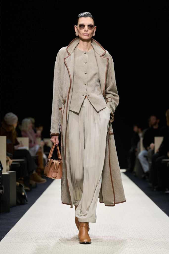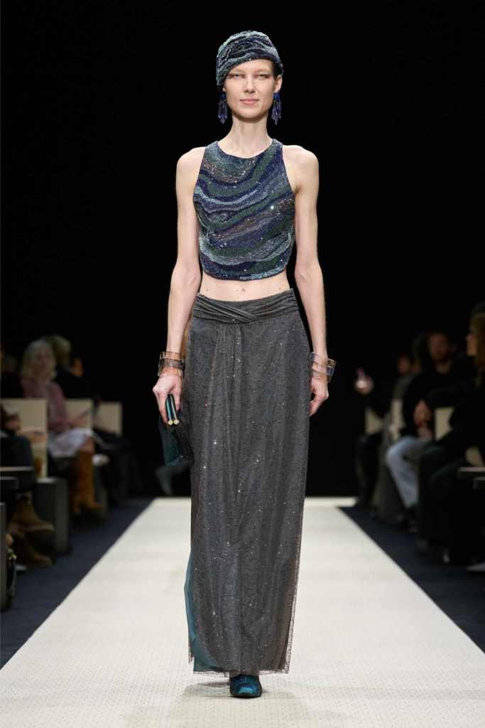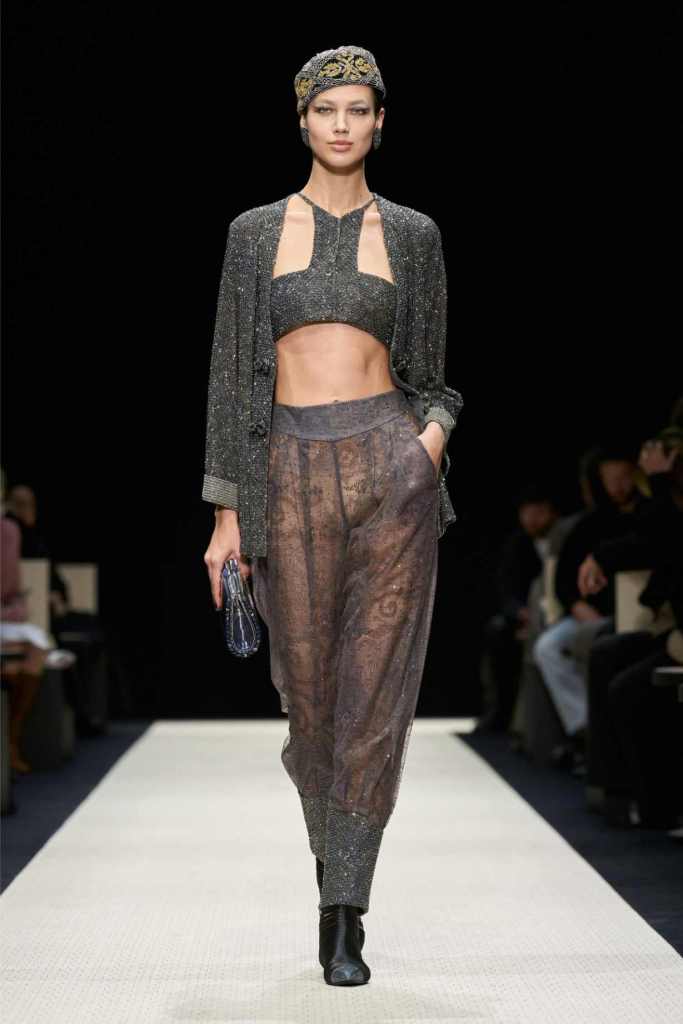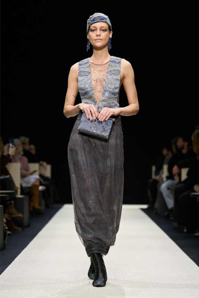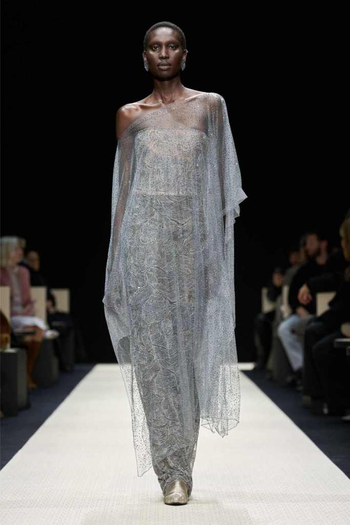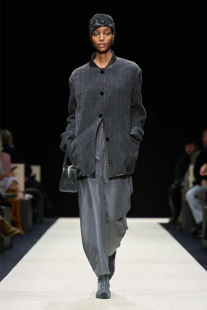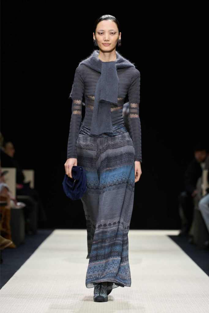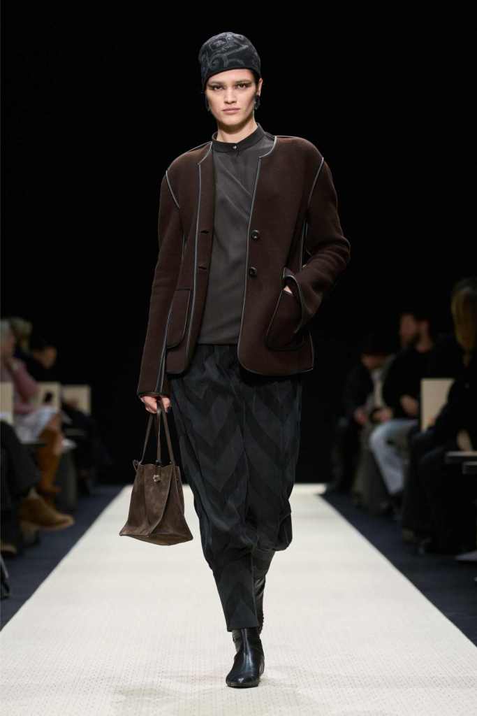 Armani’s signature tailoring was ever-present but reimagined in softer, more relaxed forms. Jackets had a deconstructed ease, often belted at the waist or cut in wrap styles inspired by global influences. The trousers, a standout feature, flowed effortlessly—some cinched at the ankle, others draped in elegant pleats, all moving with quiet confidence.