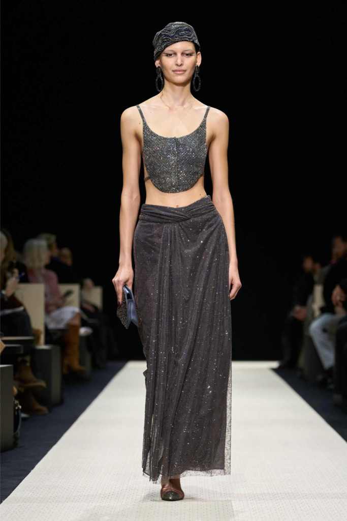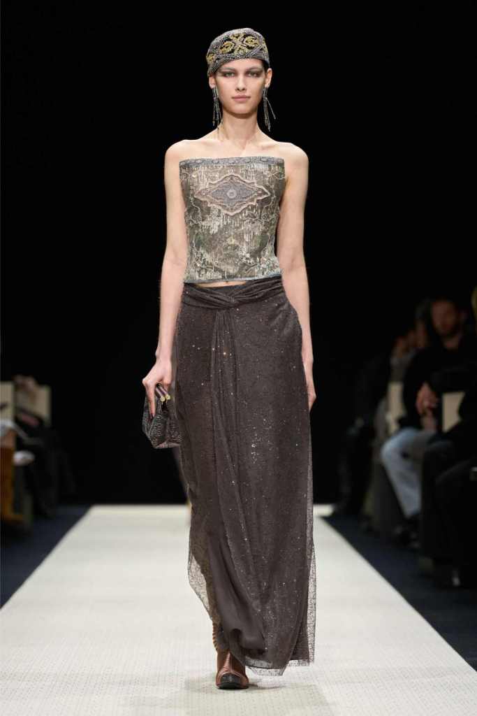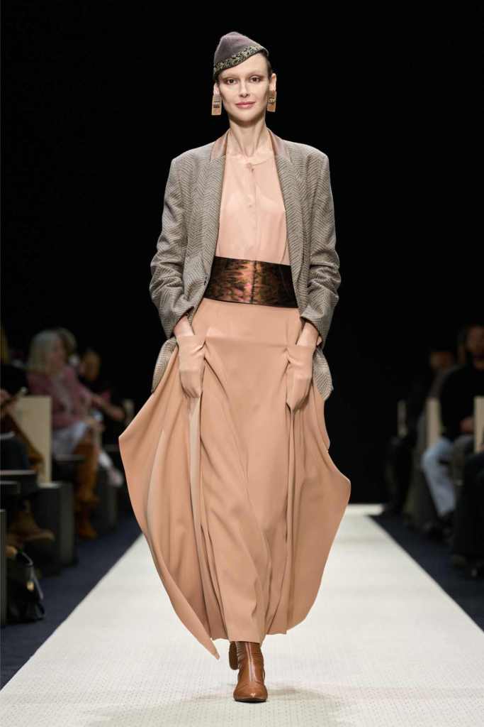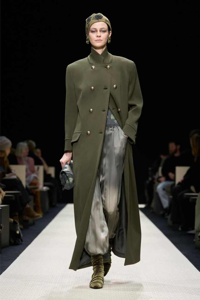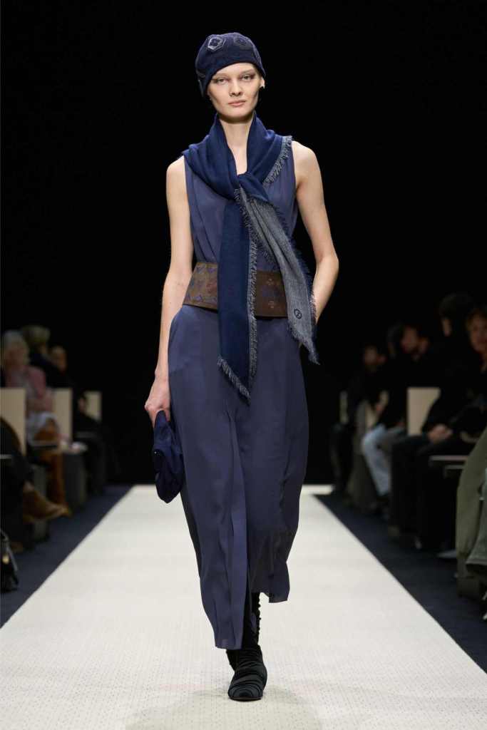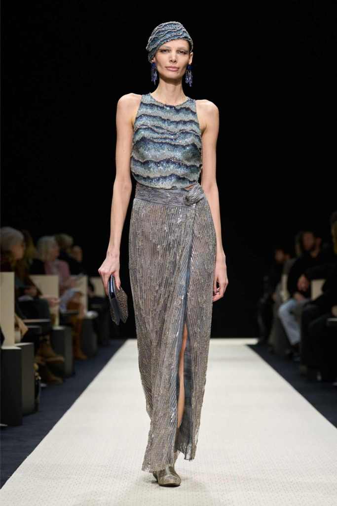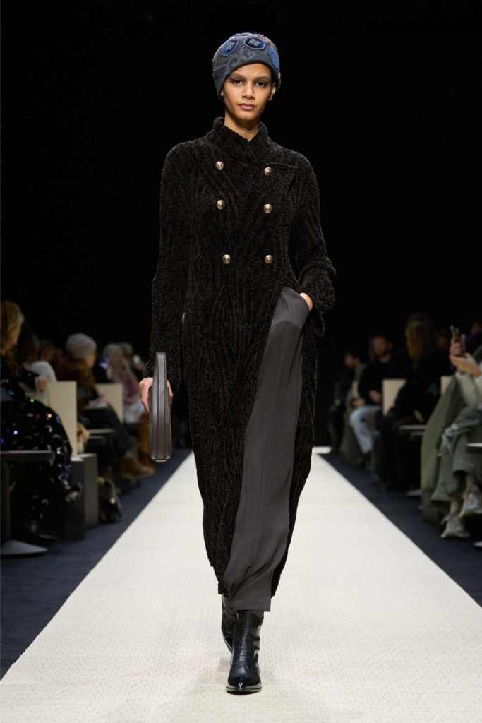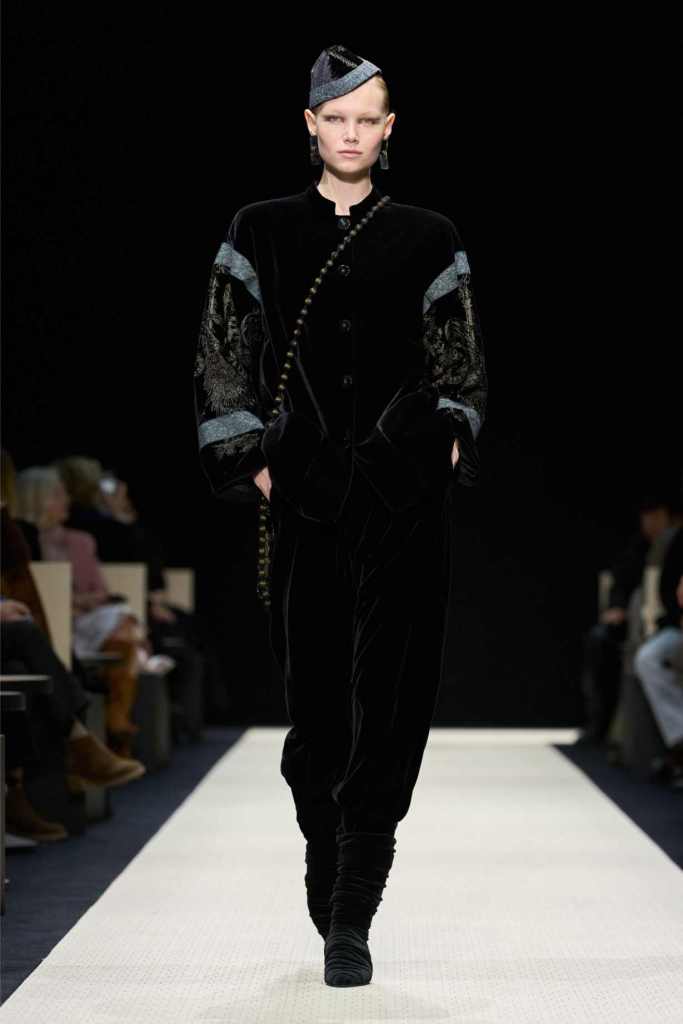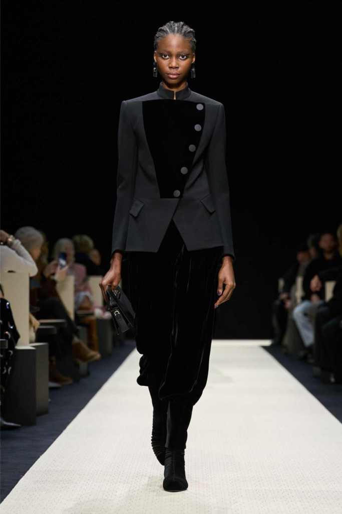 Armani’s signature tailoring was ever-present but reimagined in softer, more relaxed forms. Jackets had a deconstructed ease, often belted at the waist or cut in wrap styles inspired by global influences. The trousers, a standout feature, flowed effortlessly—some cinched at the ankle, others draped in elegant pleats, all moving with quiet confidence.