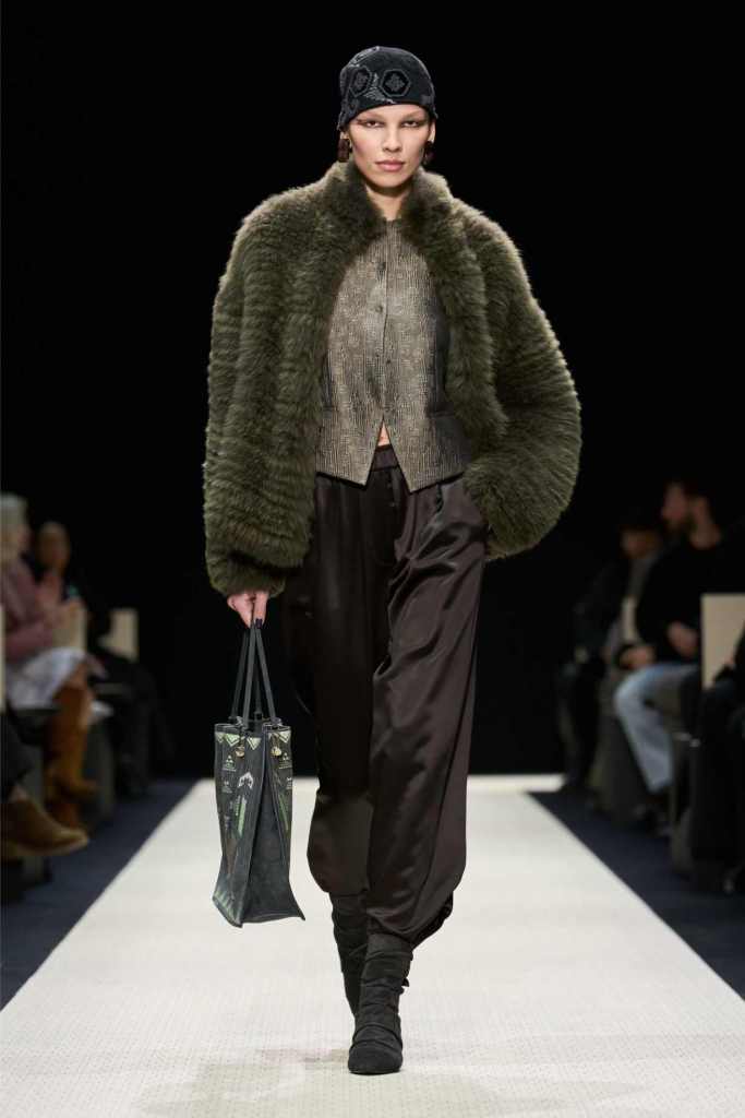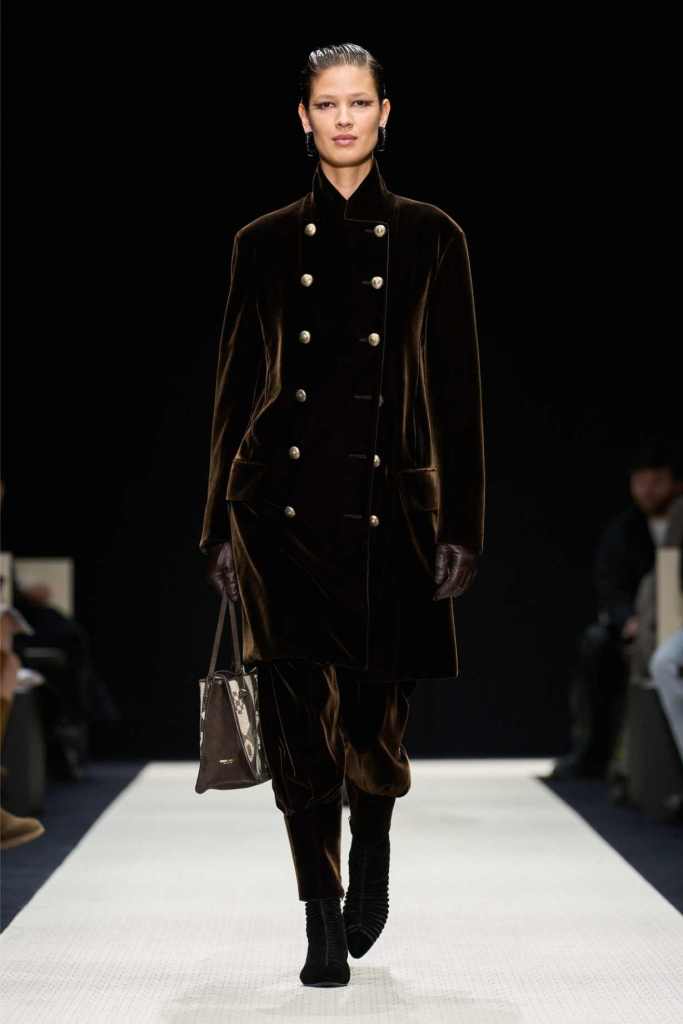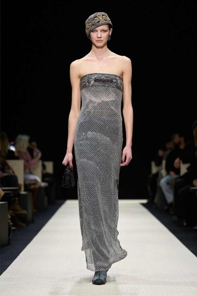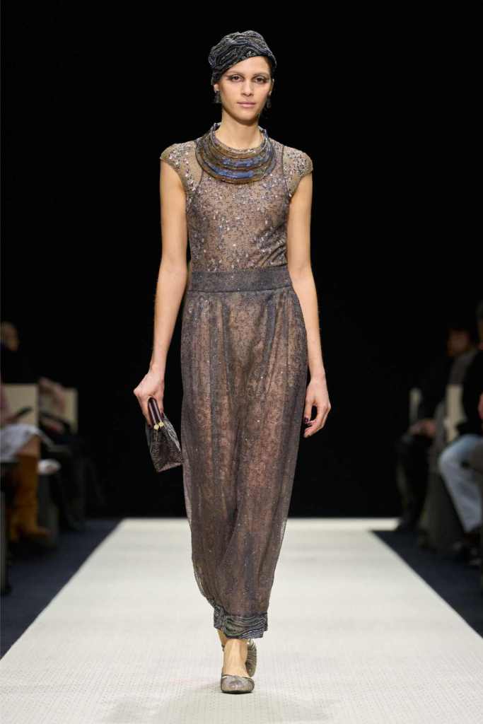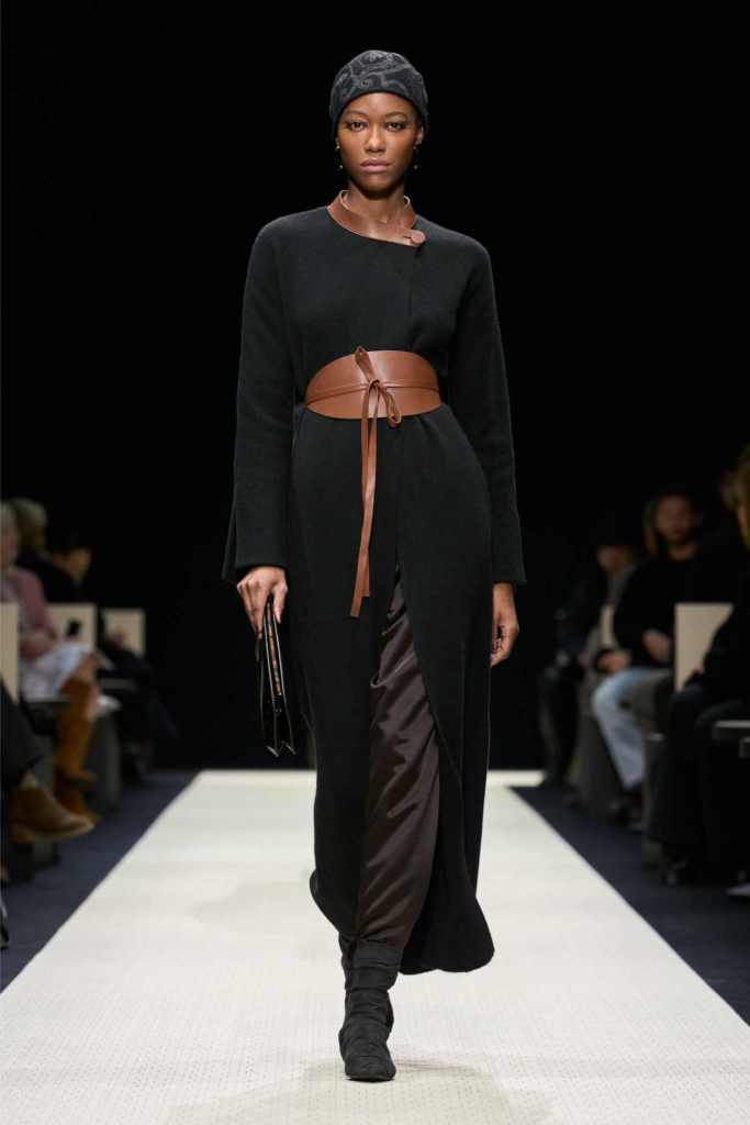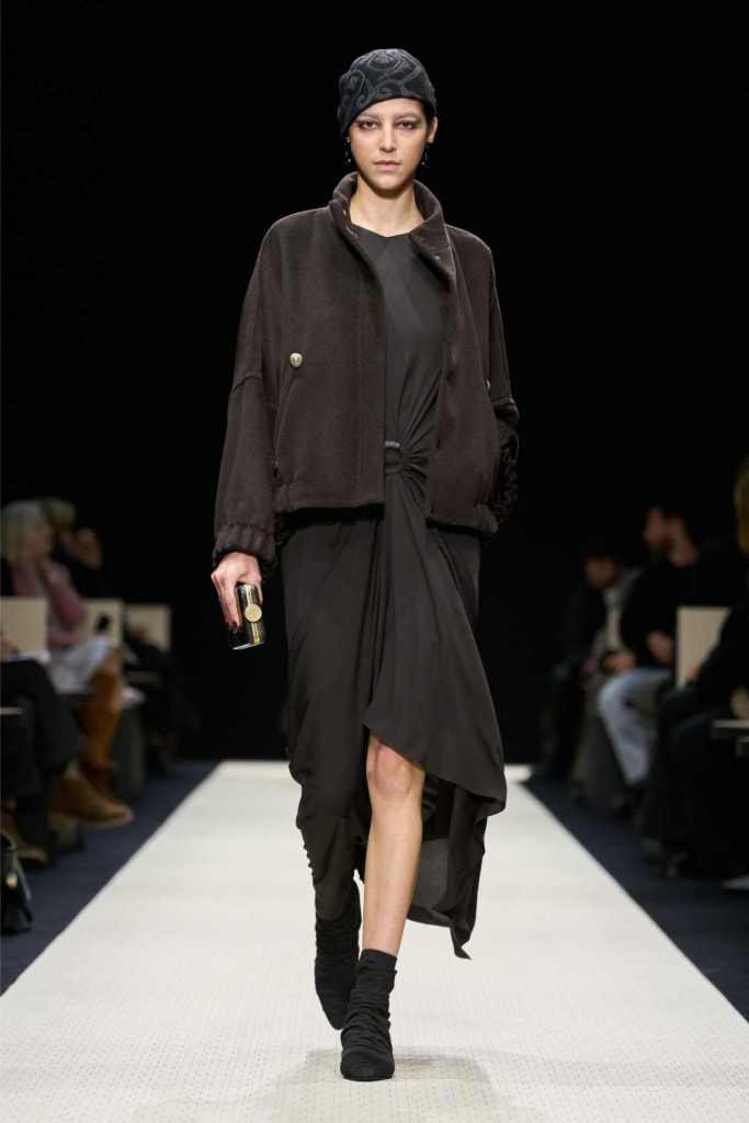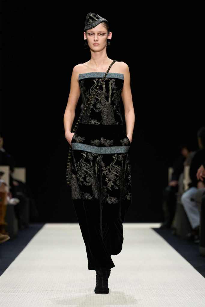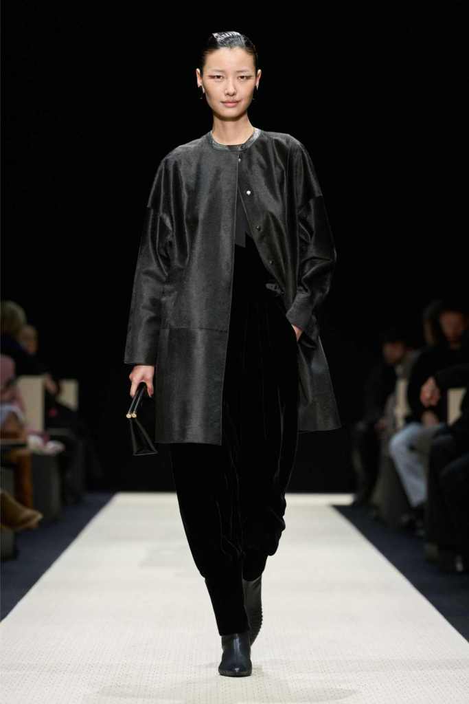 Armani’s signature tailoring was ever-present but reimagined in softer, more relaxed forms. Jackets had a deconstructed ease, often belted at the waist or cut in wrap styles inspired by global influences. The trousers, a standout feature, flowed effortlessly—some cinched at the ankle, others draped in elegant pleats, all moving with quiet confidence.