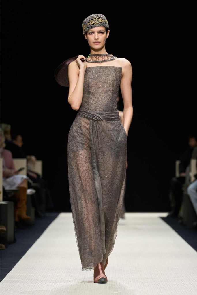 Earthy tones dominated the color palette, reinforcing the collection’s connection to nature and heritage. Shades of chocolate brown, deep olive, and mineral grays created a sense of warmth and timelessness. The eveningwear shimmered with subtle embellishments, from intricate embroidery to sheer layers adorned with delicate beading. Though I wanted to like this collection a bit more than I did, the eveningwear was somewhat disappointing.