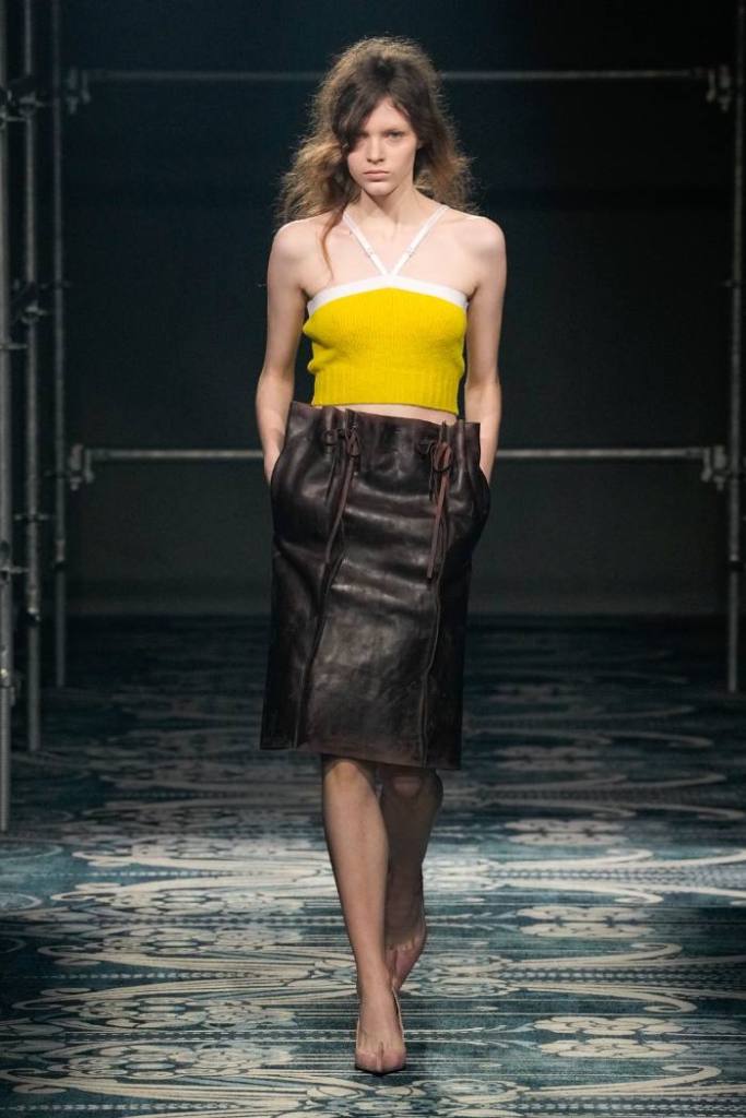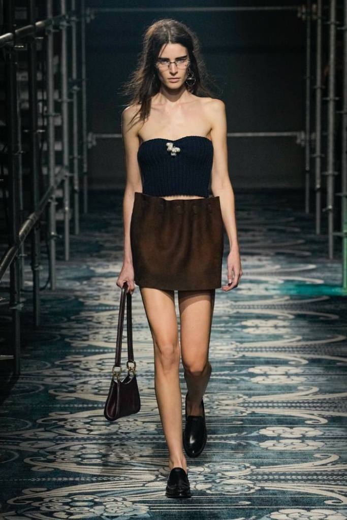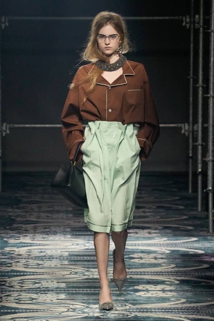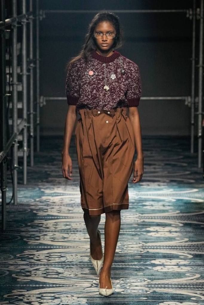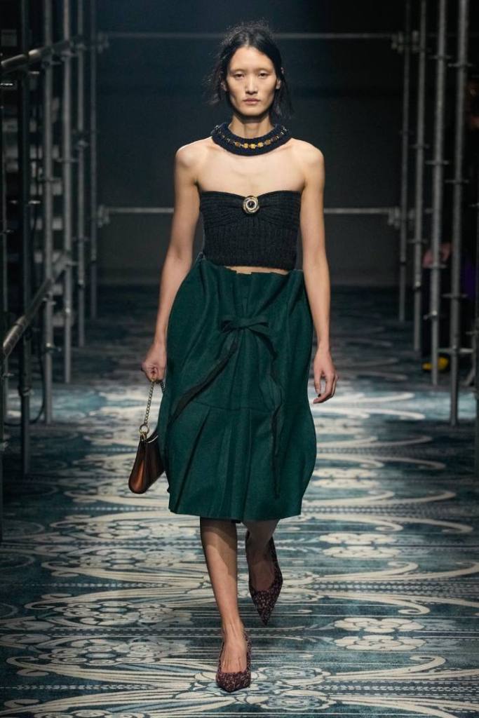 As always, Prada’s accessories made a statement. Structured top-handle bags continued their reign, while built-in jewelry—bejeweled collars, brooch-like embellishments—blurred the line between adornment and function. Footwear ranged from distressed sneakers to sharply pointed heels with unexpected peep-toe details, reinforcing the collection’s overall sense of contrast.