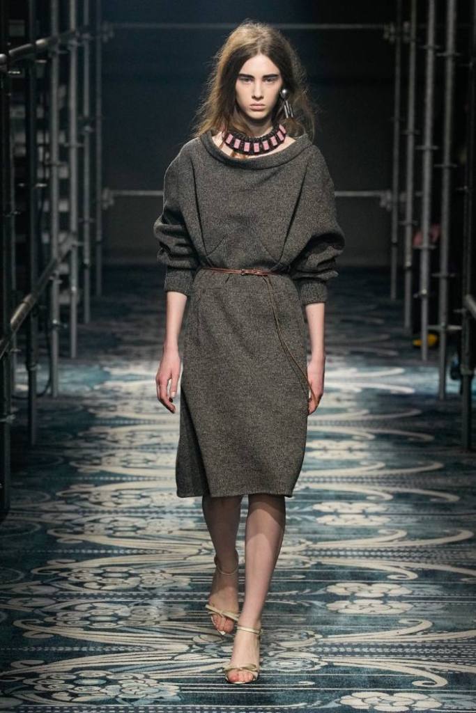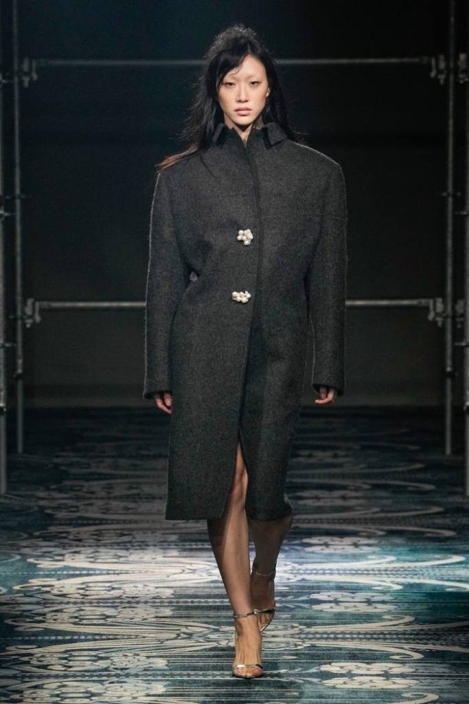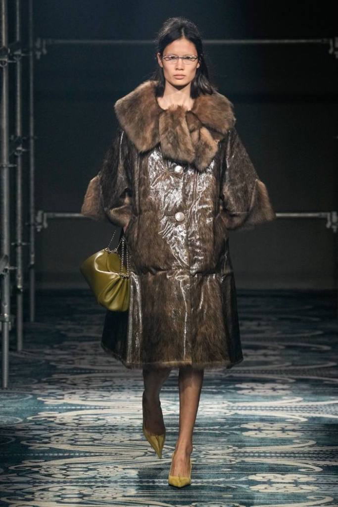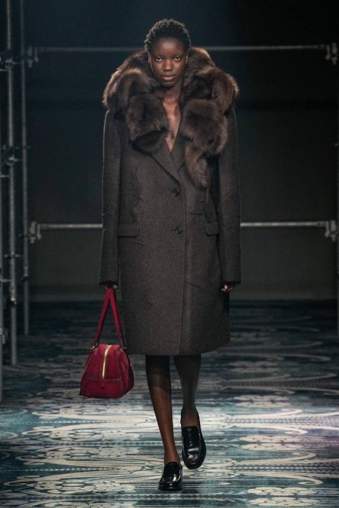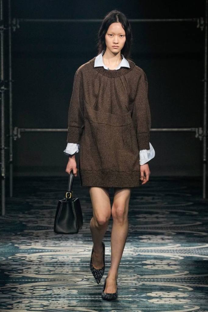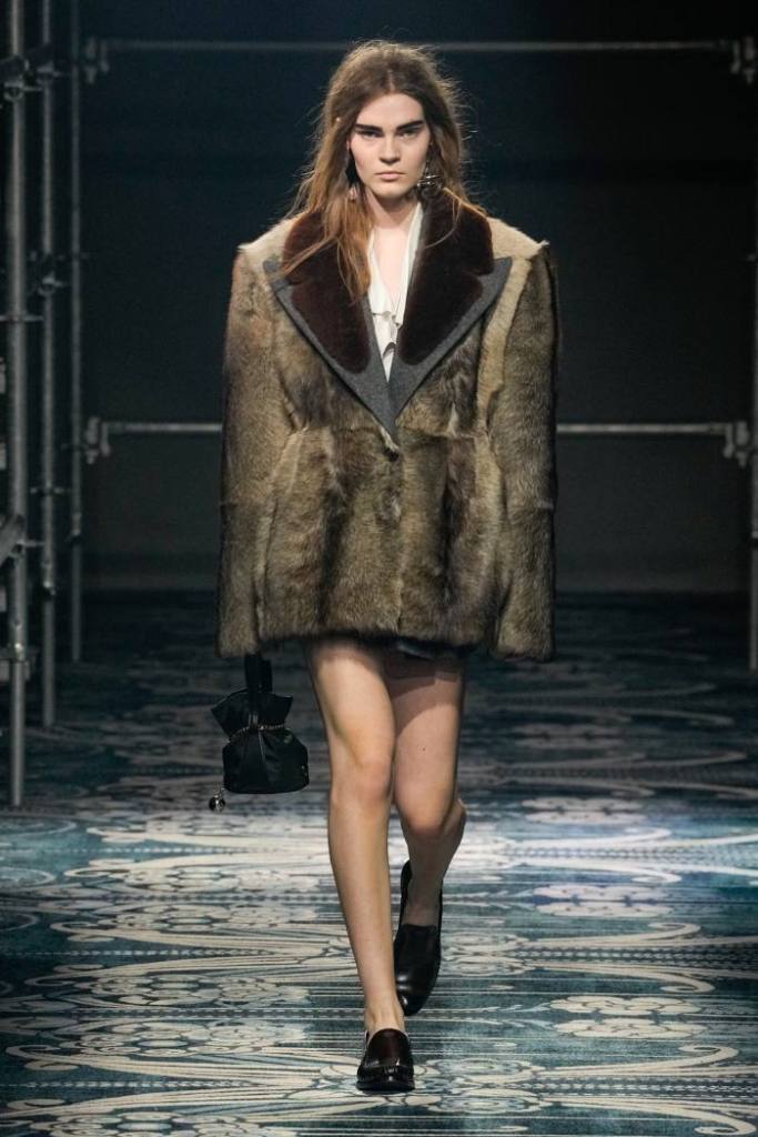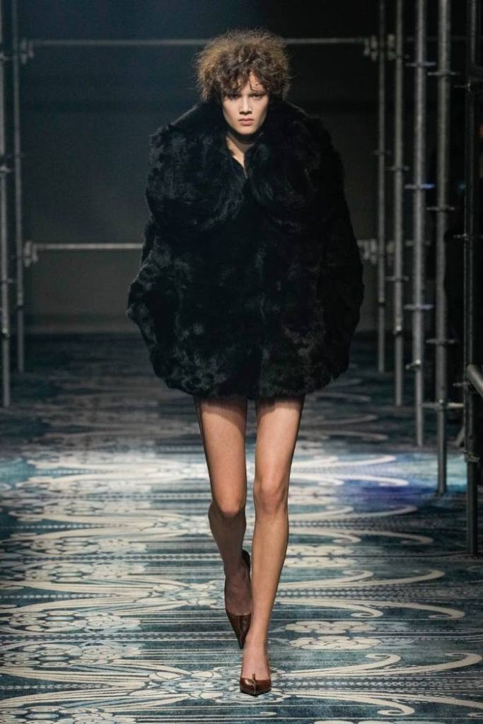 Silhouettes were intentionally awkward: paper-bag waists eliminated the classic hourglass shape, oversized coats swallowed the body, and crumpled floral dresses looked as if they had been stuffed in the back of a closet for years. The fabrics themselves leaned more toward the coarse and heavy, with Prada and Simons favoring structure over fluidity. There were moments of sensuality—fur chubbies worn with pumps and little else, plunging split collars meant for the wearer’s own pleasure—but these were the exceptions rather than the rule.