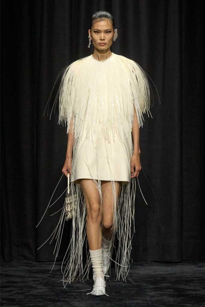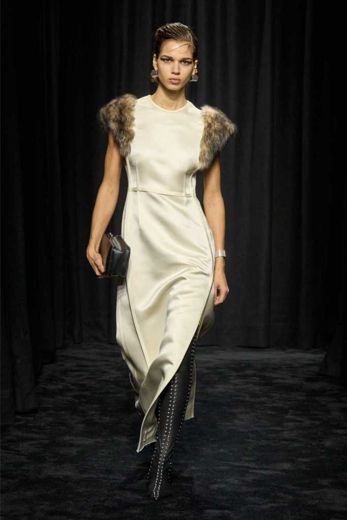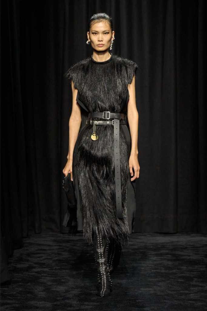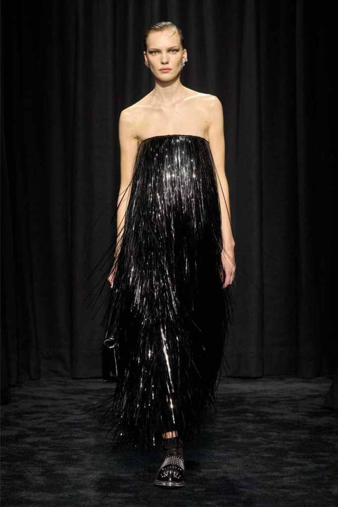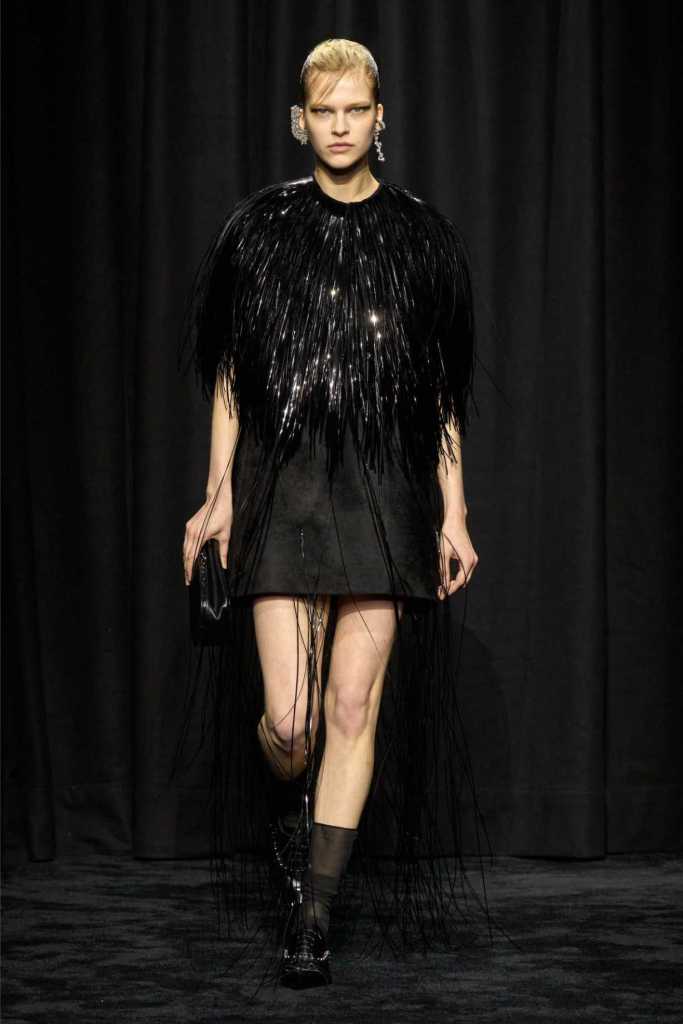 This was a farewell. From their first airy, feminine show in 2017 to this dark, moody, and rebellious collection, the Meiers have taken Jil Sander on a fascinating journey. Right from the start, the atmosphere was charged. The venue was draped in black velvet, the floor equally dark—setting the stage for what was to come. The show opened with striking looks: spiky black fringe embellishing trench coats, strapless dresses, and sharply tailored suits. Military-inspired details, faux-fur accents, and structured kilts reinforced the collection’s bold and defiant tone. It was as if the Meiers were dressing their models for battle—perhaps a metaphor for the challenges of the fashion industry itself.