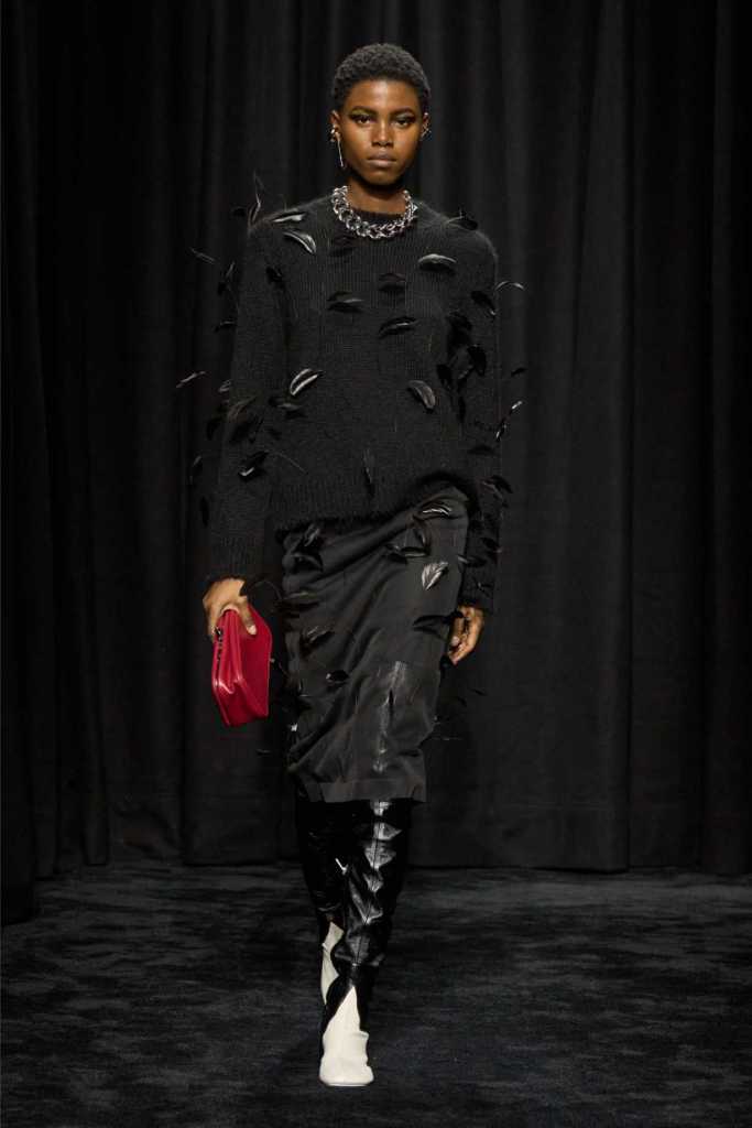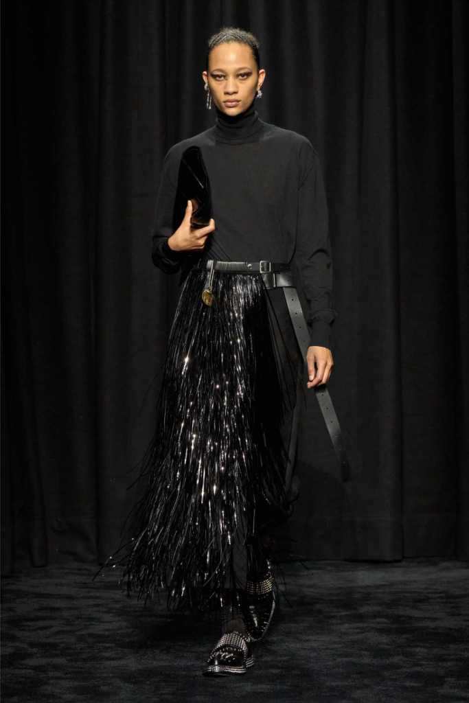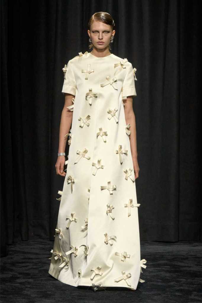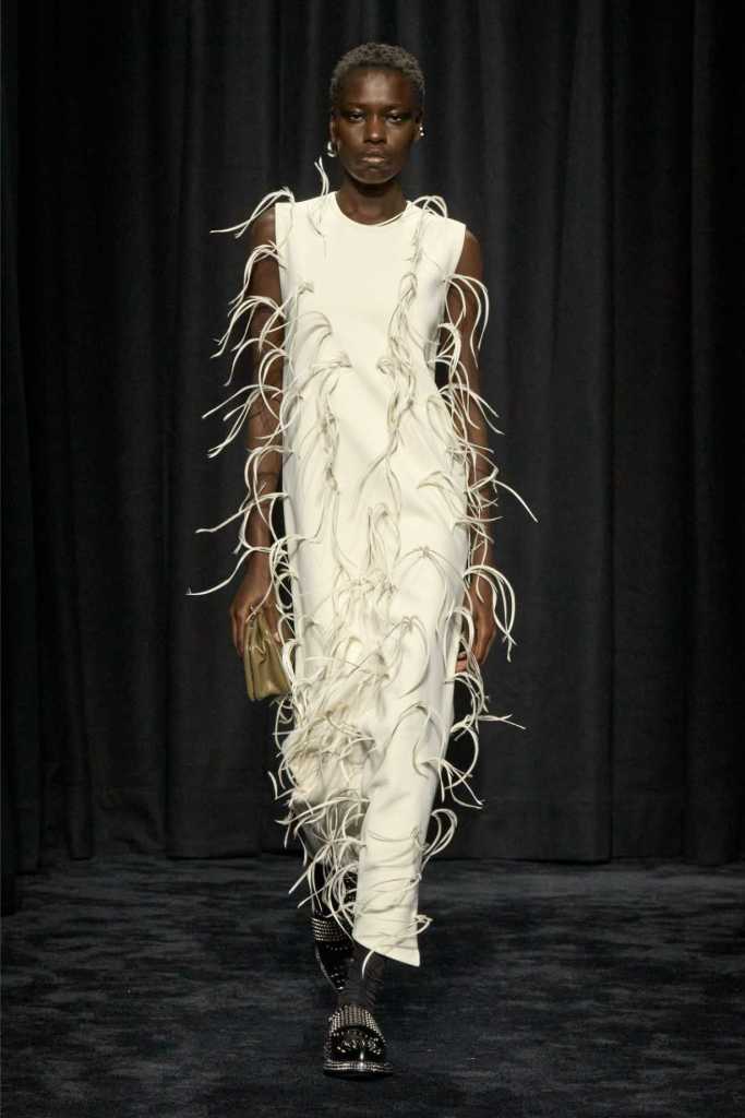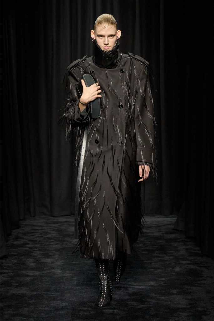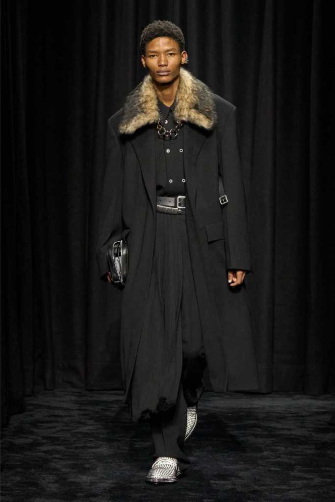 This was a farewell. From their first airy, feminine show in 2017 to this dark, moody, and rebellious collection, the Meiers have taken Jil Sander on a fascinating journey. Right from the start, the atmosphere was charged. The venue was draped in black velvet, the floor equally dark—setting the stage for what was to come. The show opened with striking looks: spiky black fringe embellishing trench coats, strapless dresses, and sharply tailored suits. Military-inspired details, faux-fur accents, and structured kilts reinforced the collection’s bold and defiant tone. It was as if the Meiers were dressing their models for battle—perhaps a metaphor for the challenges of the fashion industry itself.