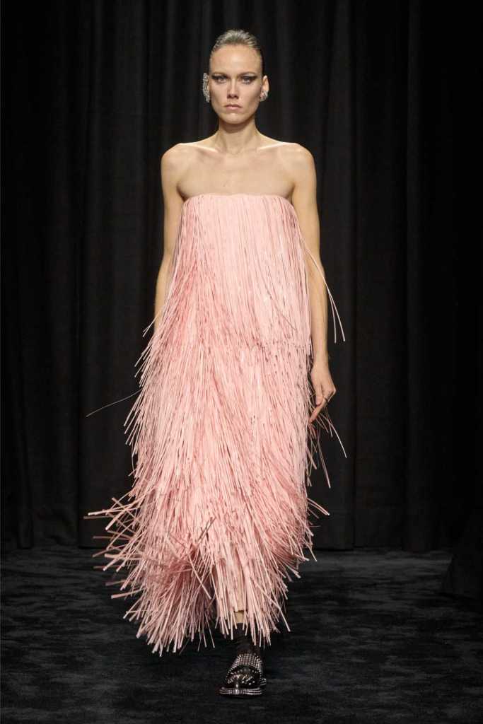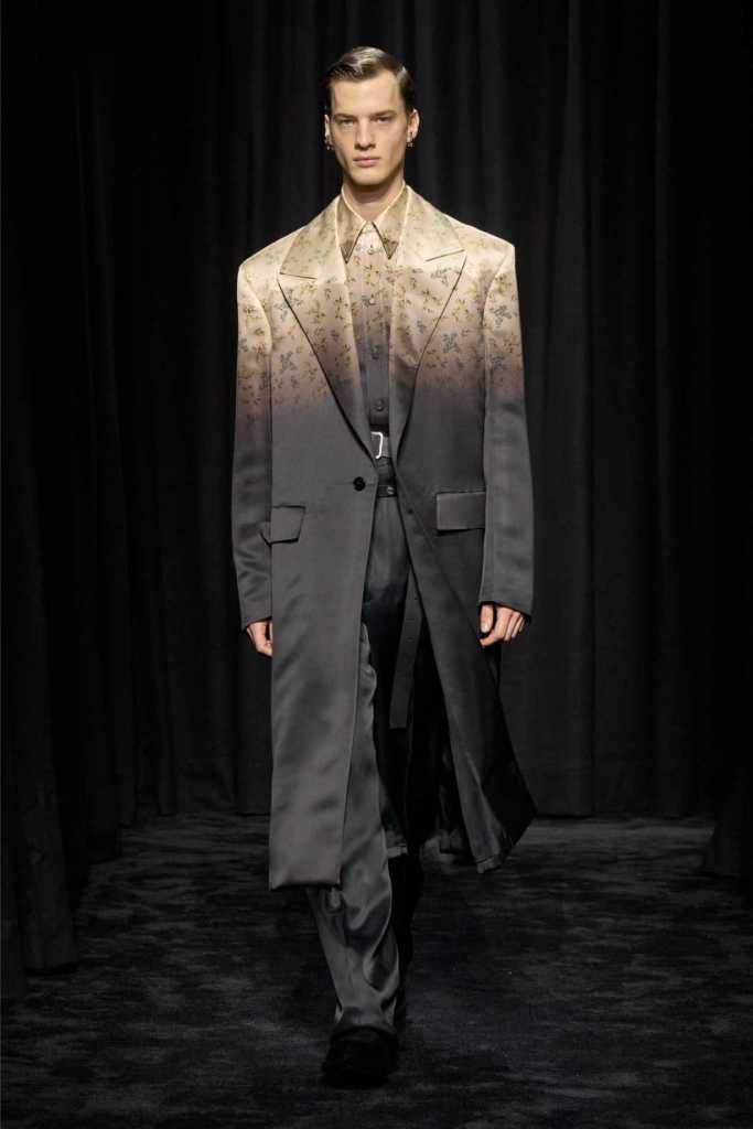 Despite the heavy, punk-infused aesthetic, glimpses of softness shone through. Delicate floral-print silks, dip-dyed from bright yellow to black, added an almost poetic contrast to the tougher elements. A short-sleeved A-line dress in this fabric was particularly memorable—an unconventional yet striking choice for a black-tie event. Meanwhile, a turquoise fur coat and a blush-pink satin jacket injected just the right amount of playfulness into an otherwise sombre palette.