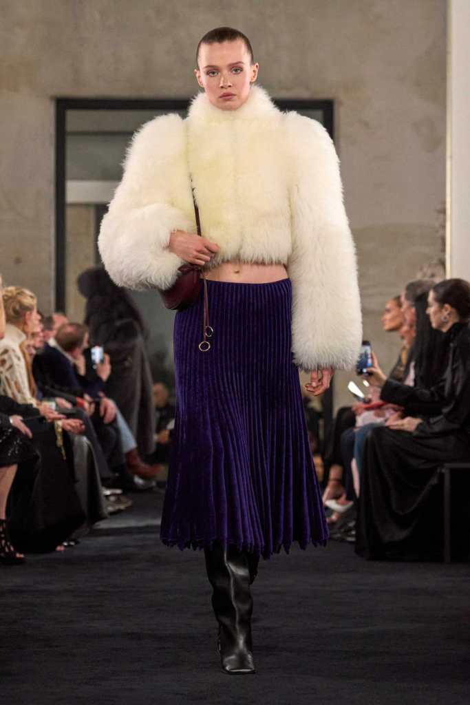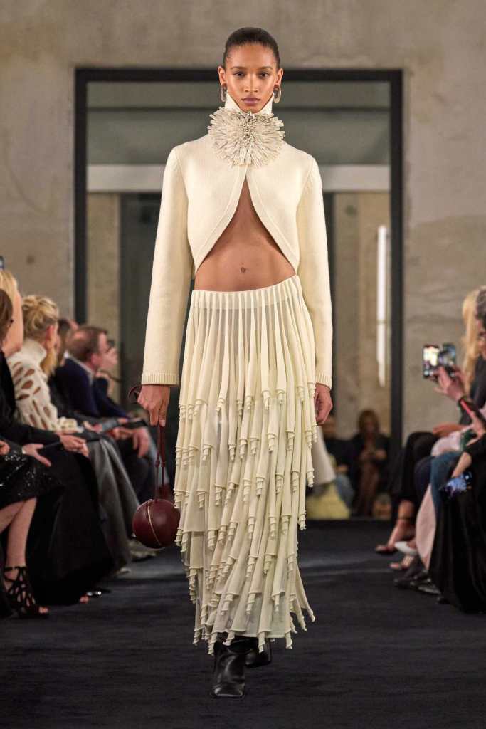 One of the standout design elements was the use of padded rolls that encircled hips, shoulders, and faces, creating shapes that were both protective and empowering. The craftsmanship on display was nothing short of masterful—pleated skirts floated weightlessly, intricate knitwear wrapped the body seamlessly, and sculpted coats exuded a regal presence.