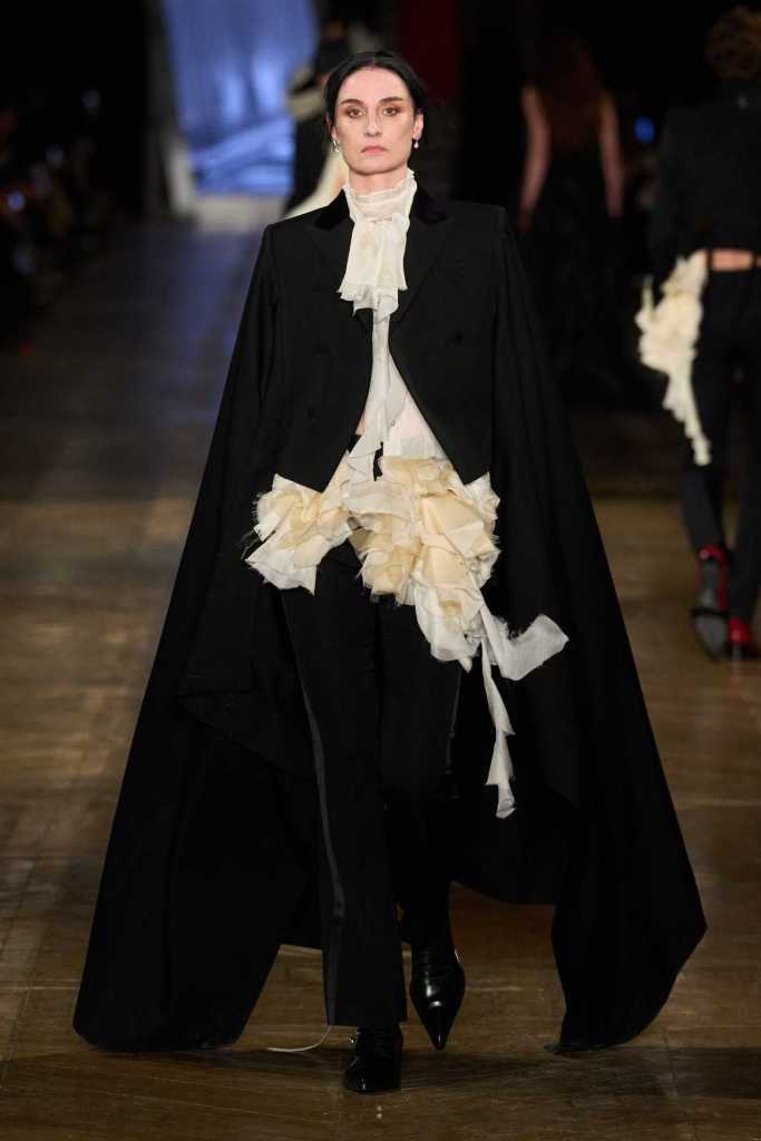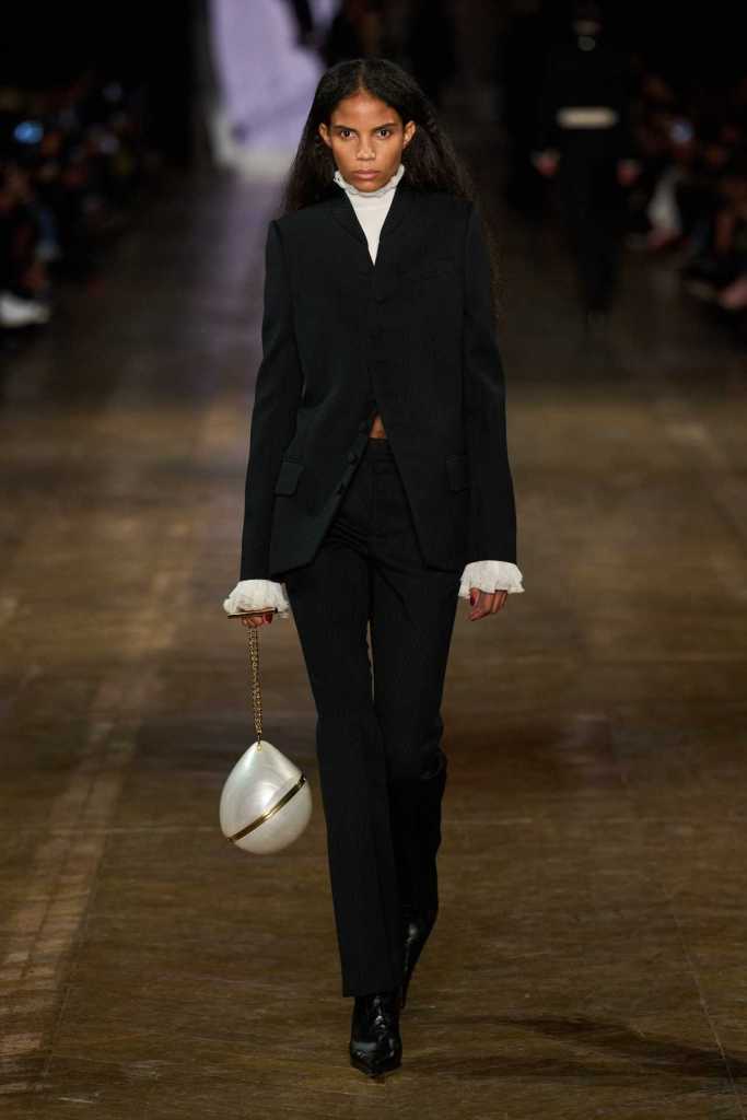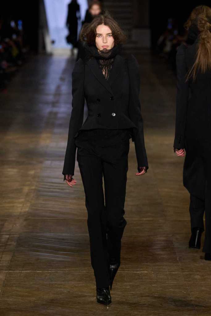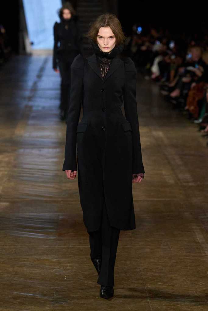 From the very first look, a peak-shouldered coat with lace framing the face, it was clear that McGirr was leaning into the house’s signature sharp tailoring. Suits took center stage early in the show, with high armholes and corseted silhouettes giving a nod to Victorian-era structure while maintaining a modern edge.
