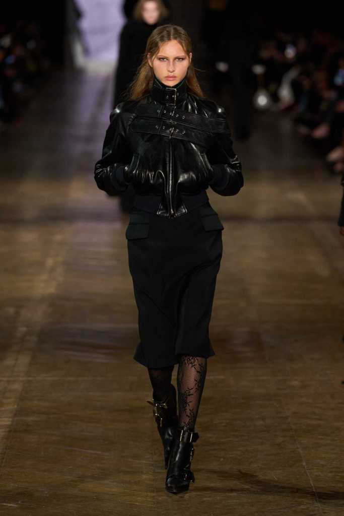 One of the collection’s most striking elements was texture. Shearling was pieced together in short evening jackets, forming patterns that looked almost like angel wings as the models moved. Elsewhere, leather and wool cashmere were paired with delicate lace, creating a contrast between hard and soft. Even McQueen’s iconic skull motif made an appearance, appearing on scarves, blouses, and tights.