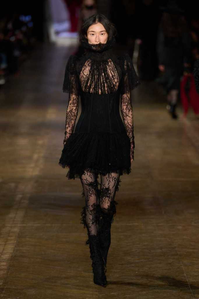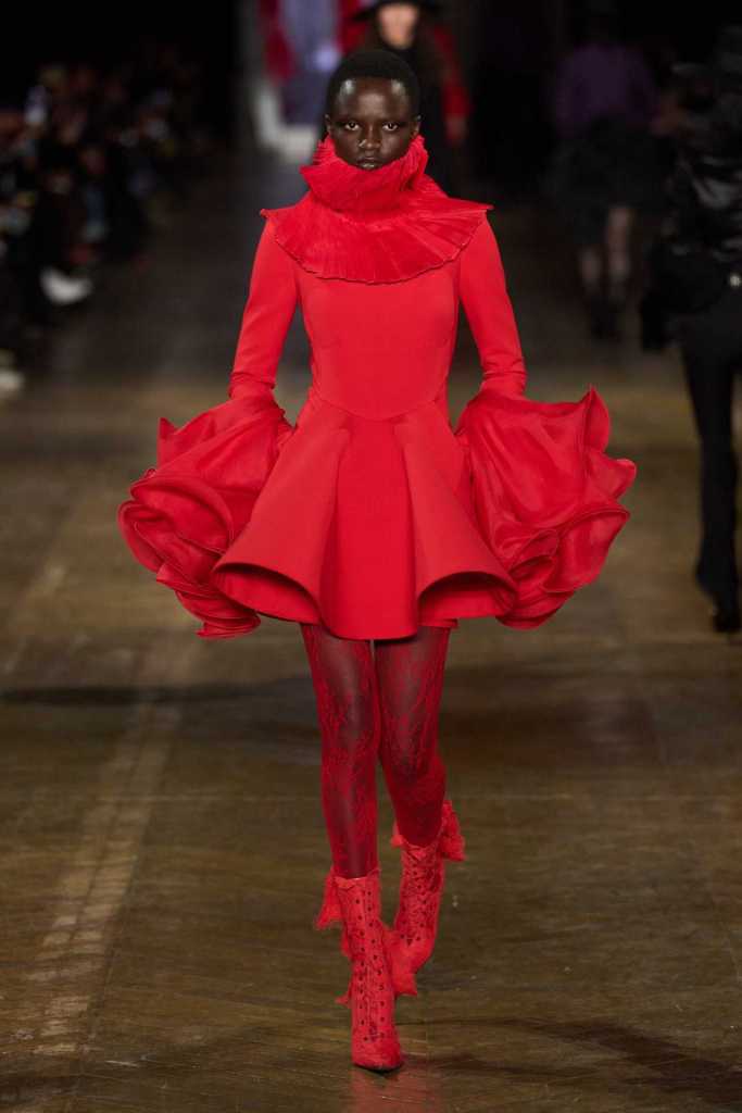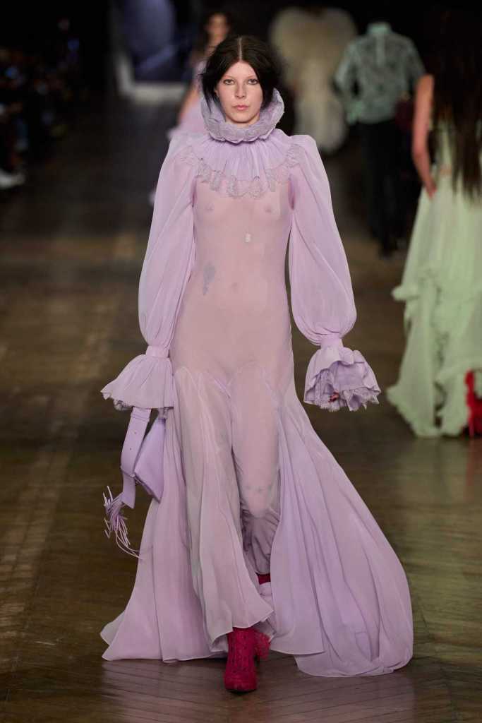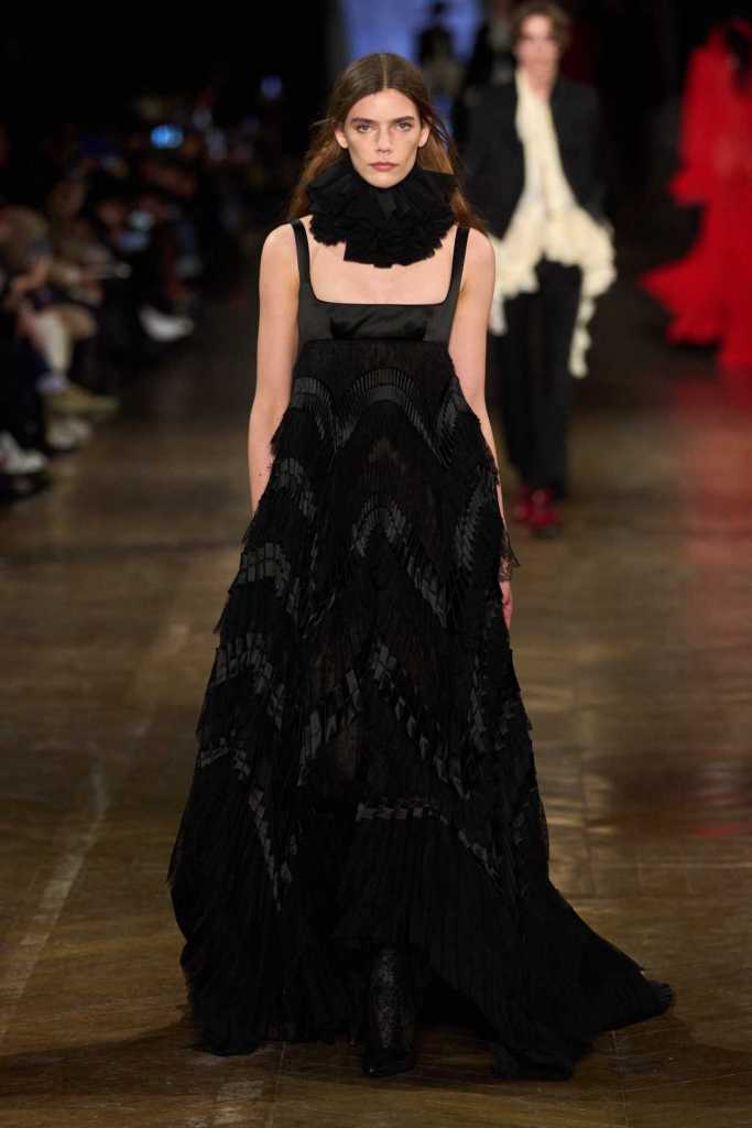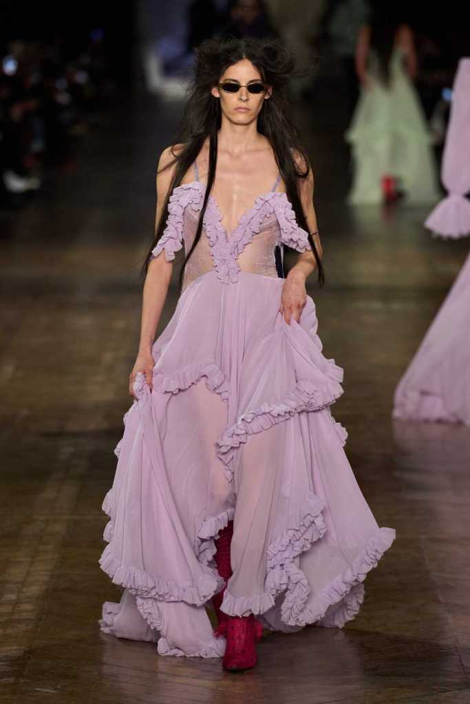 The true showstoppers, however, were the eveningwear pieces. Flowing silk dresses in deep jewel tones—reds, magentas, and lavenders—moved fluidly down the runway, each one featuring dramatic details like ruffles, sheer overlays, or built-in corsetry. A black lace maxi dress, sheer and adorned with intricate embroidery, felt like a direct tribute to the gothic sensibilities McQueen is known for. Meanwhile, a raspberry chiffon gown played up volume with sculptural sleeves, adding a romantic touch to an otherwise darkly elegant collection.