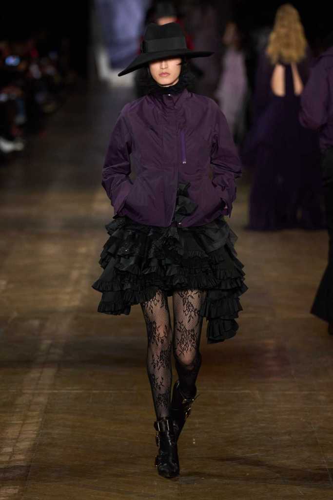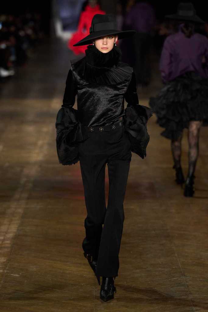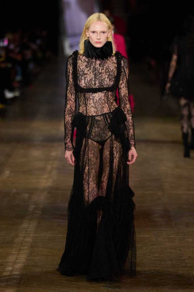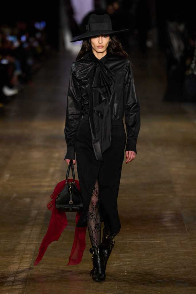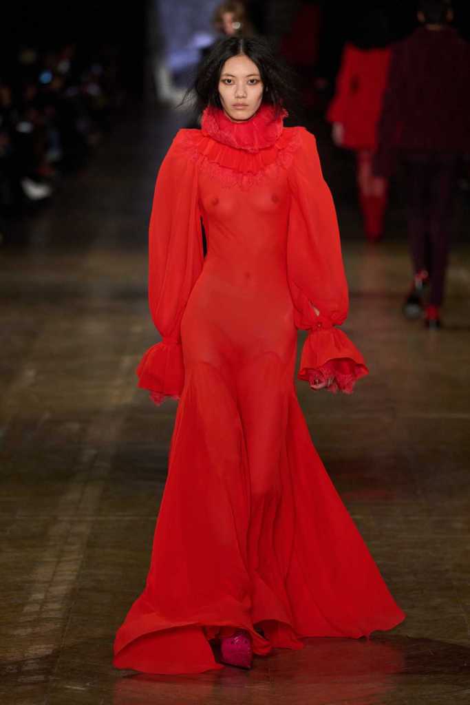 The true showstoppers, however, were the eveningwear pieces. Flowing silk dresses in deep jewel tones—reds, magentas, and lavenders—moved fluidly down the runway, each one featuring dramatic details like ruffles, sheer overlays, or built-in corsetry. A black lace maxi dress, sheer and adorned with intricate embroidery, felt like a direct tribute to the gothic sensibilities McQueen is known for. Meanwhile, a raspberry chiffon gown played up volume with sculptural sleeves, adding a romantic touch to an otherwise darkly elegant collection.