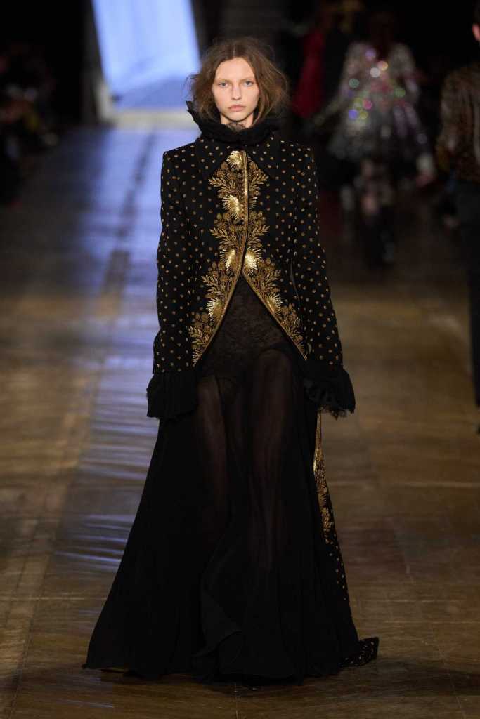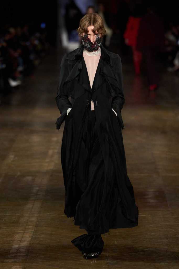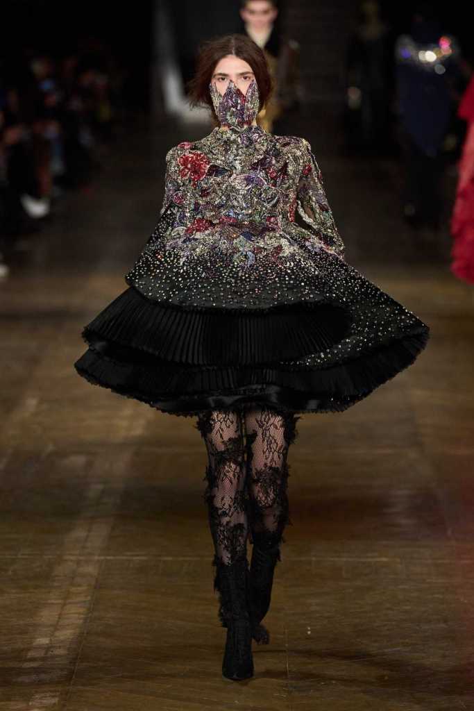 Philip Treacy’s sculptural hats gave a theatrical twist to certain looks, while gold bullion embroidery, seen on both cloaks and fitted bombers, added a layer of regal opulence. Crystal-encrusted face masks, created in collaboration with young designers from the Sarabande Foundation, gave an avant-garde feel to an already maximalist lineup.