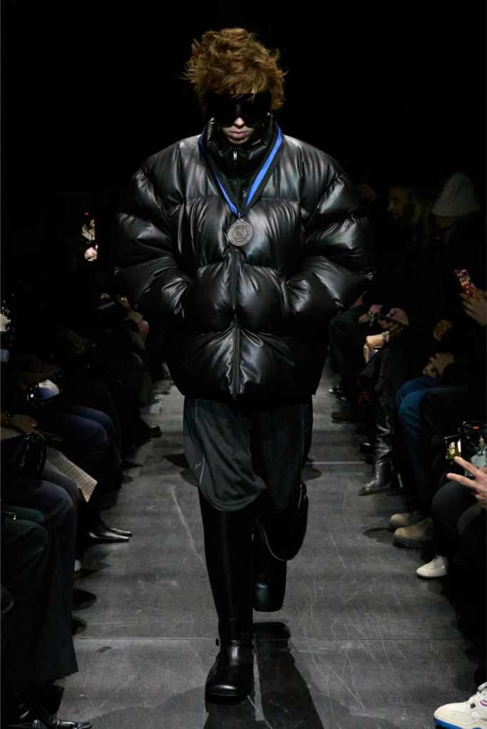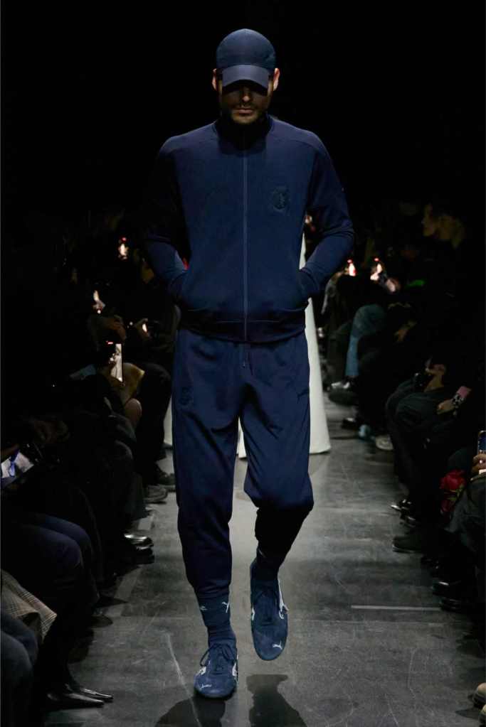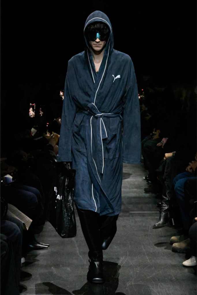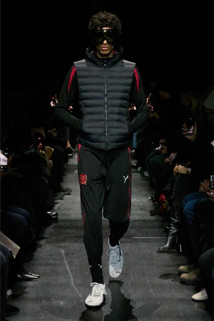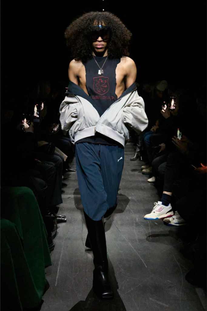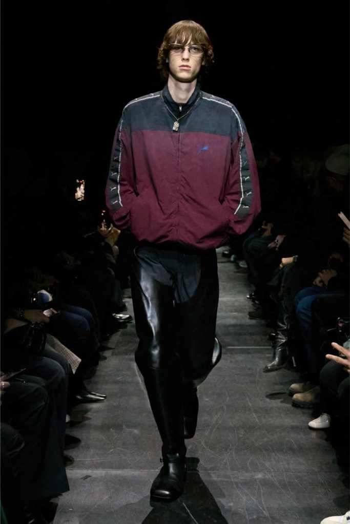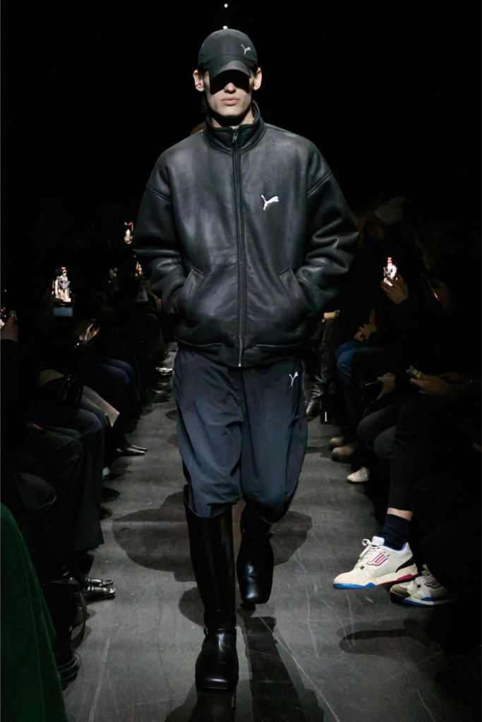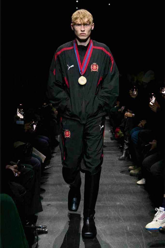 I forced myself to sit through this show, not out of excitement but obligation. And while there were moments that hinted at a shift—narrowed silhouettes, sharper tailoring, a subdued staging—it wasn’t enough to make it feel fresh. The corporate suiting, intentionally wrinkled and moth-eaten, read more like a costume than an evolution of Balenciaga’s codes. The Puma collaboration, complete with gold medals and skinny tracksuits, felt like a weak attempt to inject something new into the mix, but instead, it just underscored how formulaic this all was.