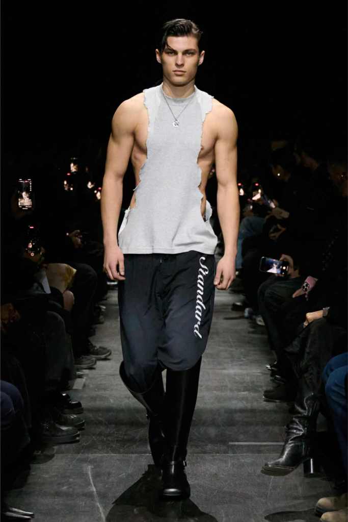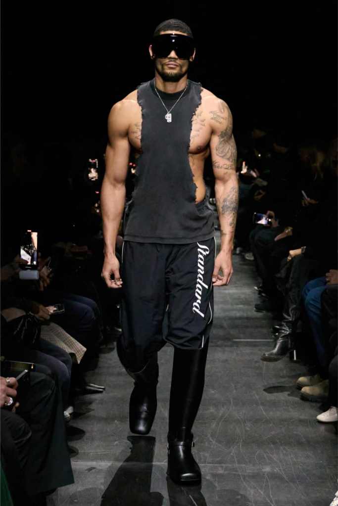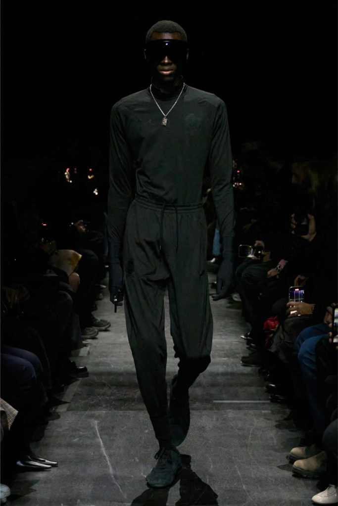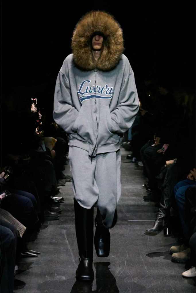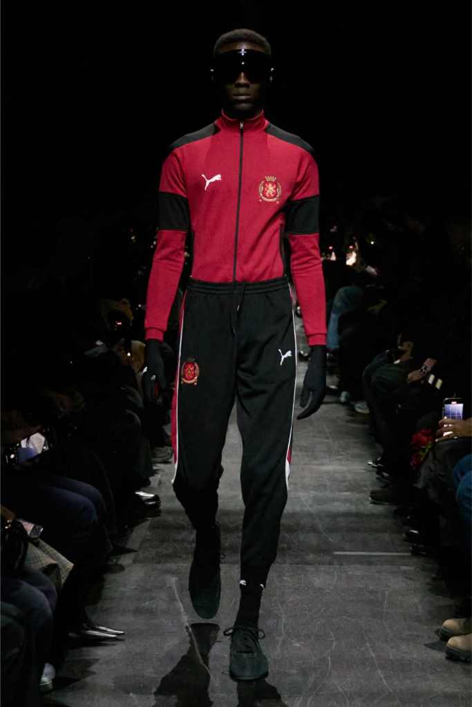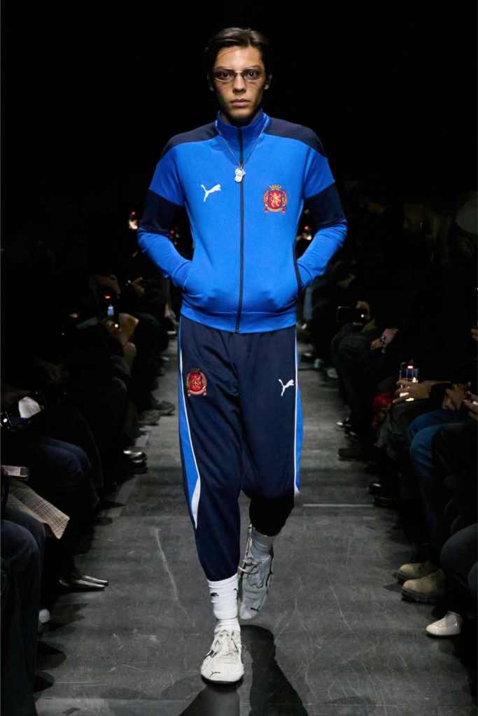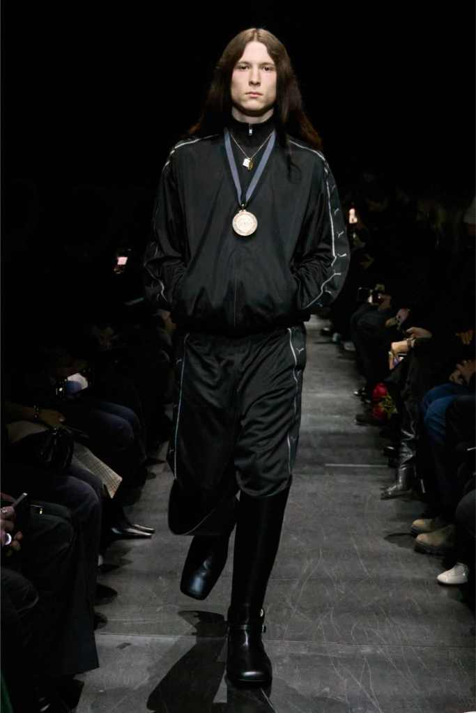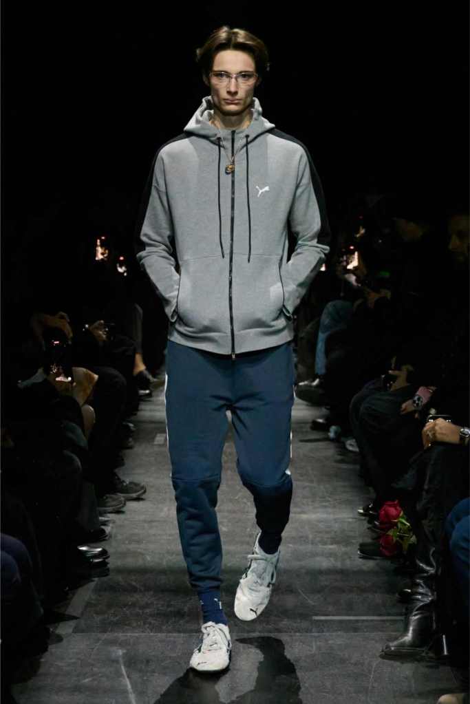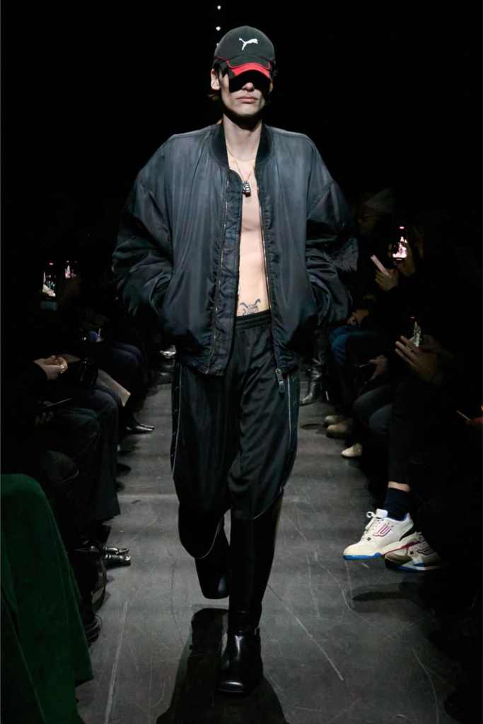 I forced myself to sit through this show, not out of excitement but obligation. And while there were moments that hinted at a shift—narrowed silhouettes, sharper tailoring, a subdued staging—it wasn’t enough to make it feel fresh. The corporate suiting, intentionally wrinkled and moth-eaten, read more like a costume than an evolution of Balenciaga’s codes. The Puma collaboration, complete with gold medals and skinny tracksuits, felt like a weak attempt to inject something new into the mix, but instead, it just underscored how formulaic this all was.