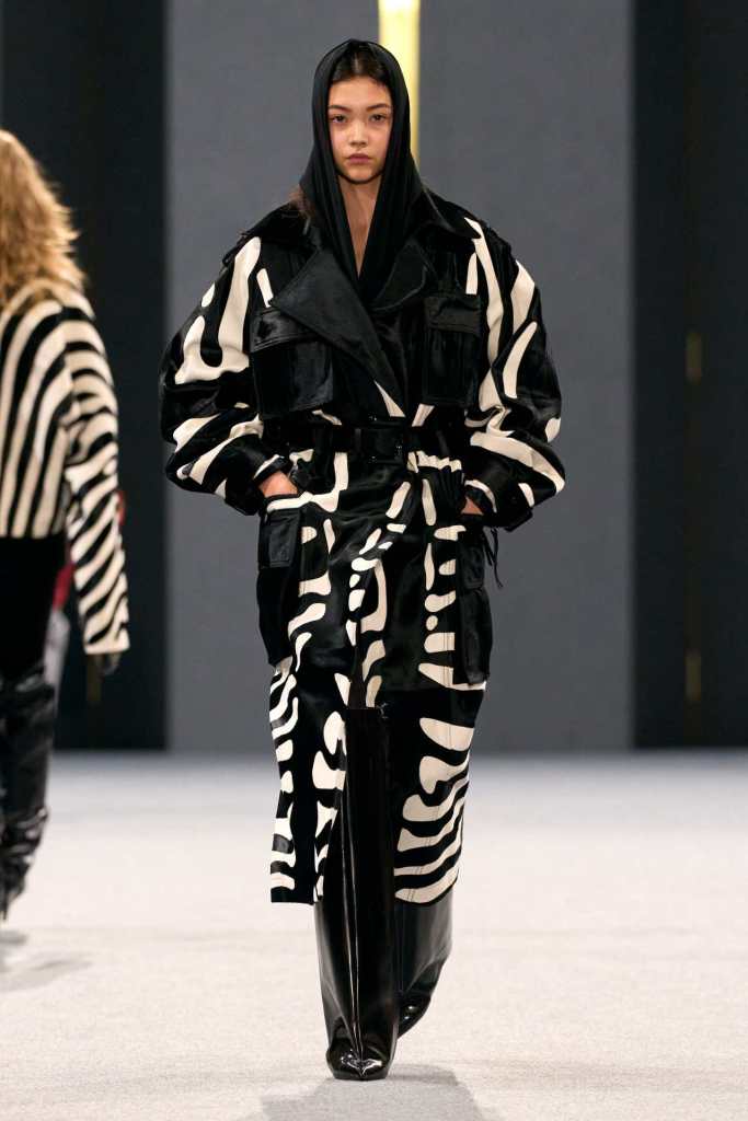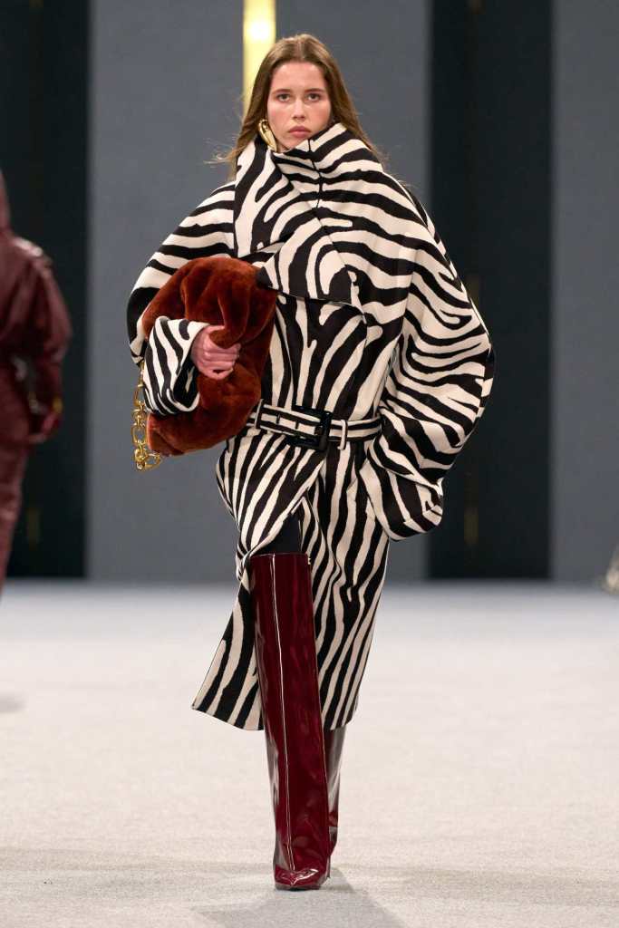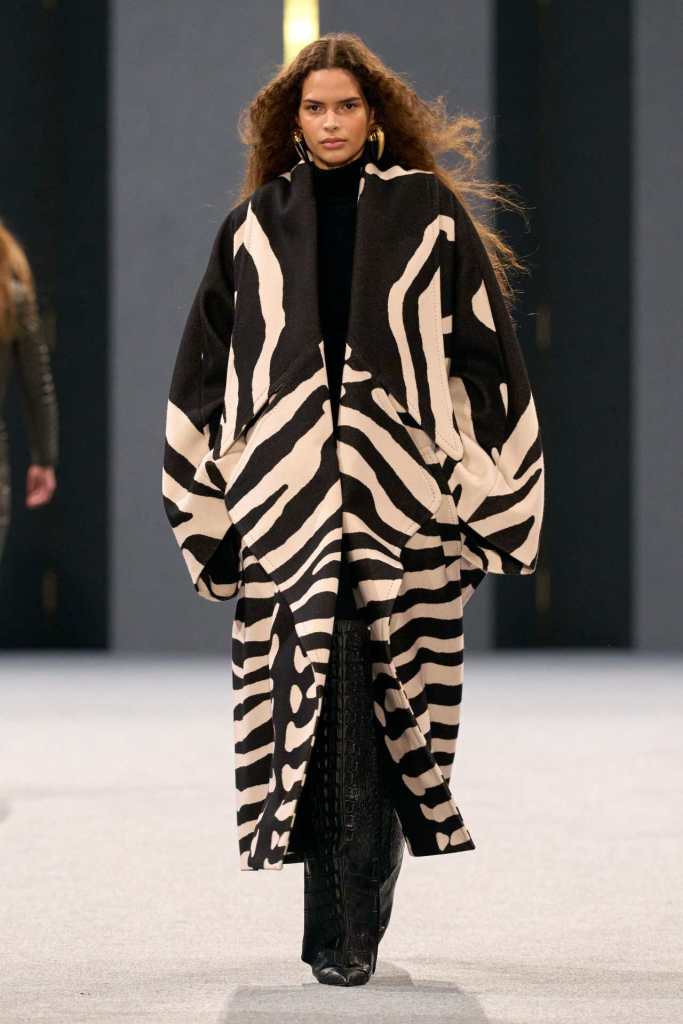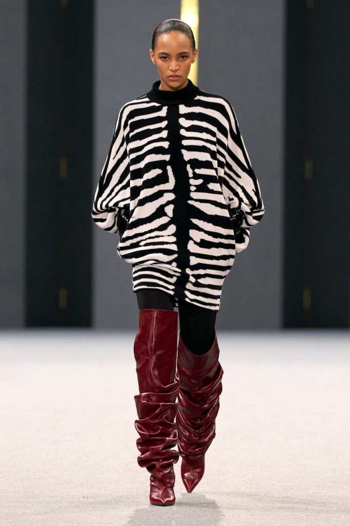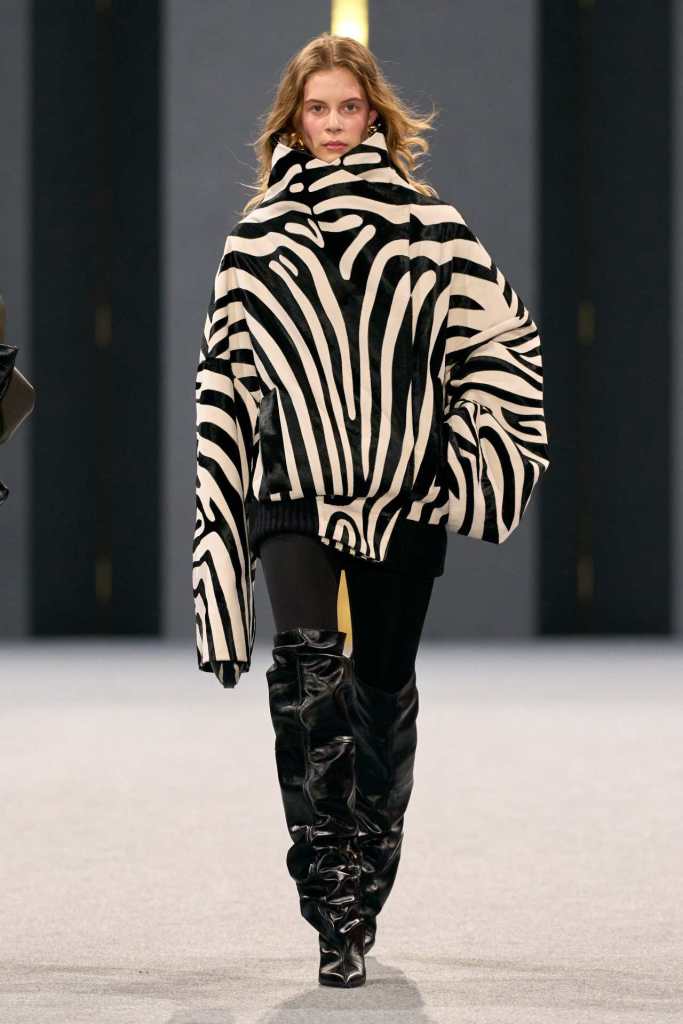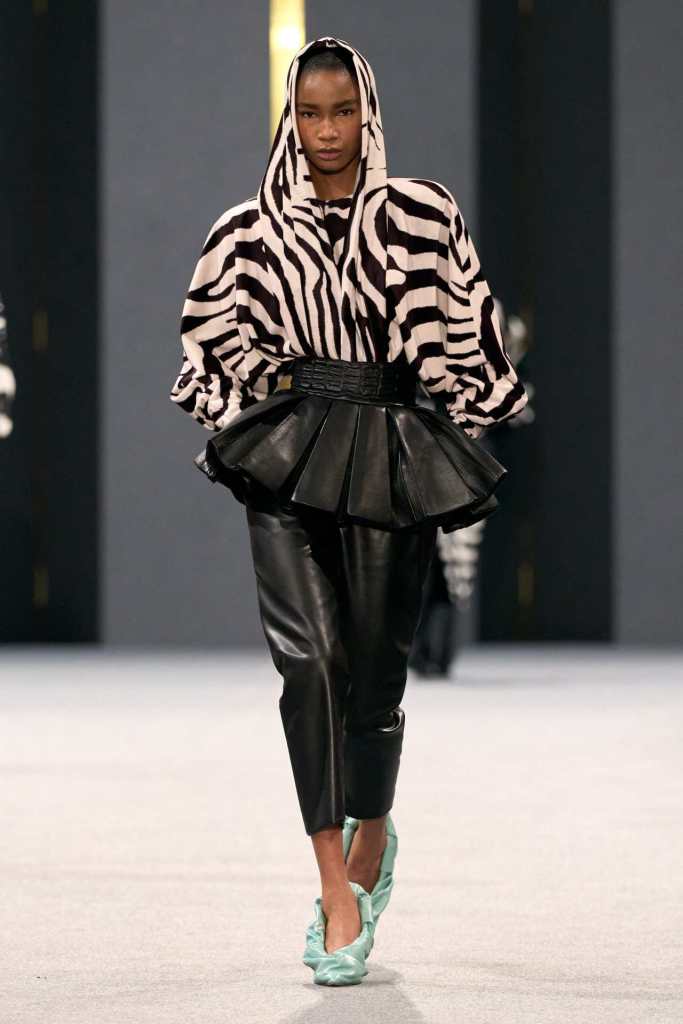 But make no mistake—Rousteing’s touch was still present. While he swapped out his go-to gold bullion for muted grays and soft textures, the drama was still there in the form of exaggerated proportions. Think sculptural coats with oversized lapels, thigh-high scrunched boots, and zebra patterns that added a fierce touch to an otherwise relaxed lineup. Even the peplums, a throwback to Balmain’s history, made a reappearance, but in a way that felt fresh rather than nostalgic.