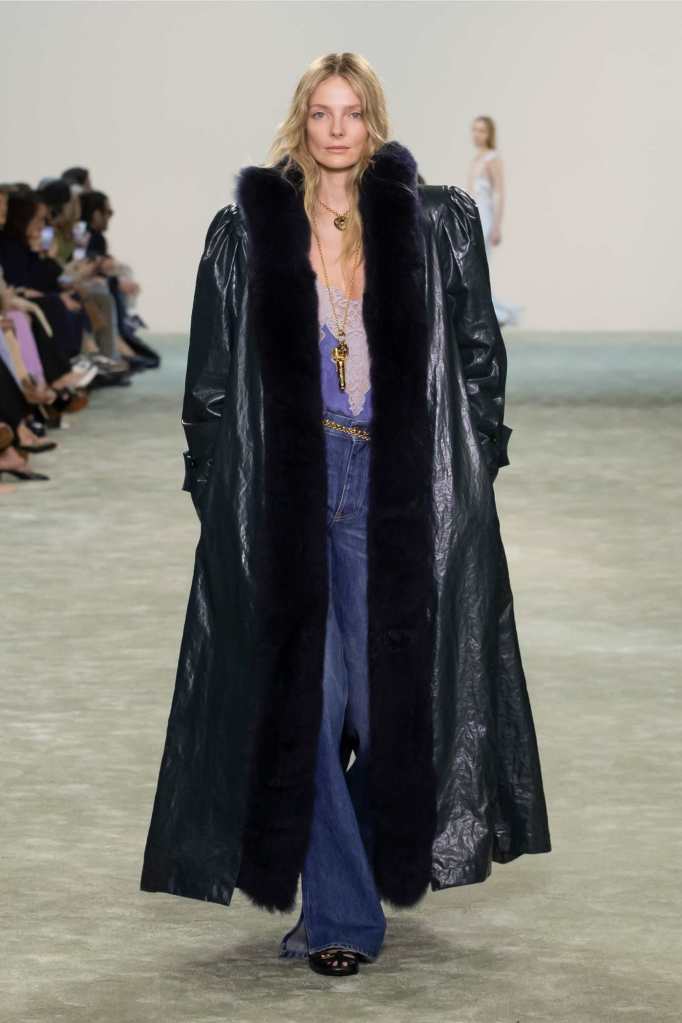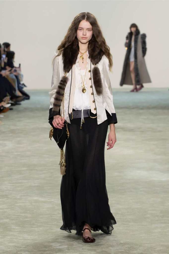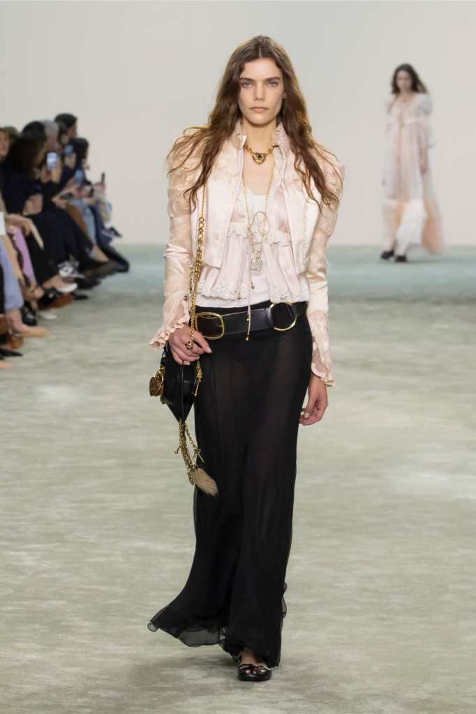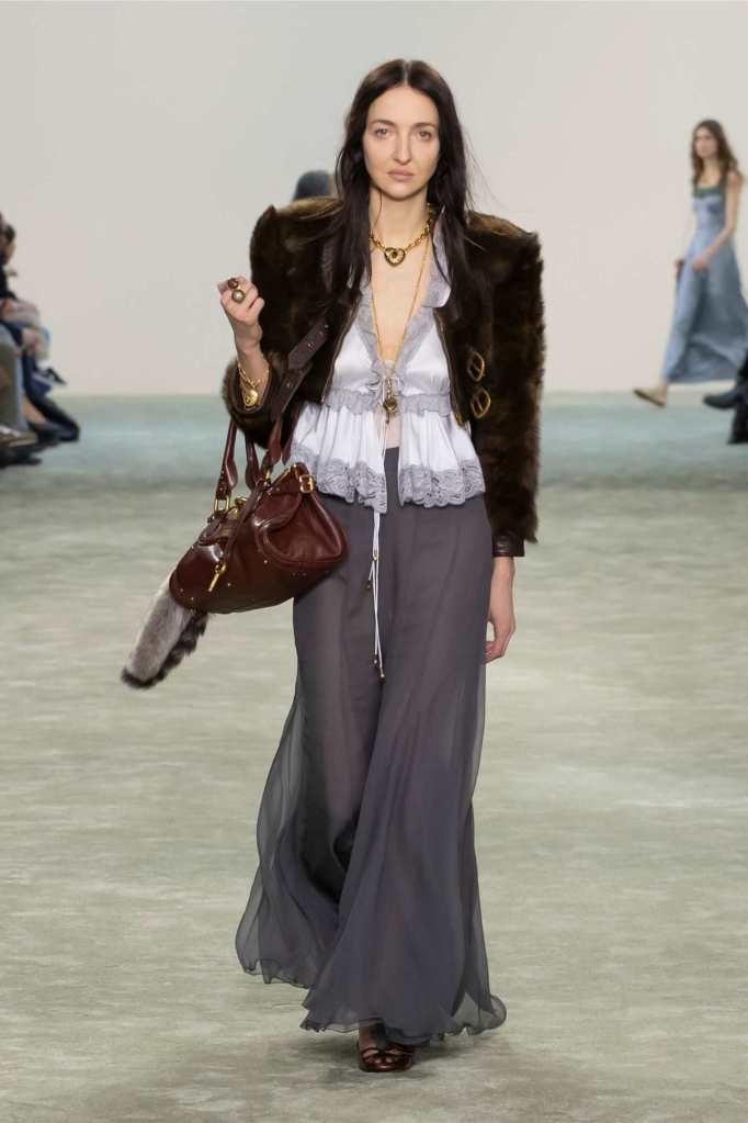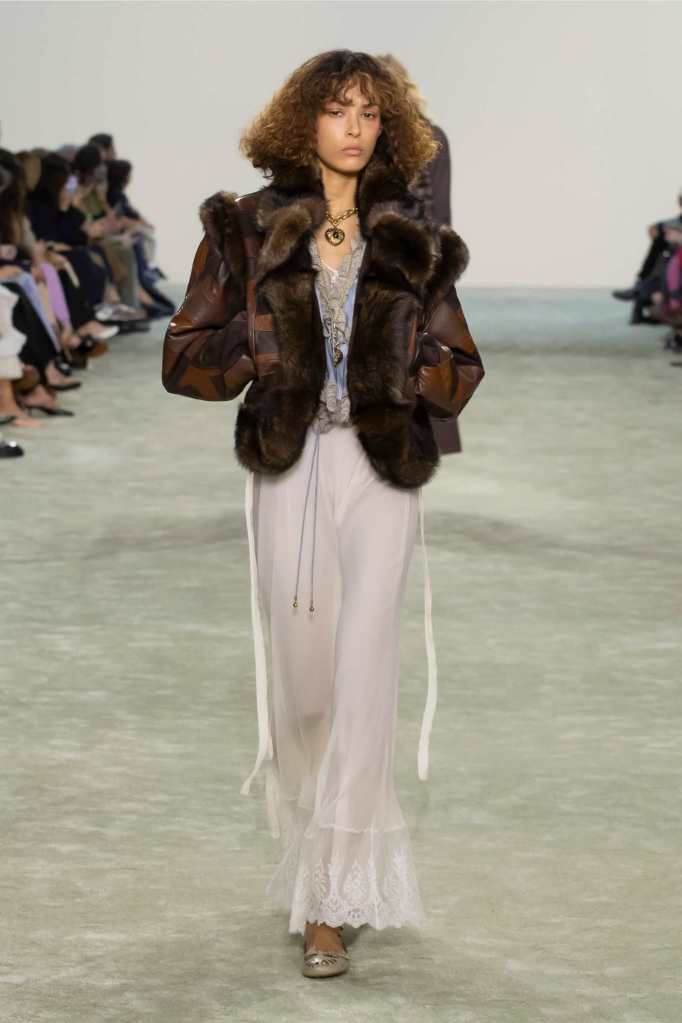 The collection was rich with the dreamy, feminine details Chloé is known for—billowy blouses, flowing lace gowns, and tiered maxi skirts. However, Kamali contrasted these soft elements with more structured tailoring. Oversized quilted coats with fur trim, high-waisted leather pants, and exaggerated shoulders on silk blouses gave the collection a sense of strength. It was Chloé’s version of power dressing: effortless, a little undone, but undeniably confident.