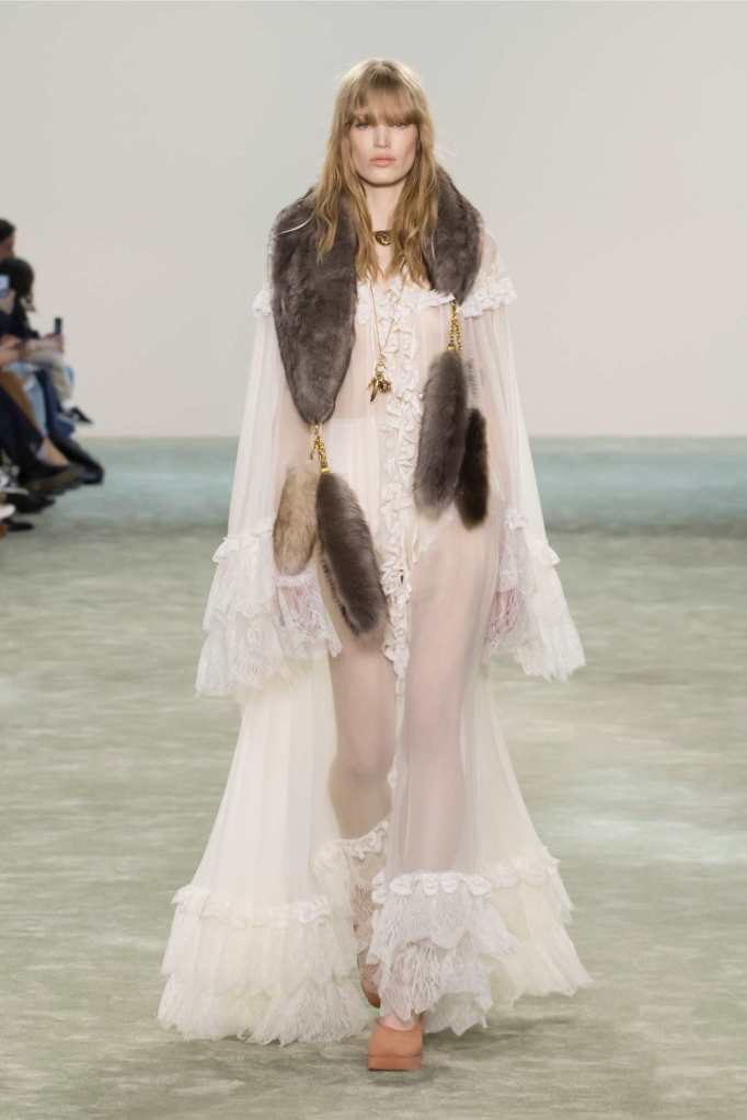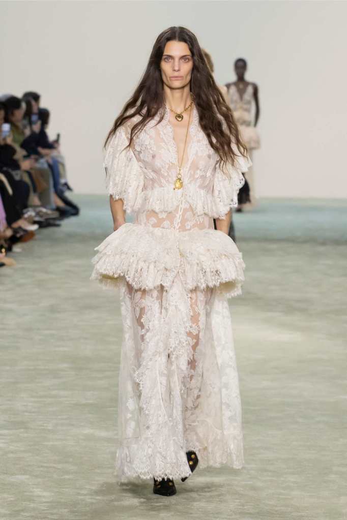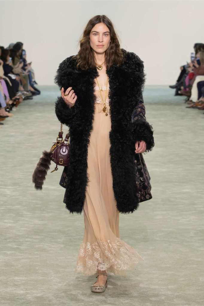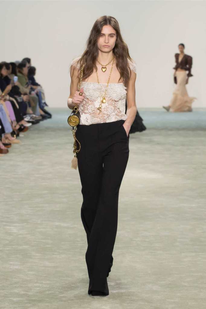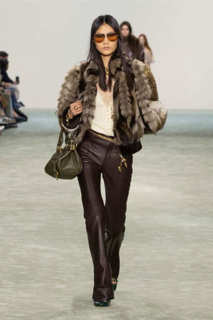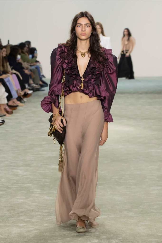 The collection was rich with the dreamy, feminine details Chloé is known for—billowy blouses, flowing lace gowns, and tiered maxi skirts. However, Kamali contrasted these soft elements with more structured tailoring. Oversized quilted coats with fur trim, high-waisted leather pants, and exaggerated shoulders on silk blouses gave the collection a sense of strength. It was Chloé’s version of power dressing: effortless, a little undone, but undeniably confident.