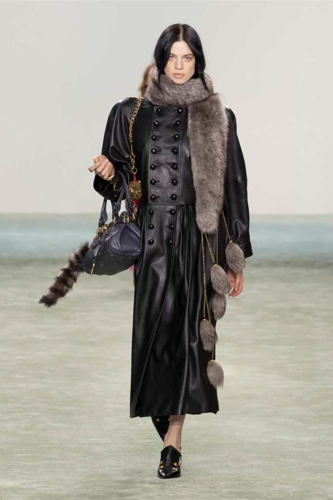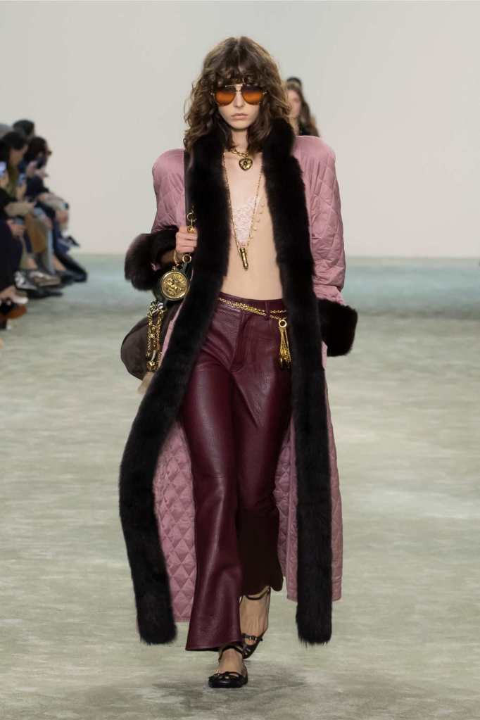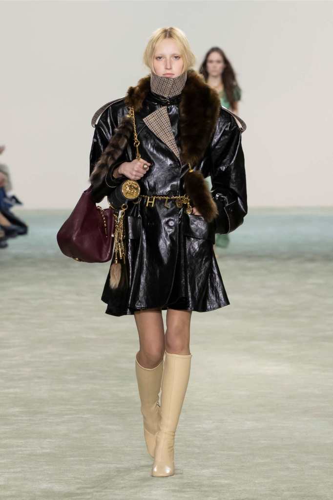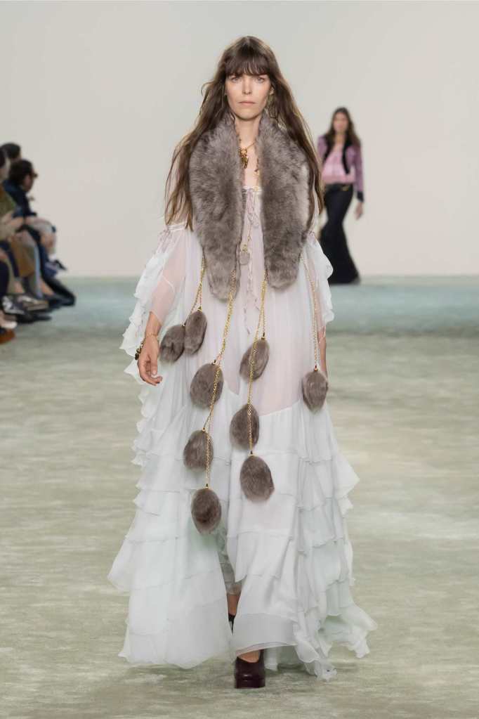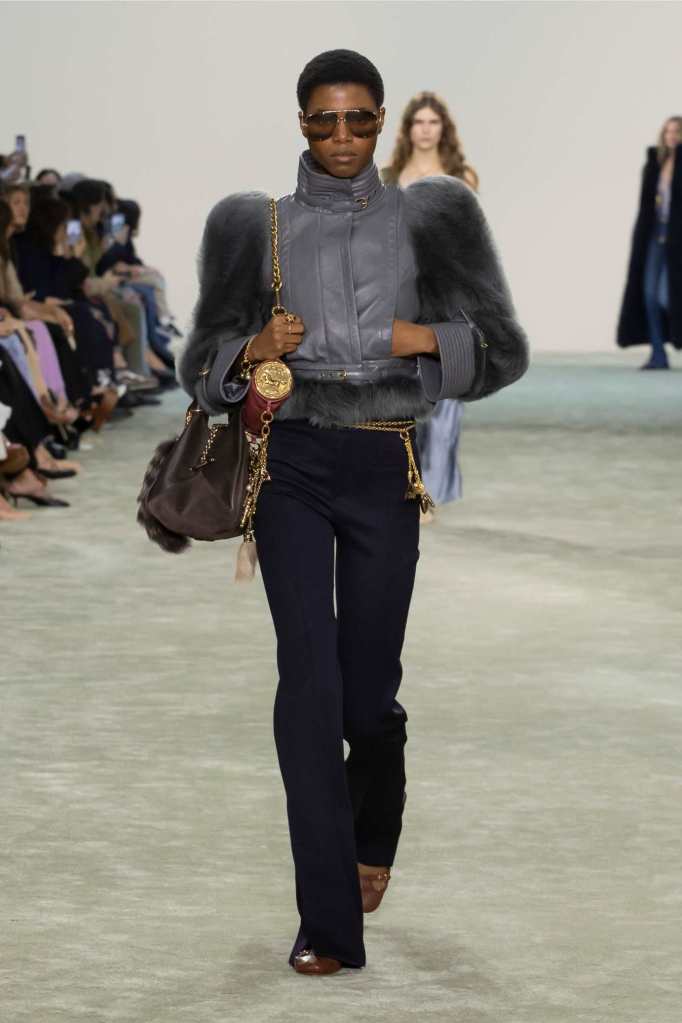 Accessories reinforced this duality. The return of the Paddington bag, a relic of the 2000s, was a nod to the past, while playful details like faux fur tail charms and oversized logo belts brought a modern irreverence.Meanwhile, layered chain necklaces and oversized earrings nodded to the bohemian layering of past decades.