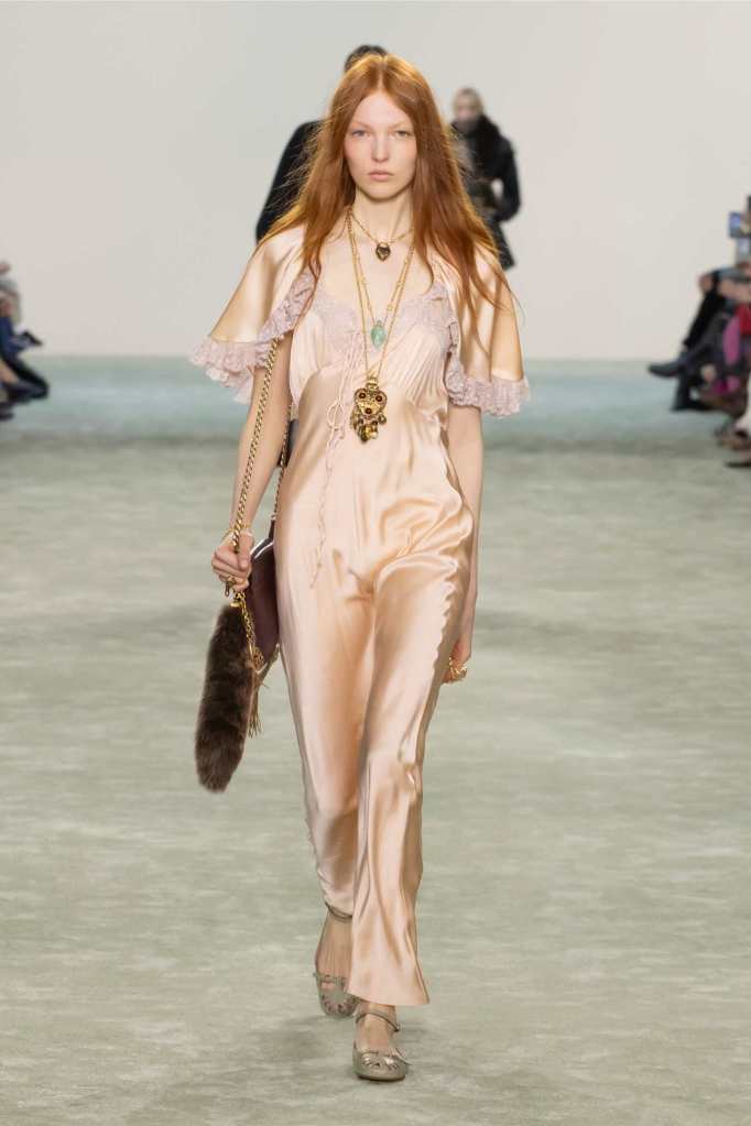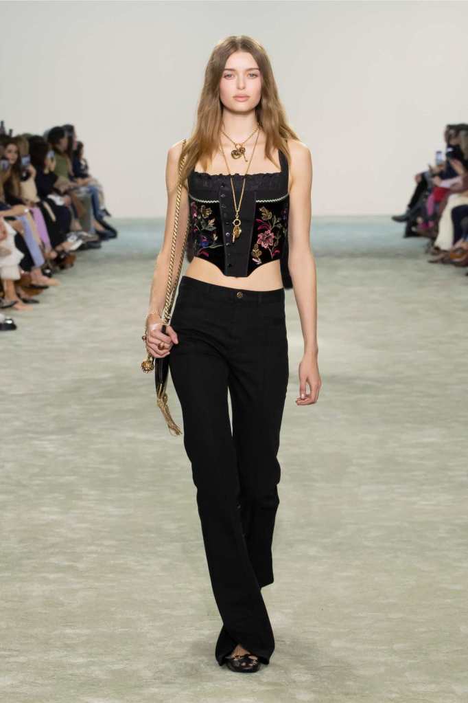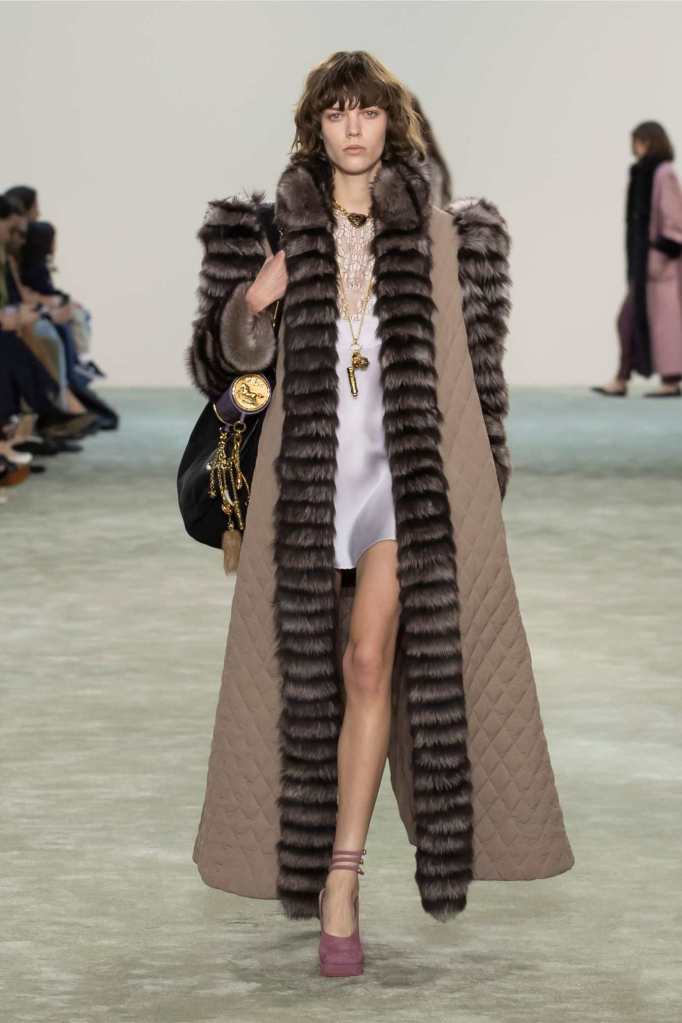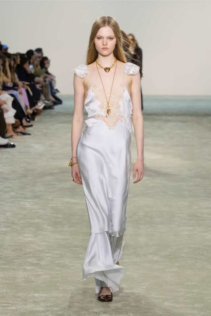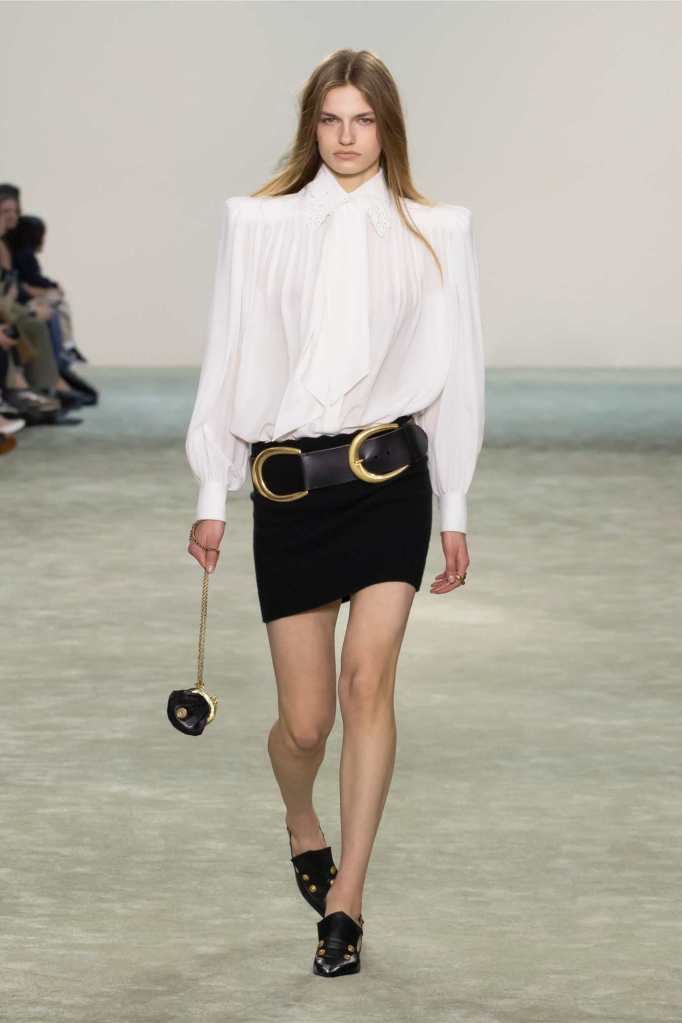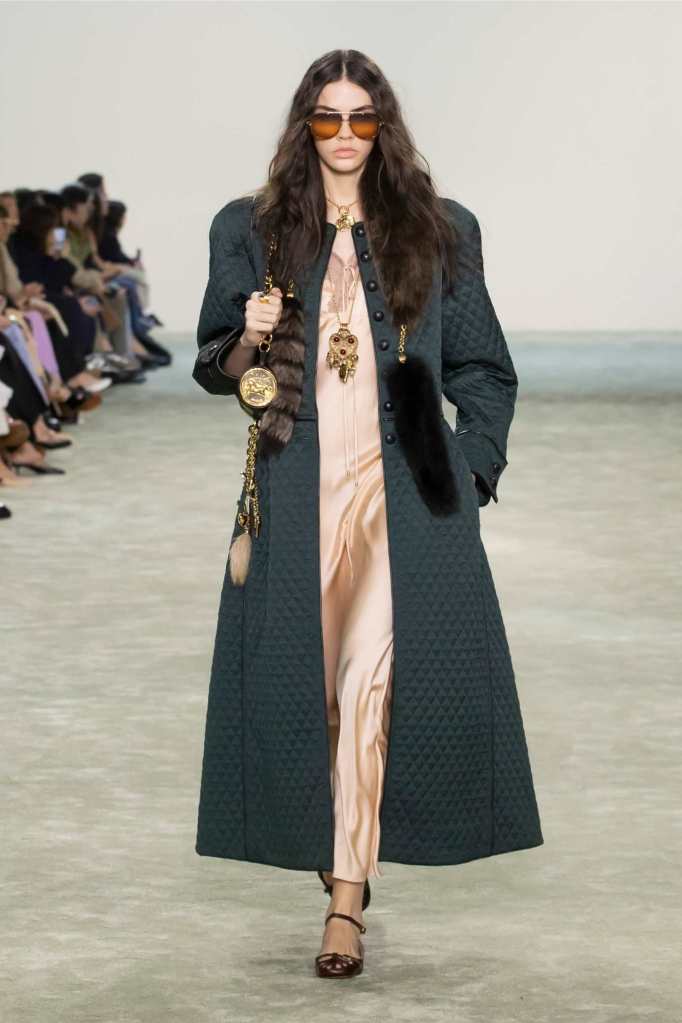 Accessories reinforced this duality. The return of the Paddington bag, a relic of the 2000s, was a nod to the past, while playful details like faux fur tail charms and oversized logo belts brought a modern irreverence.Meanwhile, layered chain necklaces and oversized earrings nodded to the bohemian layering of past decades.
