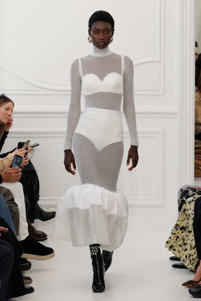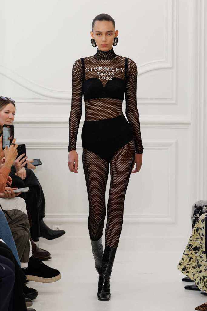 The show opened with a statement: a black fishnet catsuit, subtly stamped with the Givenchy name and year of its founding. From there, Burton introduced her vision through sculpted hourglass coats, dramatic jackets, and geometric baby doll dresses. Her expertise in tailoring was unmistakable, with jackets featuring spiraling seams that twisted around the body and pants that revealed surprising cutouts along the back. There was a sharpness to the collection, but also a sensuality—bare backs, cinched waists, and flowing trains created a perfect balance.