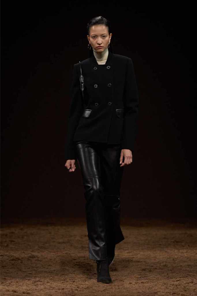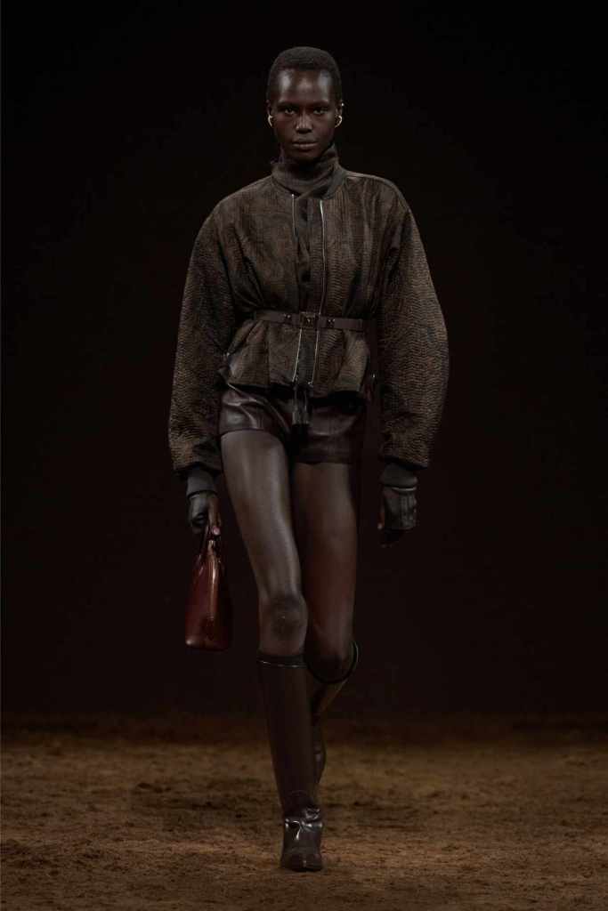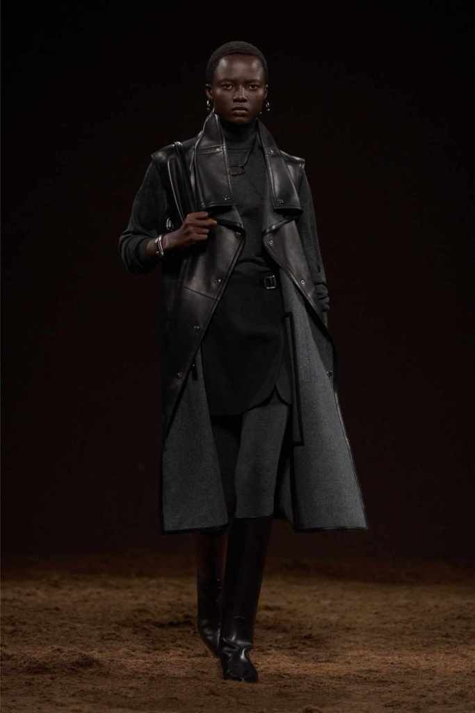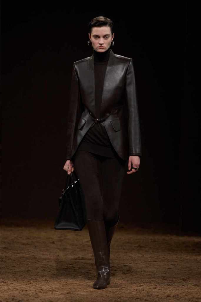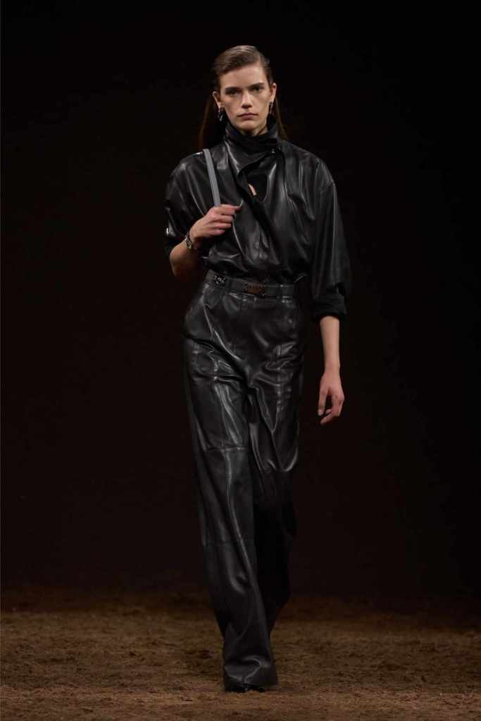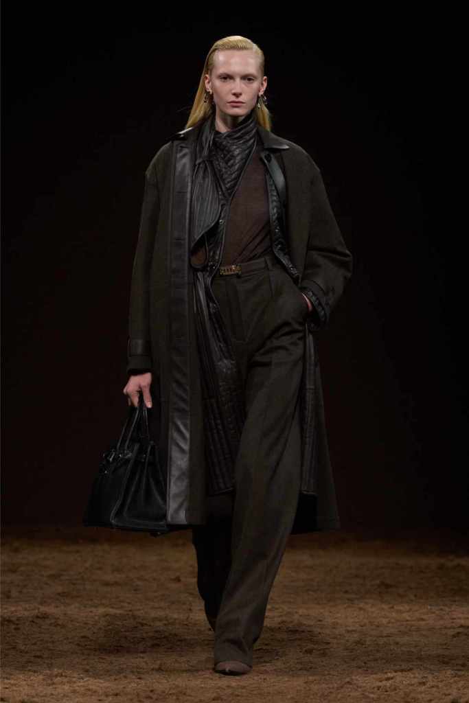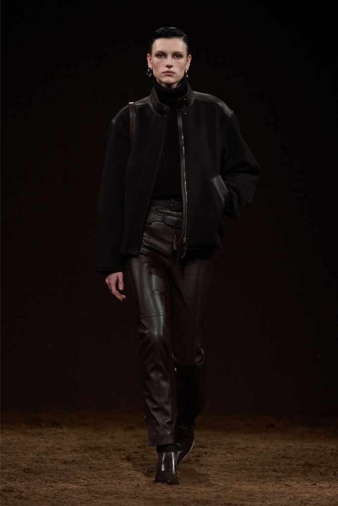 True to Hermès’ legacy, leather took center stage. The silhouettes were sharp yet effortless—high-waisted trousers, quilted vests, and rigid-cut blazers all emphasized precision tailoring. The dominant black palette, spanning deep charcoal to jet black, was punctuated by lime green, creamy taupe, and soft browns, reinforcing the brand’s commitment to timeless sophistication.