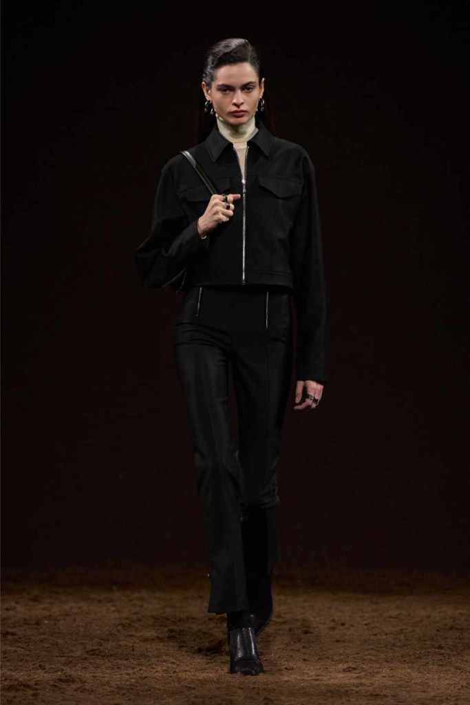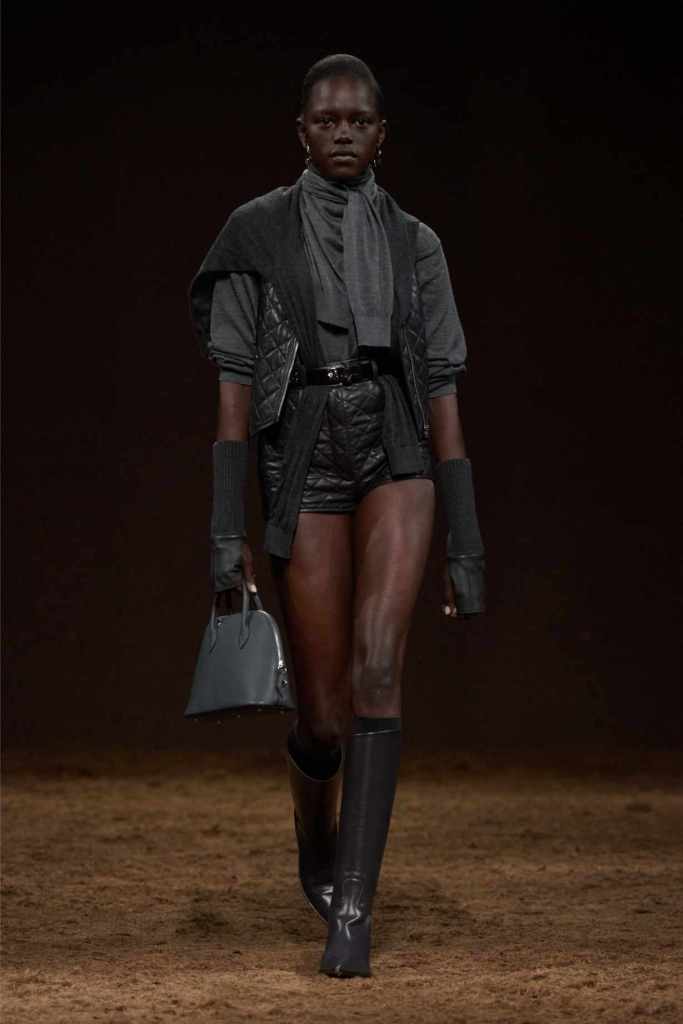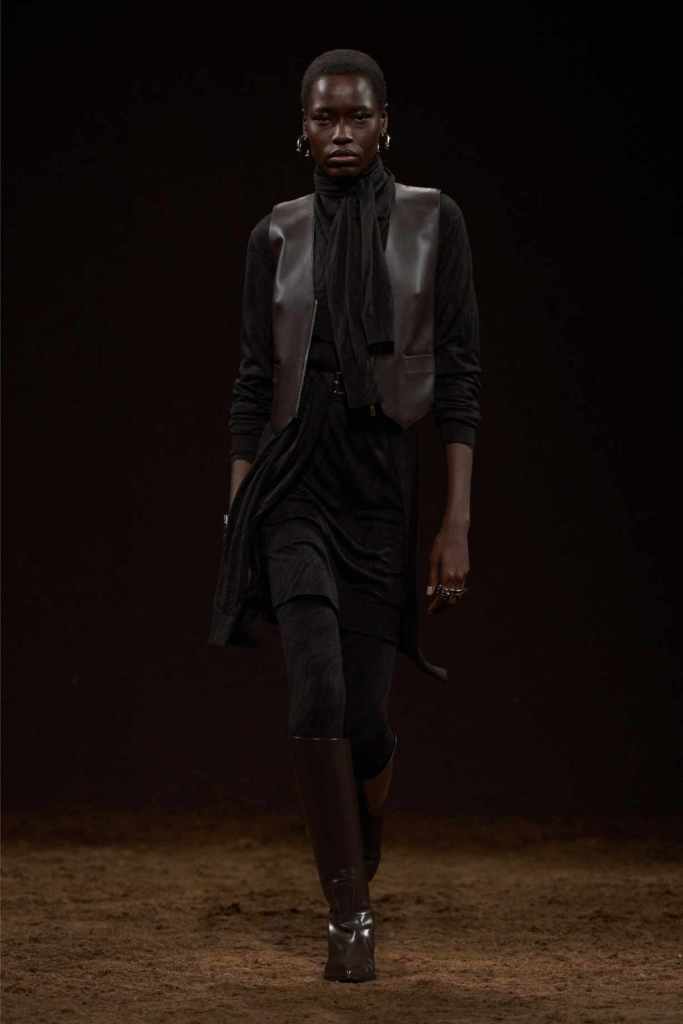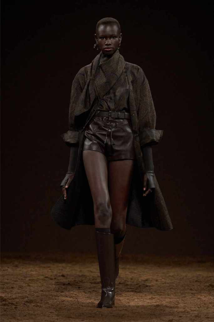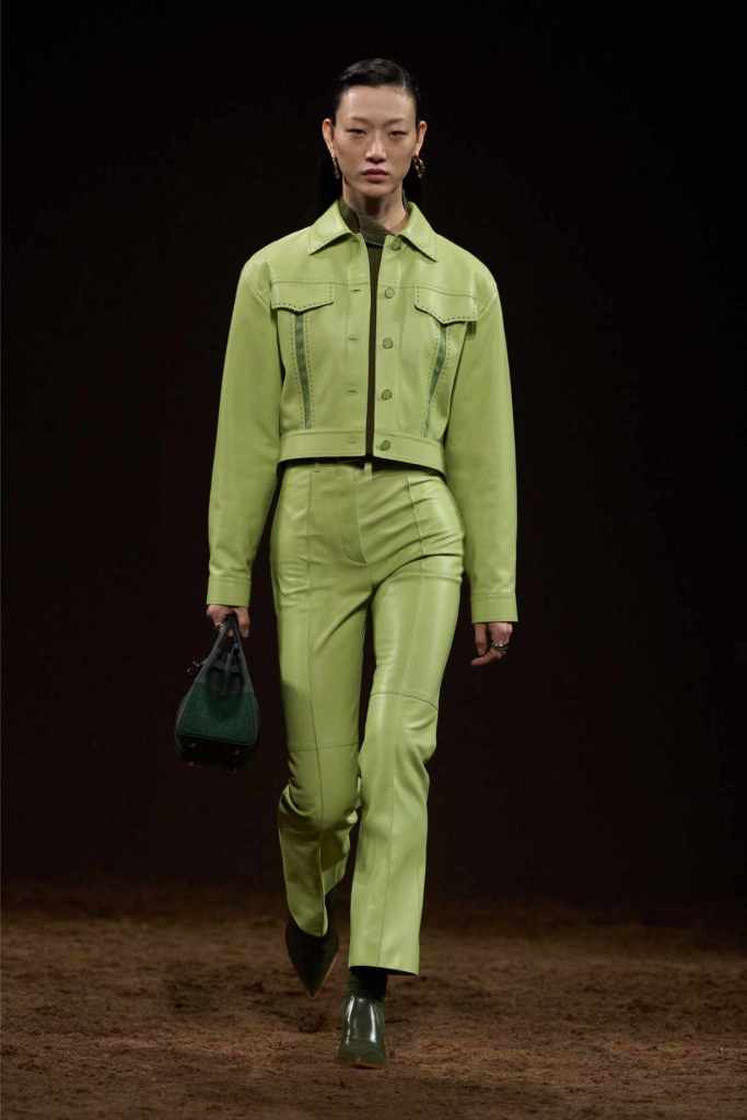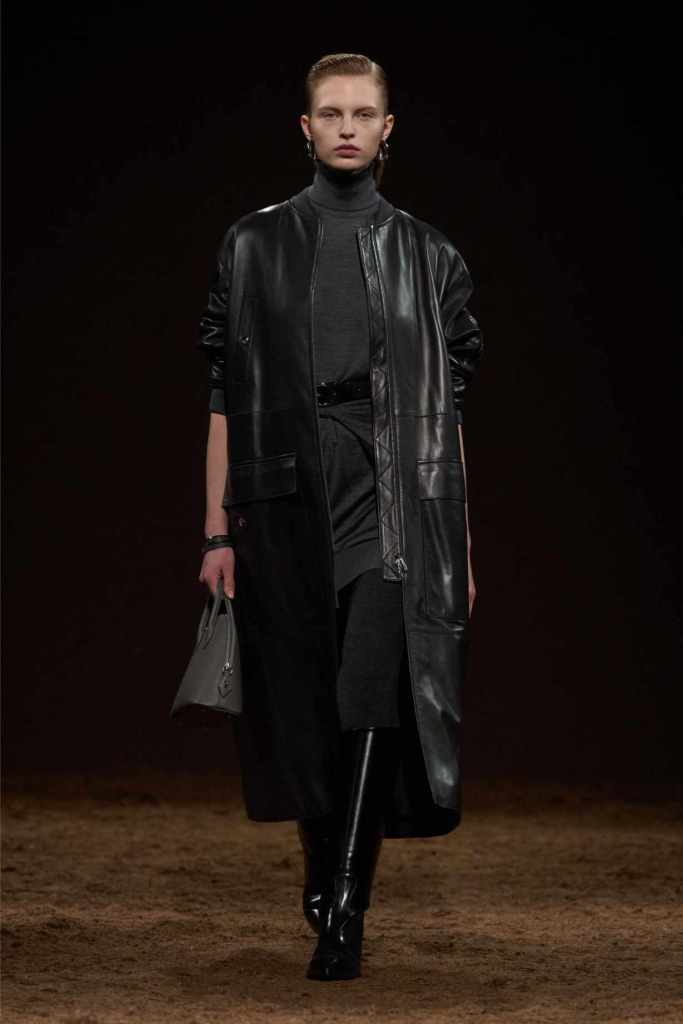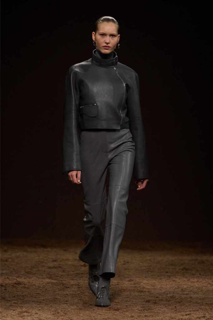 True to Hermès’ legacy, leather took center stage. The silhouettes were sharp yet effortless—high-waisted trousers, quilted vests, and rigid-cut blazers all emphasized precision tailoring. The dominant black palette, spanning deep charcoal to jet black, was punctuated by lime green, creamy taupe, and soft browns, reinforcing the brand’s commitment to timeless sophistication.