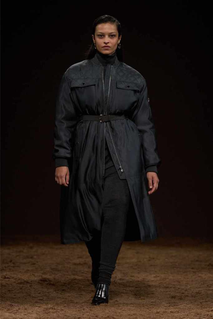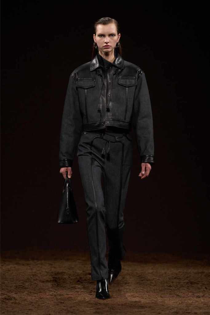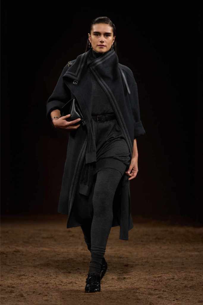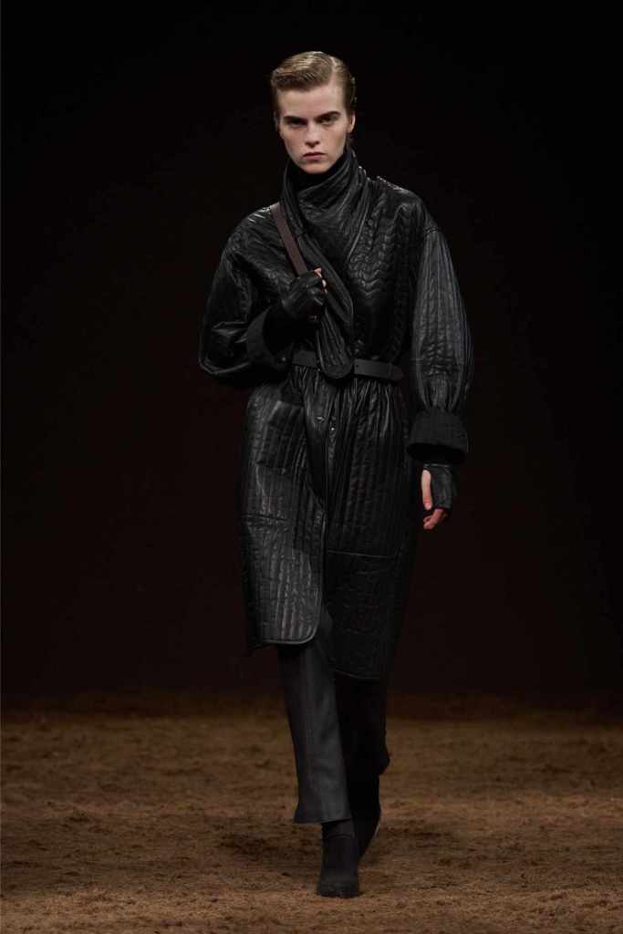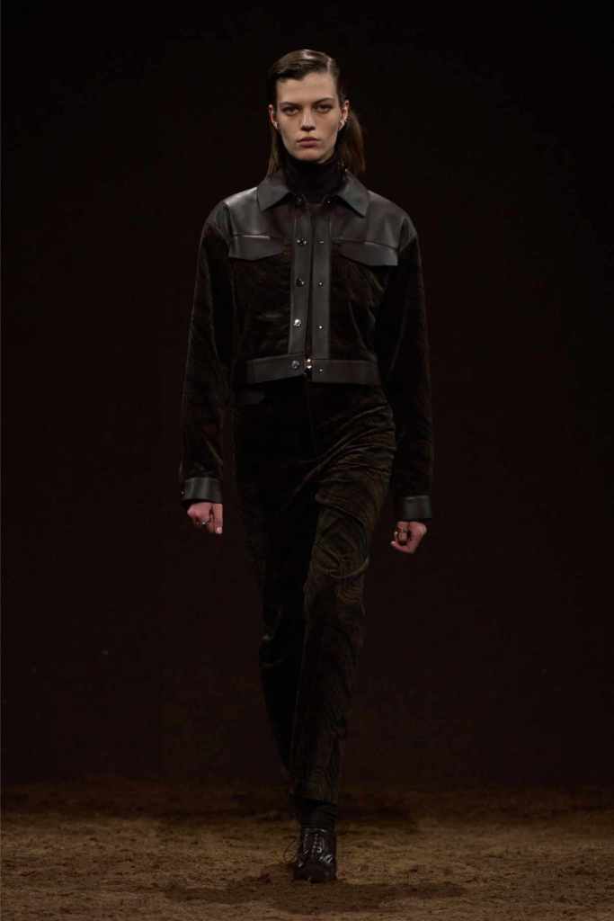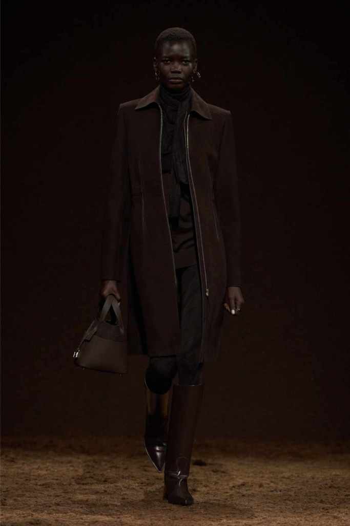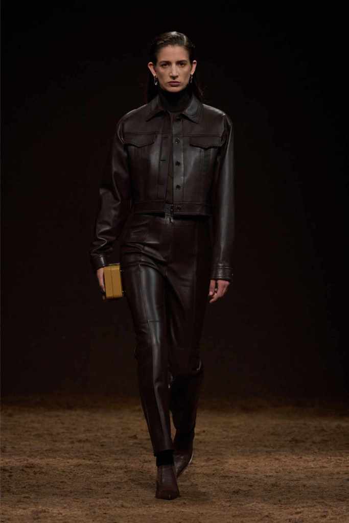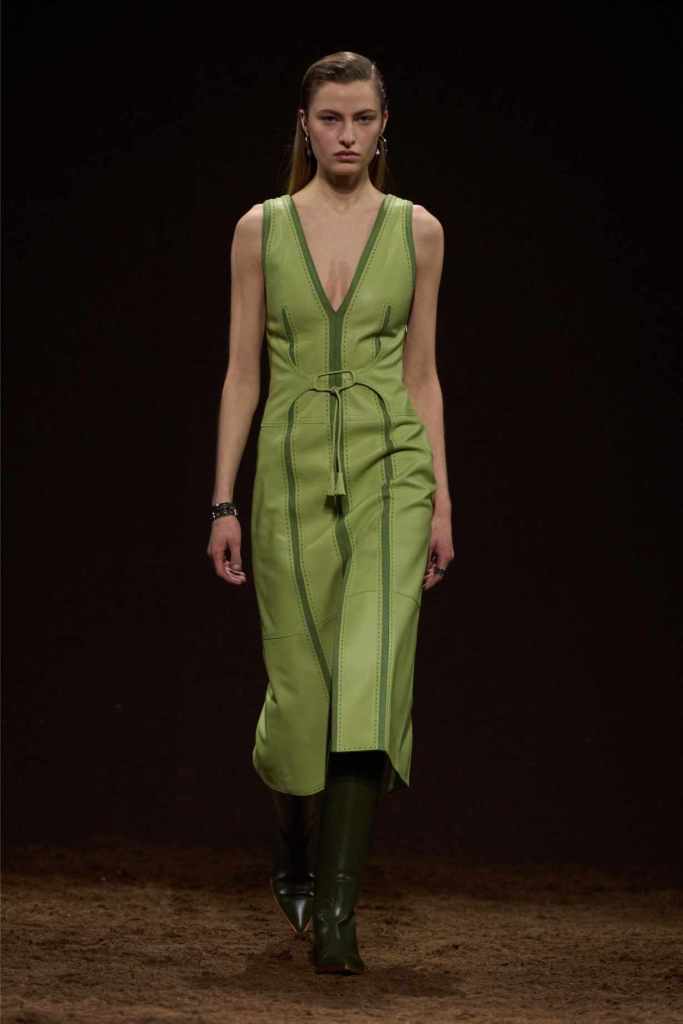 True to Hermès’ legacy, leather took center stage. The silhouettes were sharp yet effortless—high-waisted trousers, quilted vests, and rigid-cut blazers all emphasized precision tailoring. The dominant black palette, spanning deep charcoal to jet black, was punctuated by lime green, creamy taupe, and soft browns, reinforcing the brand’s commitment to timeless sophistication.