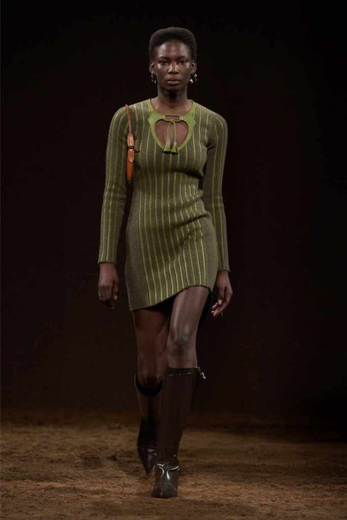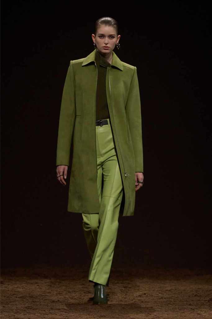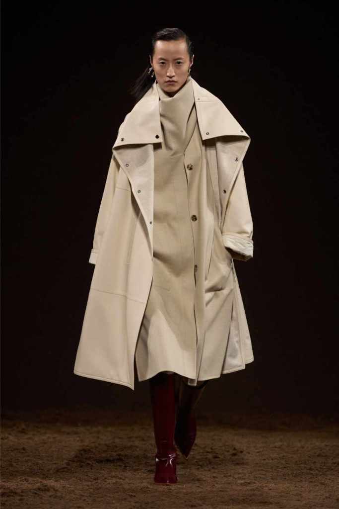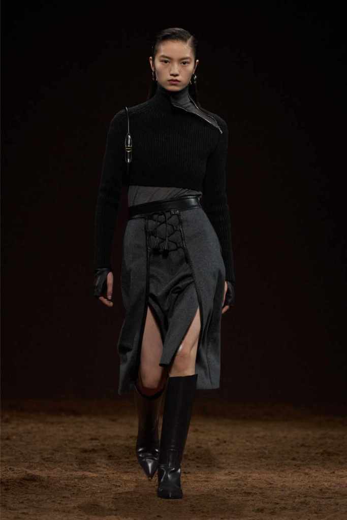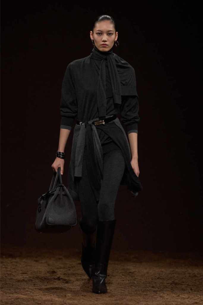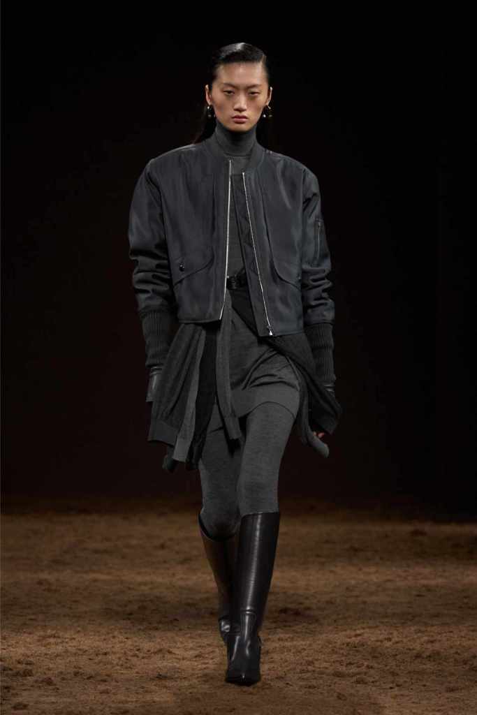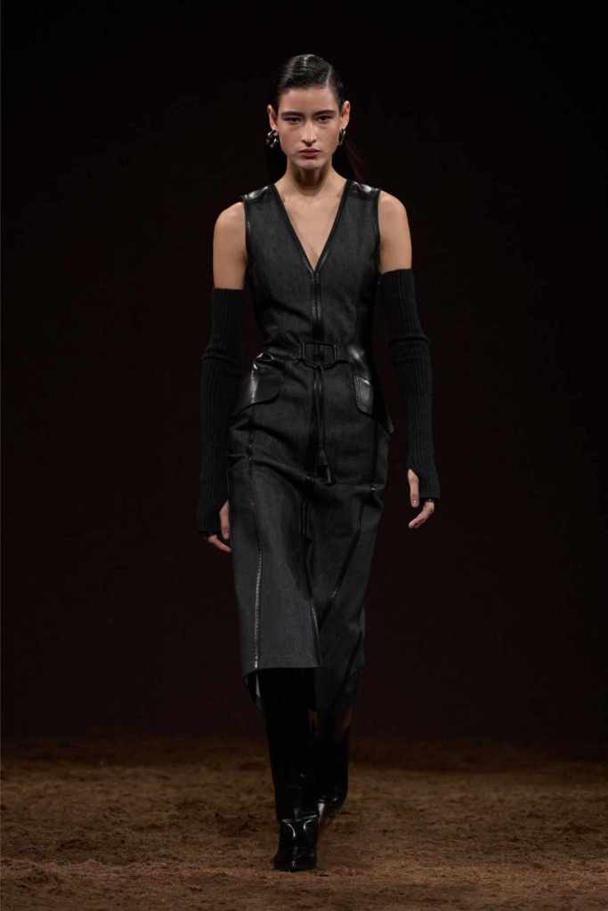 True to Hermès’ legacy, leather took center stage. The silhouettes were sharp yet effortless—high-waisted trousers, quilted vests, and rigid-cut blazers all emphasized precision tailoring. The dominant black palette, spanning deep charcoal to jet black, was punctuated by lime green, creamy taupe, and soft browns, reinforcing the brand’s commitment to timeless sophistication.