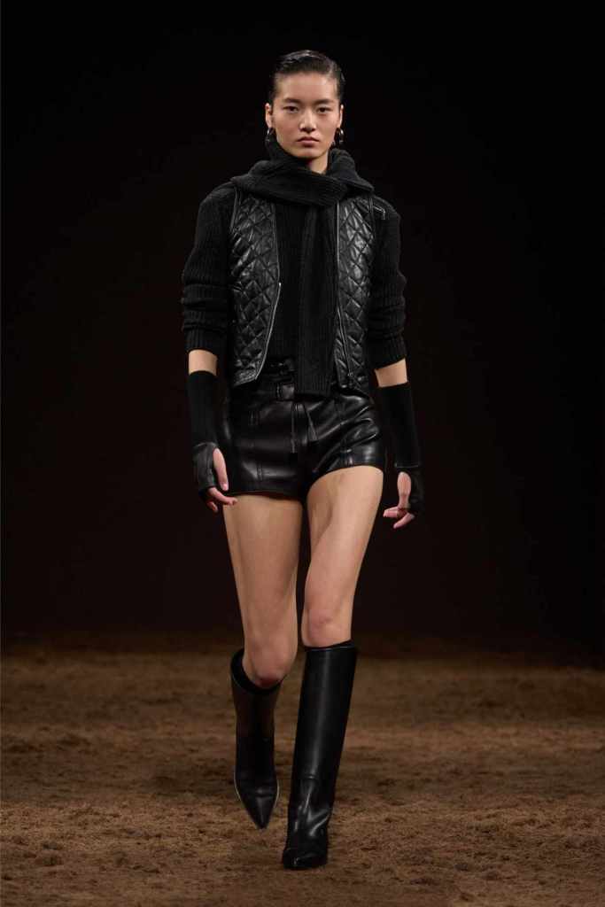 Named “Leather Dandy,” the collection was an exploration of equestrian and biker aesthetics, seamlessly blended into a refined and wearable wardrobe. A cropped quilted jacket, belted high-waisted leather pants, and sleek riding boots set the tone for a lineup rooted in craftsmanship and subtle fetishism.