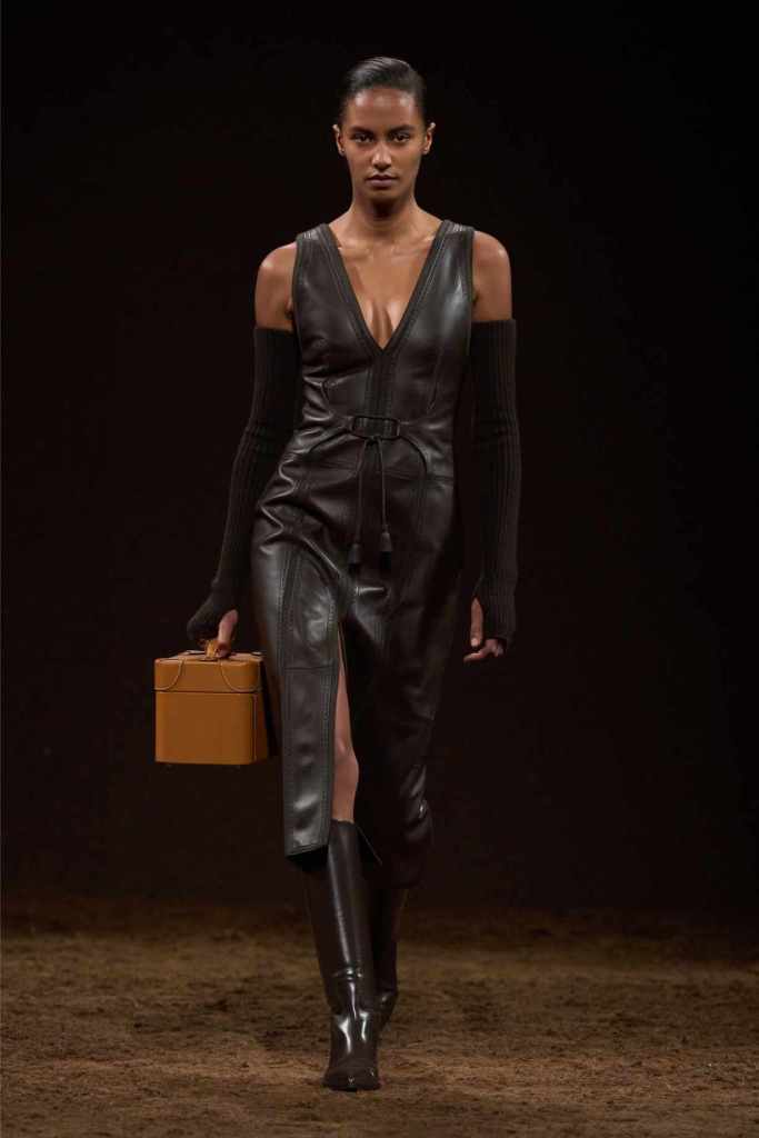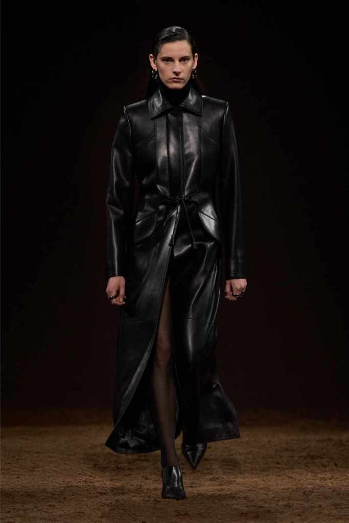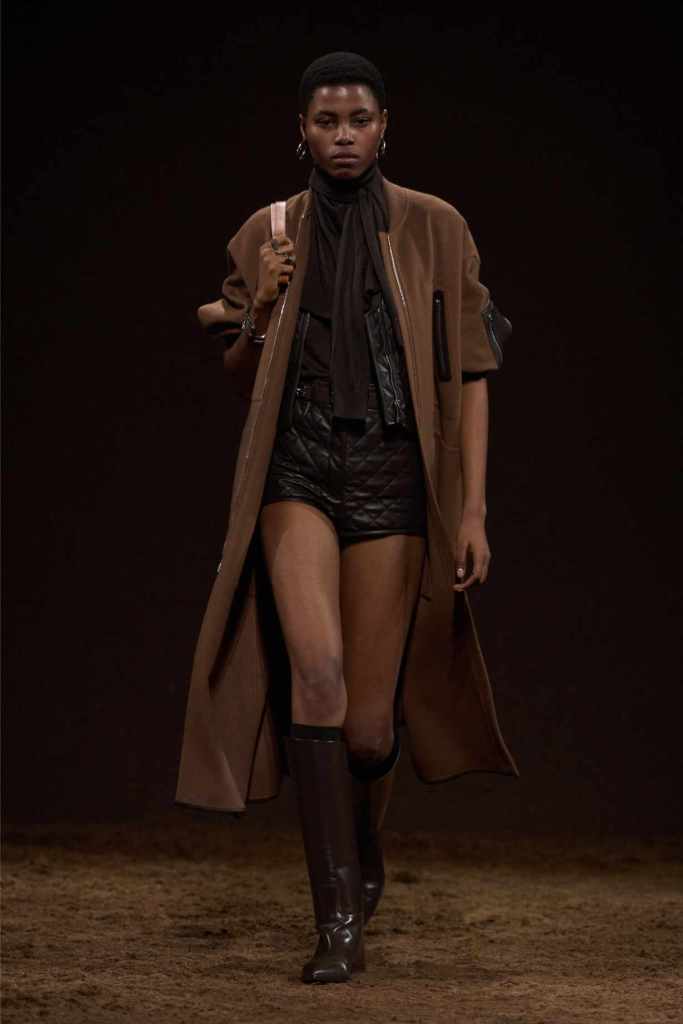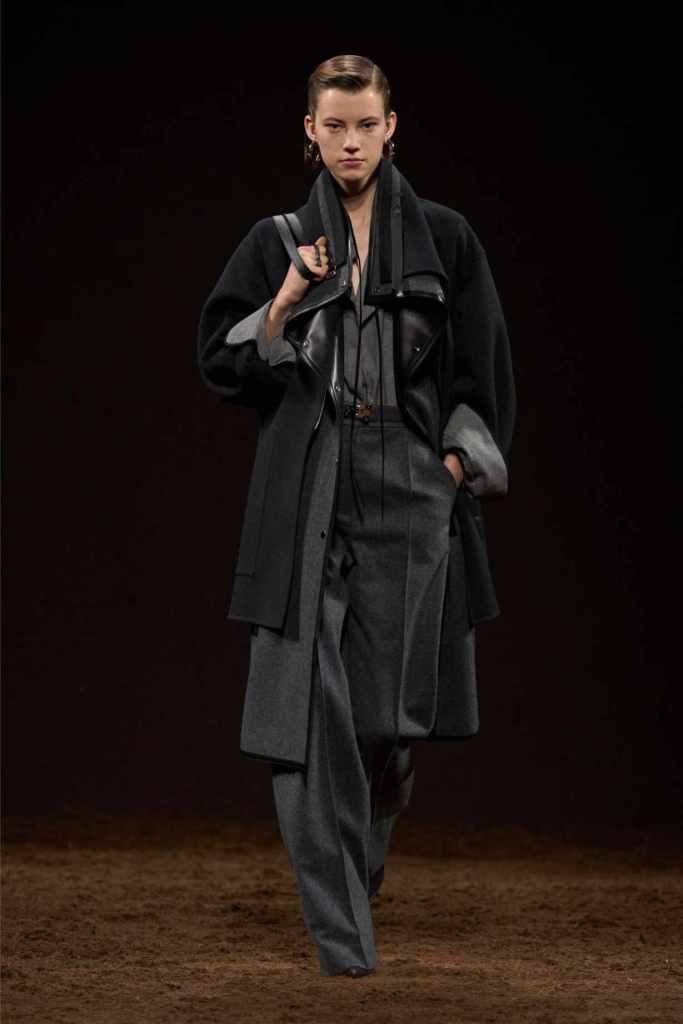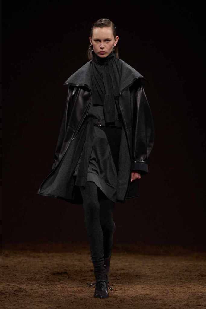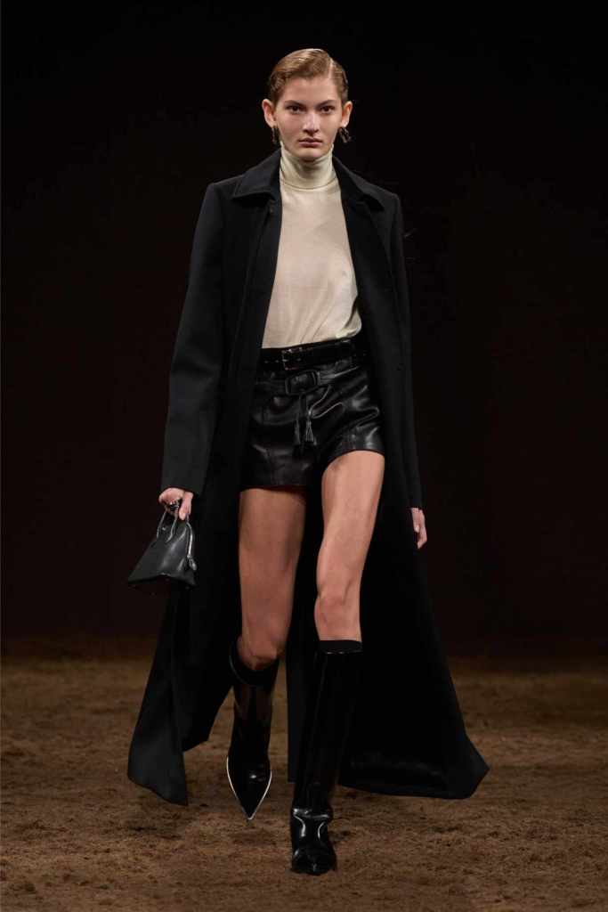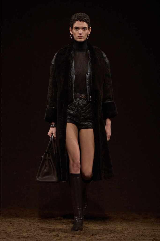 Vanhée’s signature layering was present throughout. Long wool coats were draped with the ease of a scarf, chunky sweaters were casually slung over shoulders, and sleek leather shorts peeked out from beneath floor-length dusters. Even the accessories made a statement—tiny “petit sacs” were tucked under arms, while ergonomic saddle bags with oversized silver hardware completed the looks.