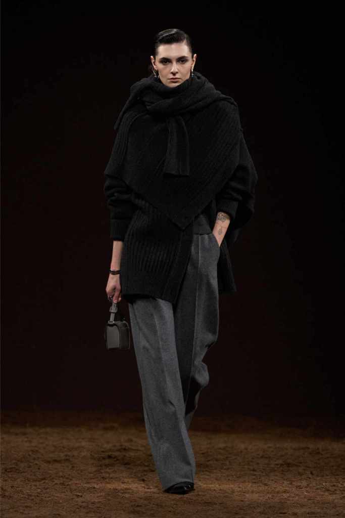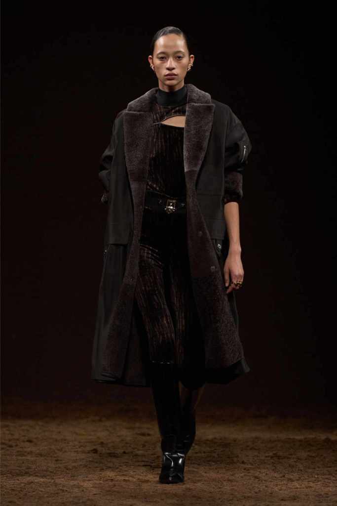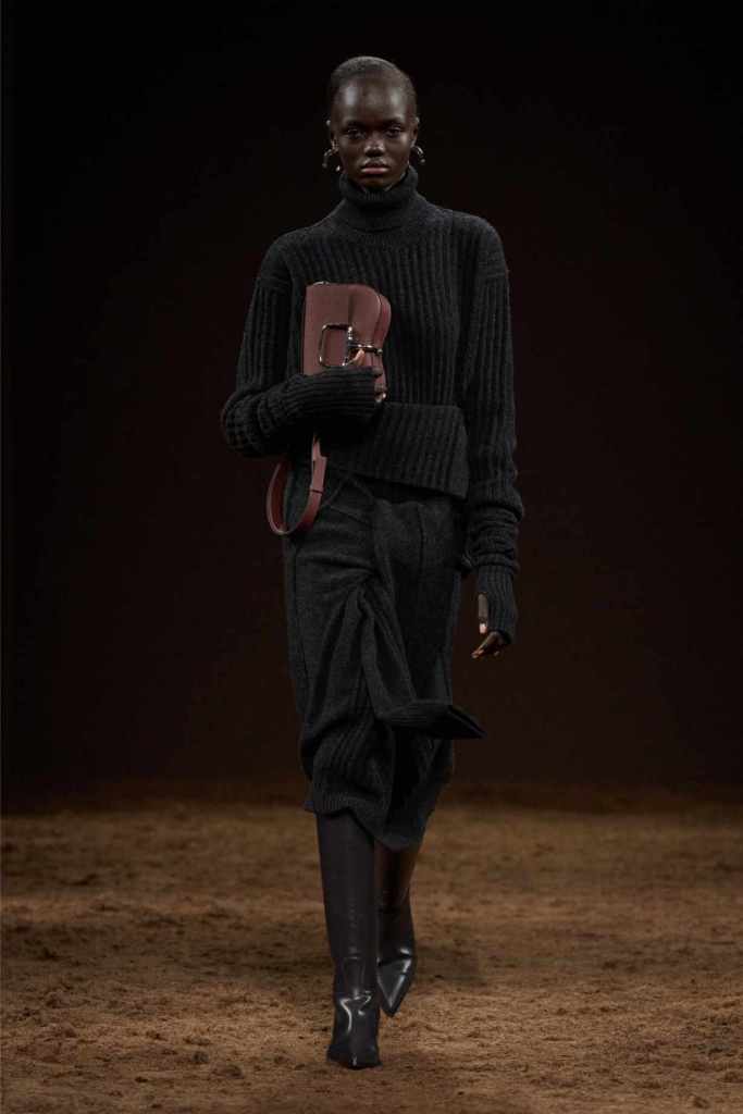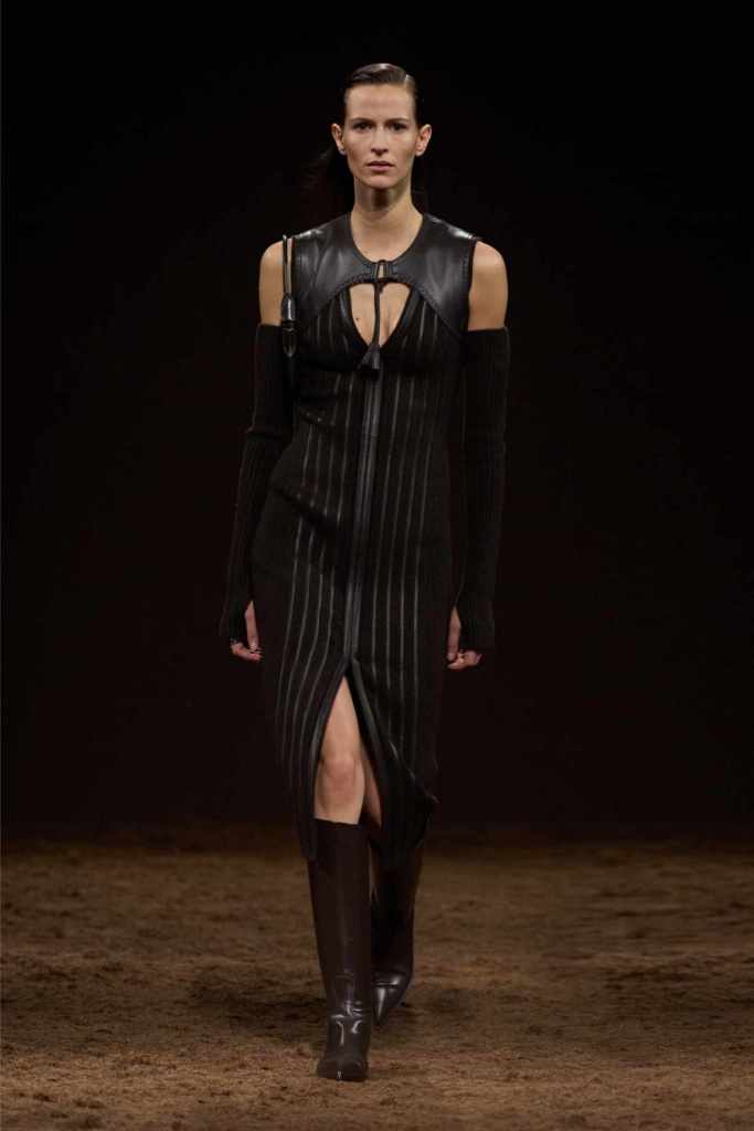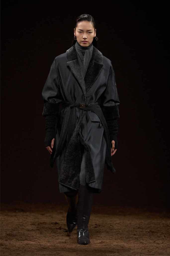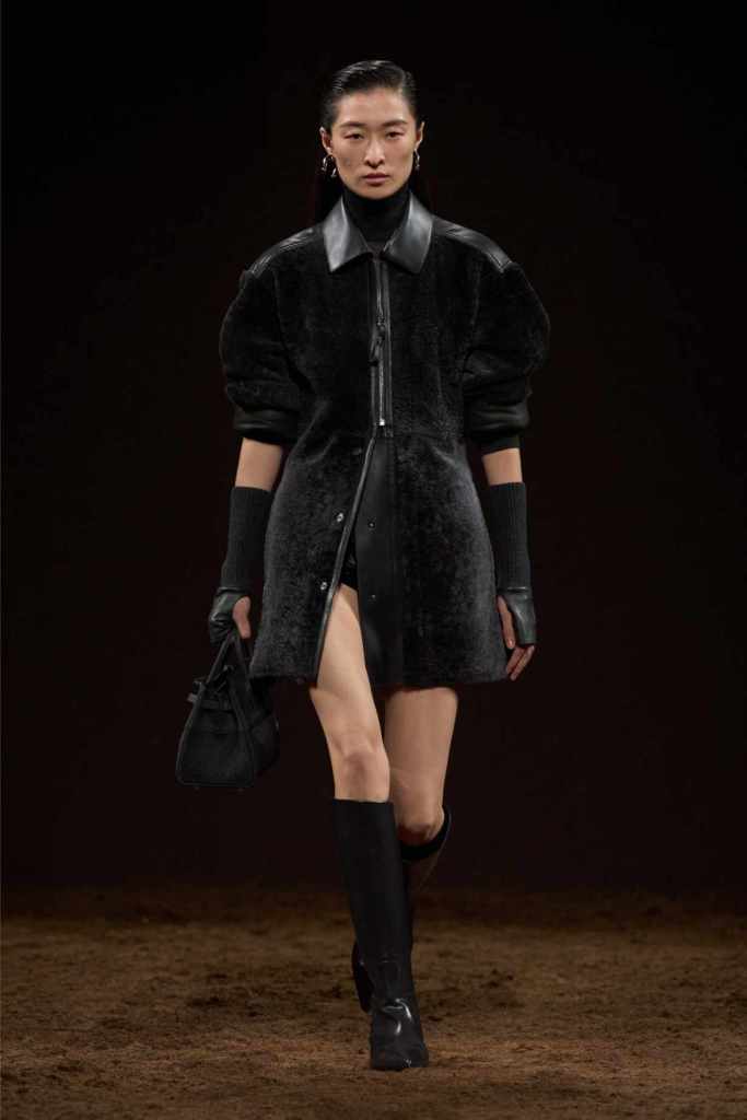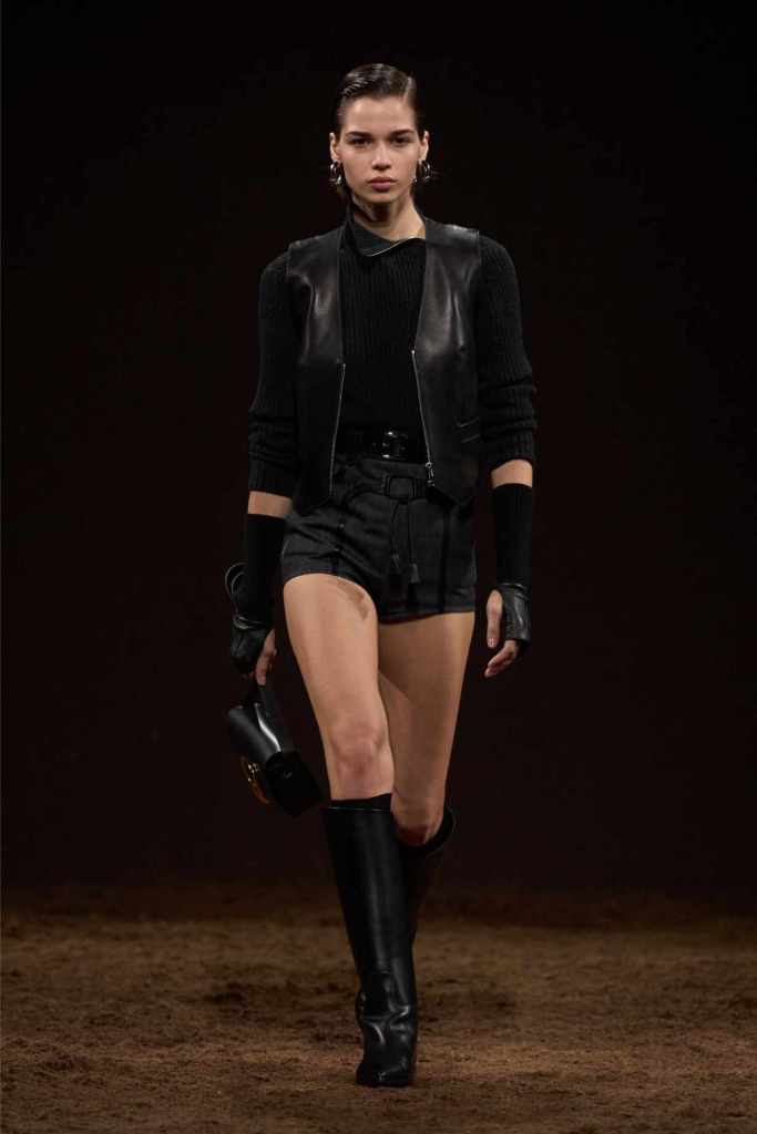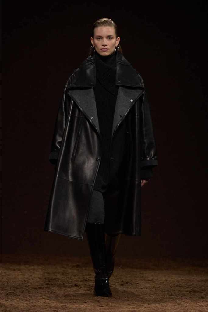Vanhée’s signature layering was present throughout. Long wool coats were draped with the ease of a scarf, chunky sweaters were casually slung over shoulders, and sleek leather shorts peeked out from beneath floor-length dusters. Even the accessories made a statement—tiny “petit sacs” were tucked under arms, while ergonomic saddle bags with oversized silver hardware completed the looks.