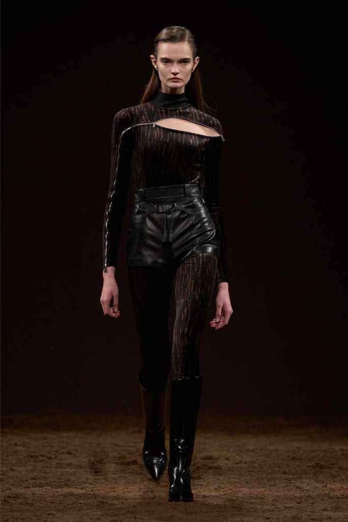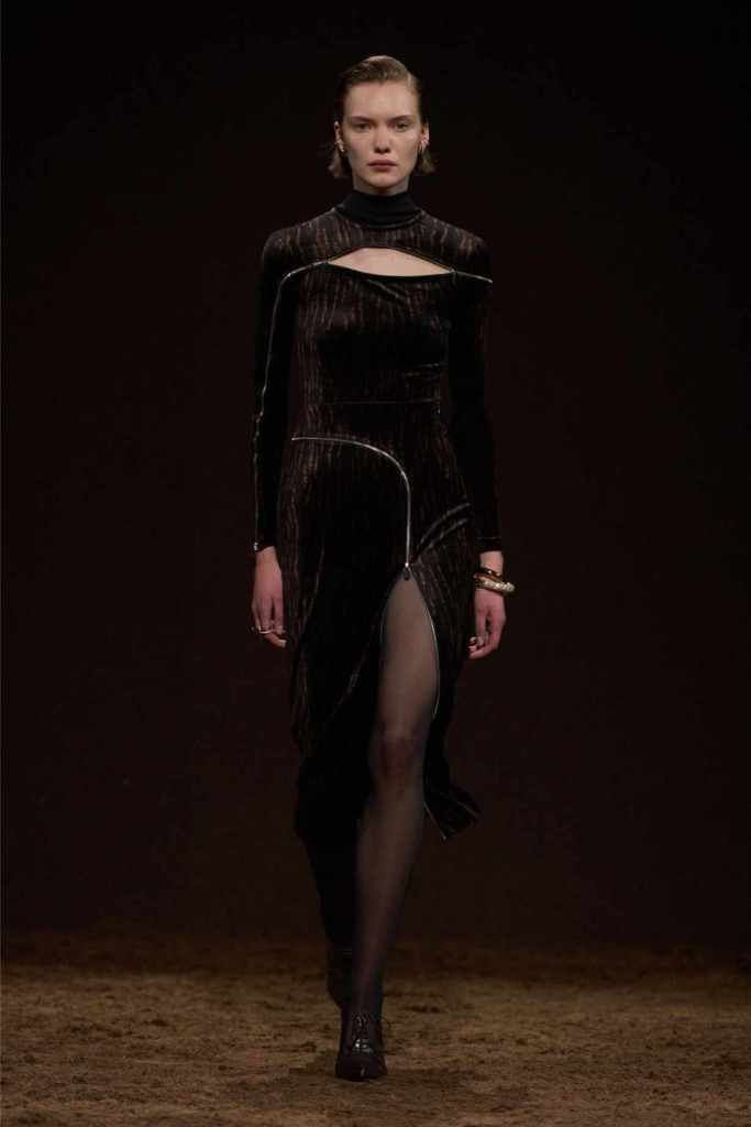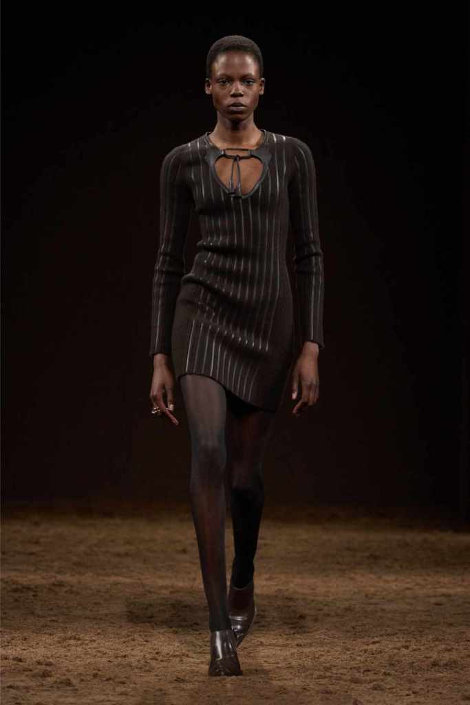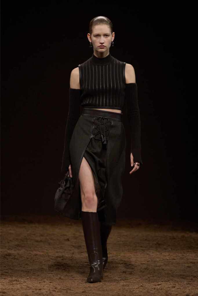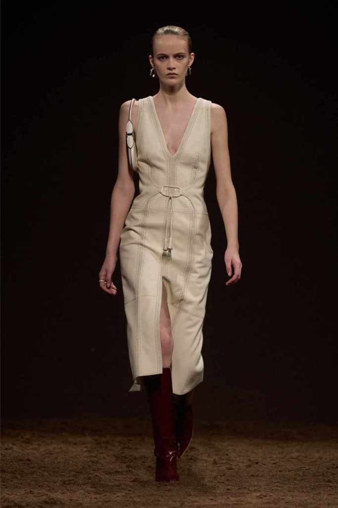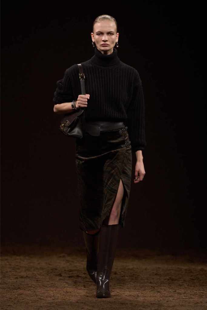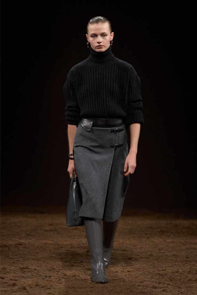 Vanhée’s signature layering was present throughout. Long wool coats were draped with the ease of a scarf, chunky sweaters were casually slung over shoulders, and sleek leather shorts peeked out from beneath floor-length dusters. Even the accessories made a statement—tiny “petit sacs” were tucked under arms, while ergonomic saddle bags with oversized silver hardware completed the looks.