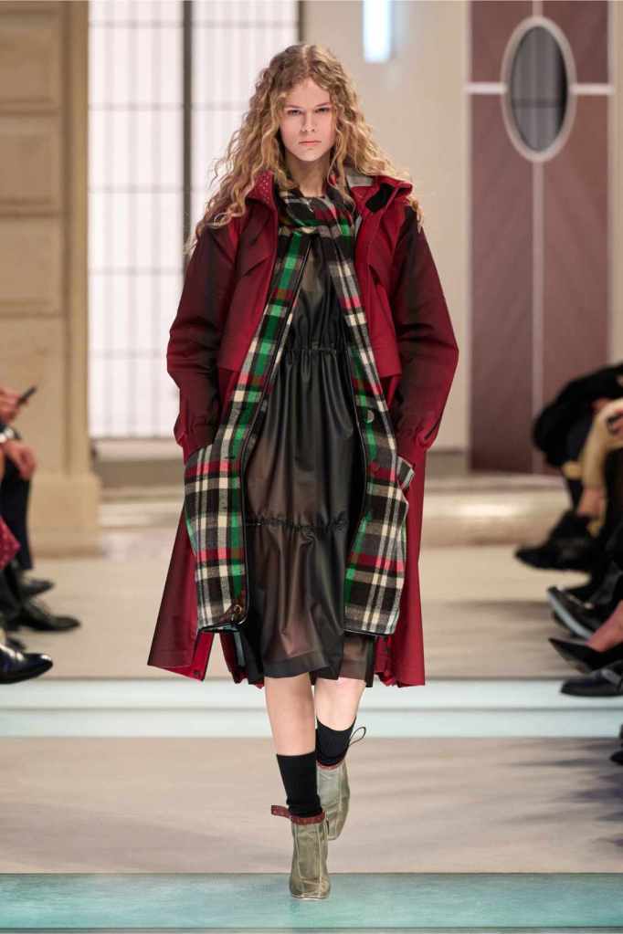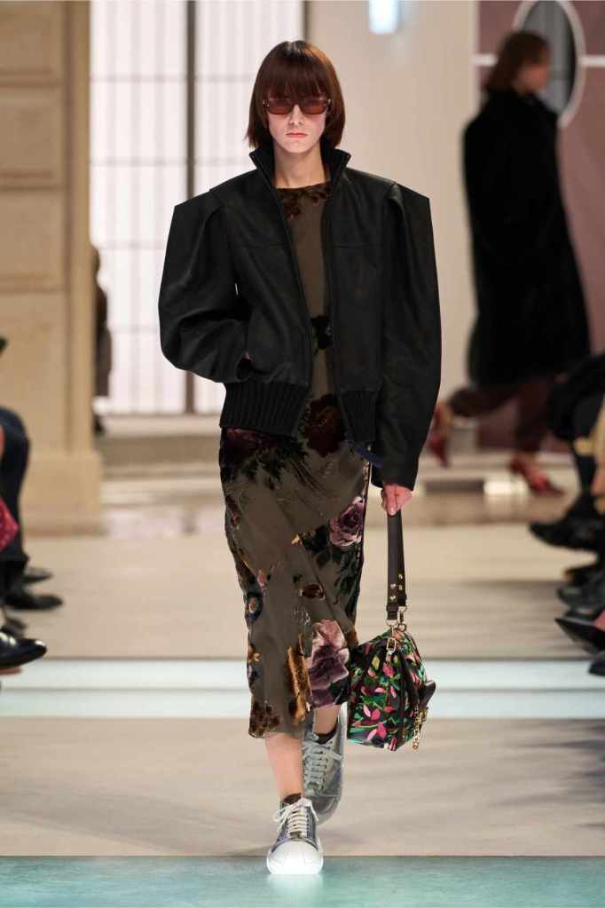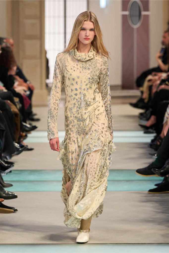 Dresses and separates followed the same theme. Flowing gowns were layered under sharply tailored blazers, corseted tops were paired with loose, slouchy trousers, and structured skirts were softened with delicate, semi-sheer fabrics. The collection played with texture—plush velvets, glossy leathers, and intricate embroidery contrasted with sleek, minimalistic silhouettes.