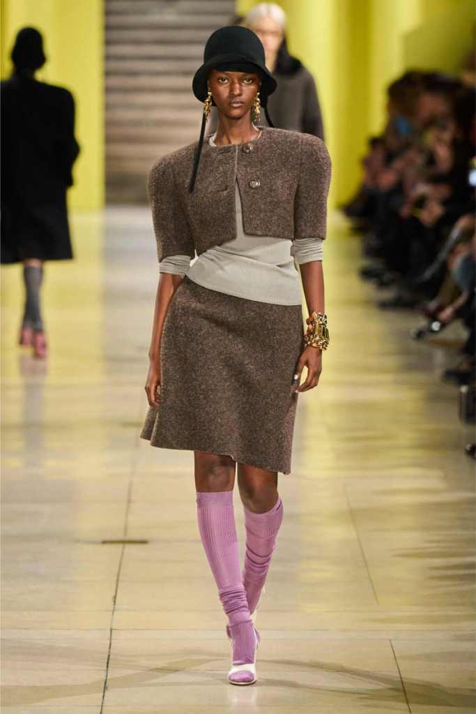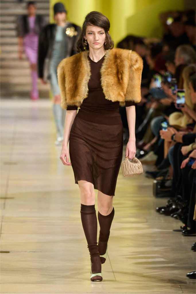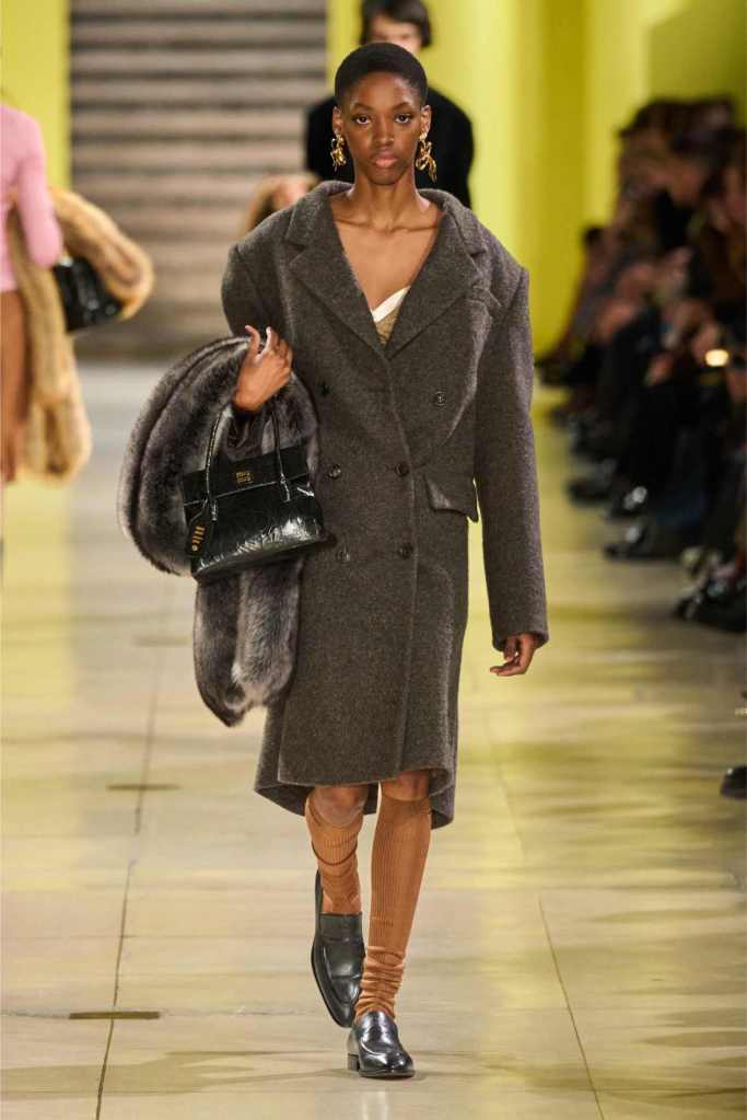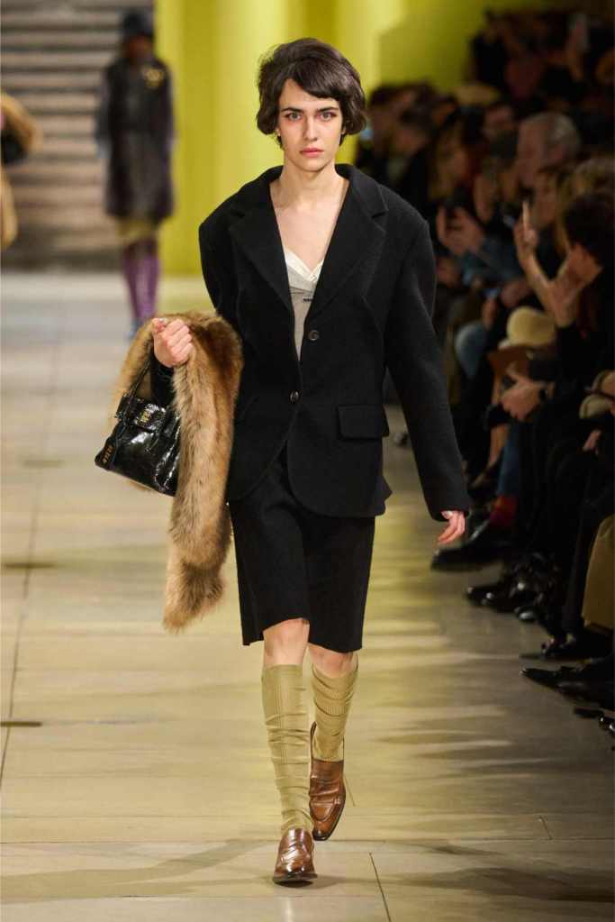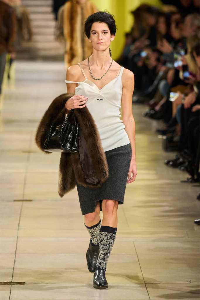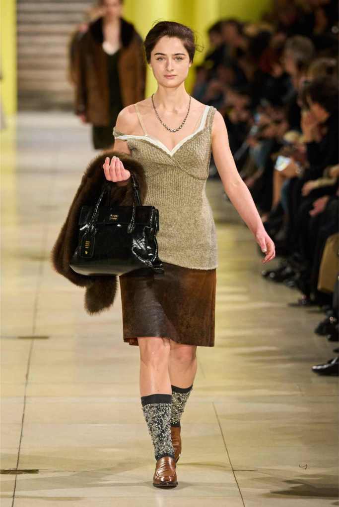 Chunky brooches, layers of gilded bracelets, and pearl-studded socks turned everyday basics into statement pieces. The signature Miu Miu schoolgirl aesthetic was present, but more grown-up this time—thigh-high wool socks paired with prim skirts and polished handbags.
