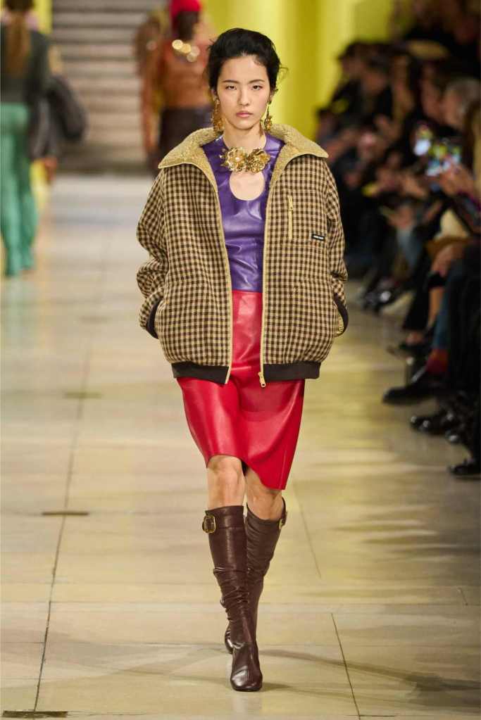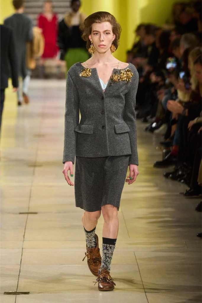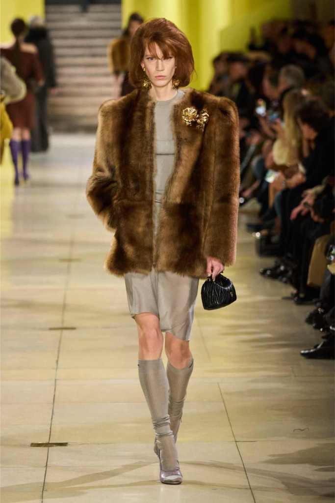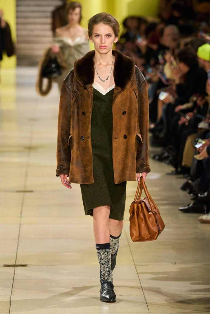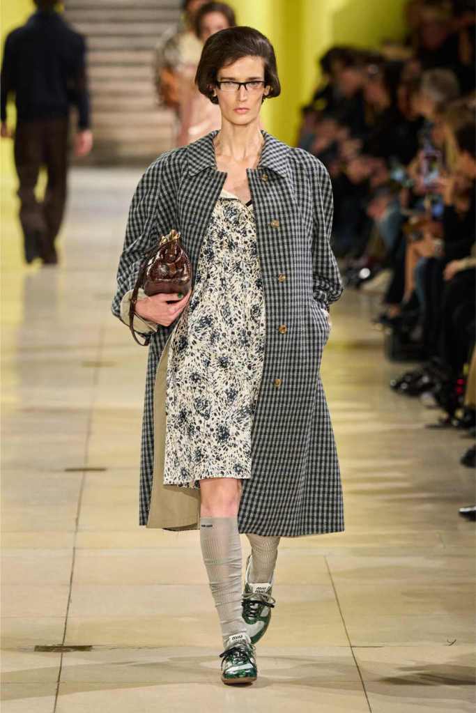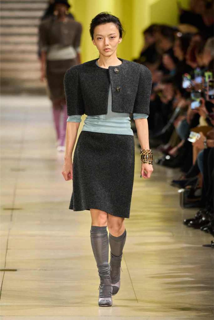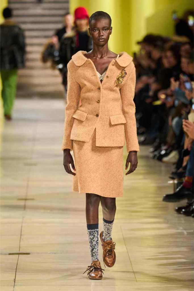 Chunky brooches, layers of gilded bracelets, and pearl-studded socks turned everyday basics into statement pieces. The signature Miu Miu schoolgirl aesthetic was present, but more grown-up this time—thigh-high wool socks paired with prim skirts and polished handbags.