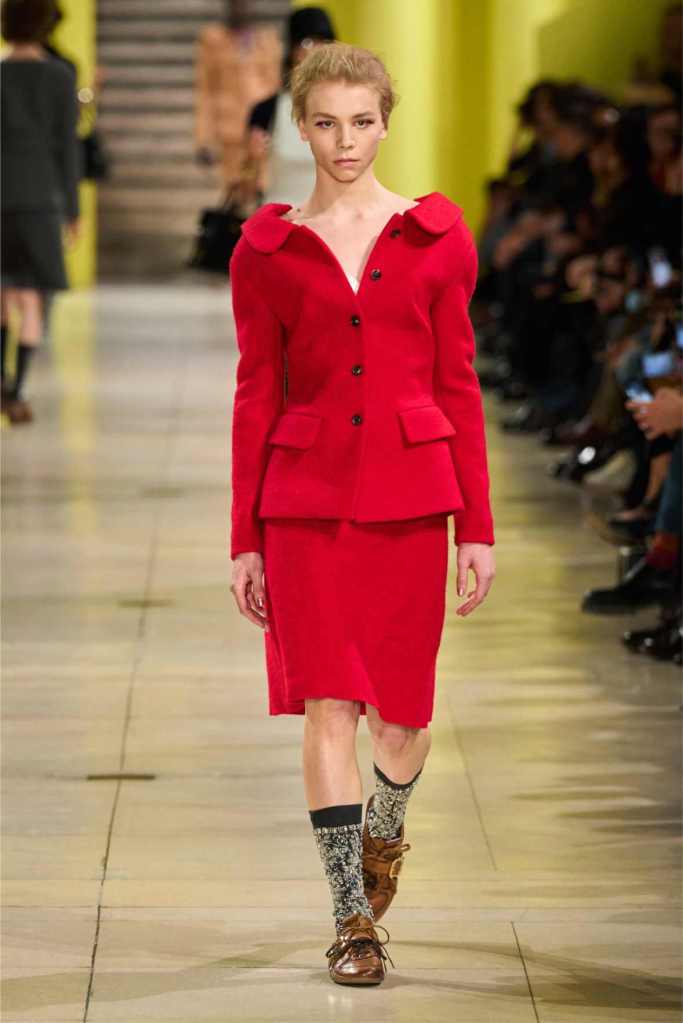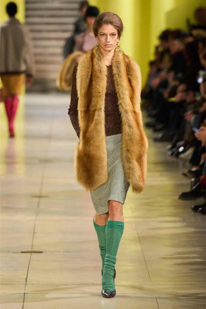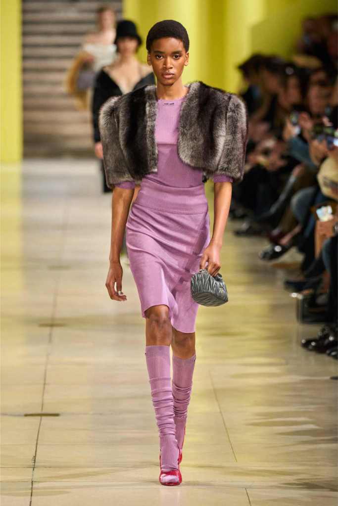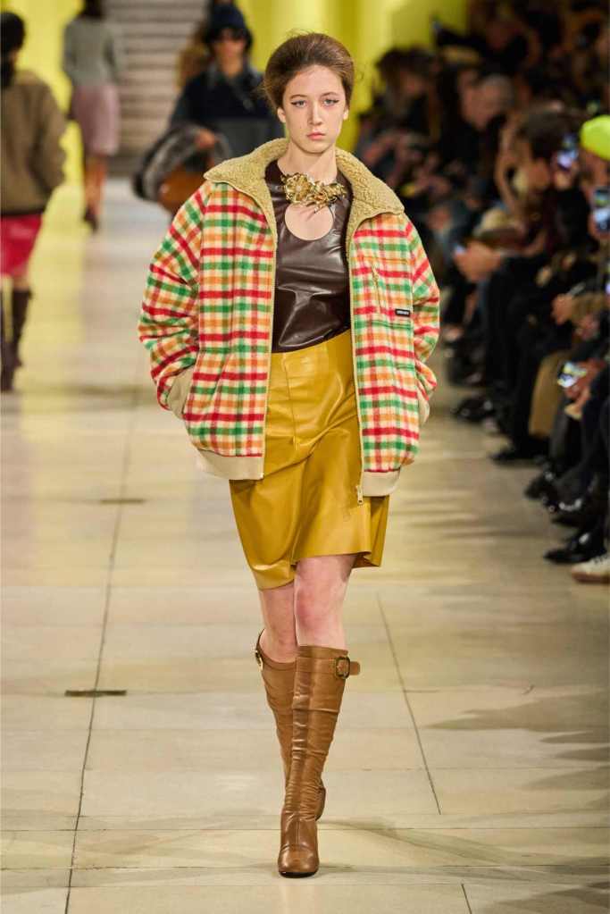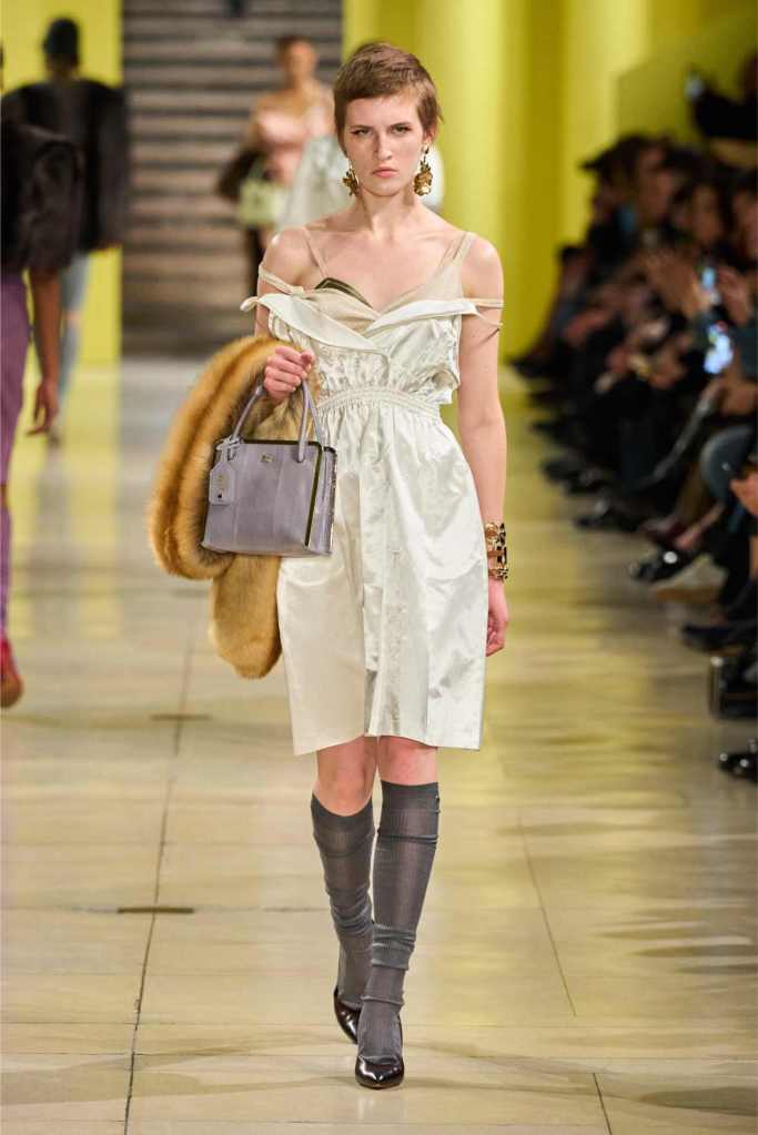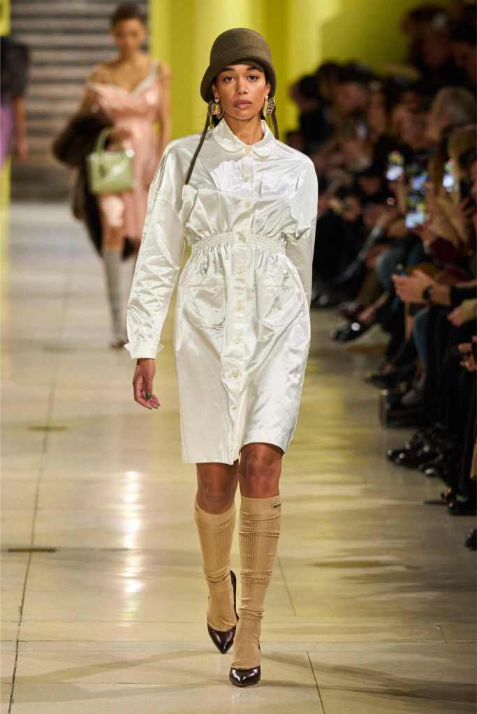 Chunky brooches, layers of gilded bracelets, and pearl-studded socks turned everyday basics into statement pieces. The signature Miu Miu schoolgirl aesthetic was present, but more grown-up this time—thigh-high wool socks paired with prim skirts and polished handbags.
