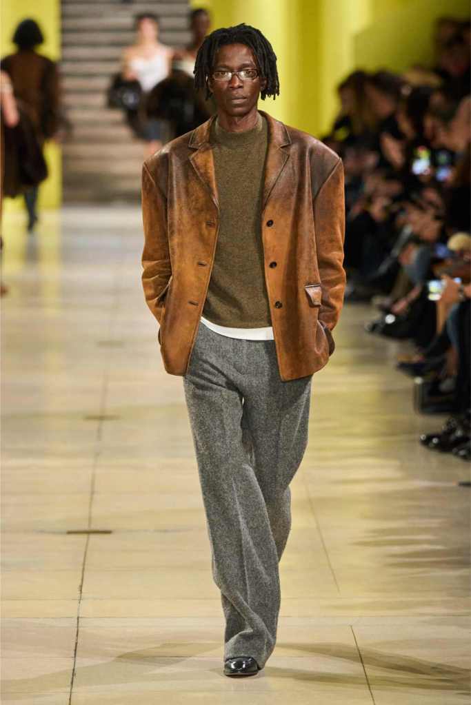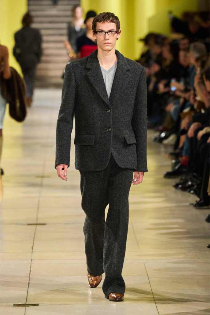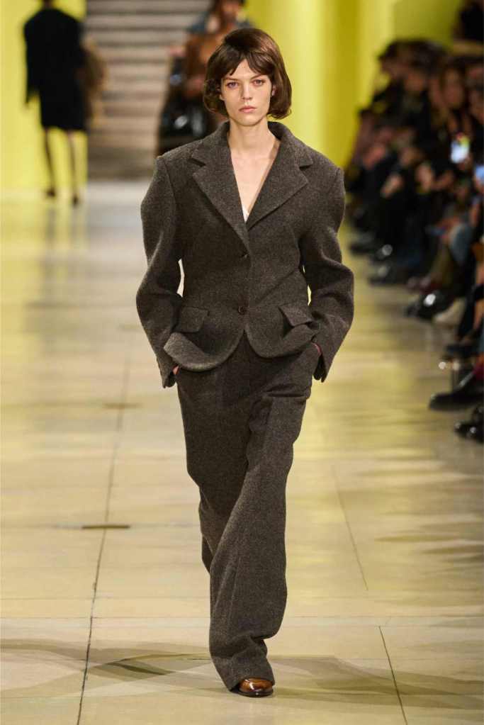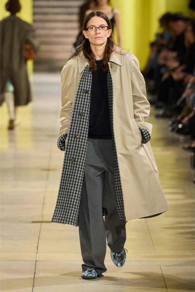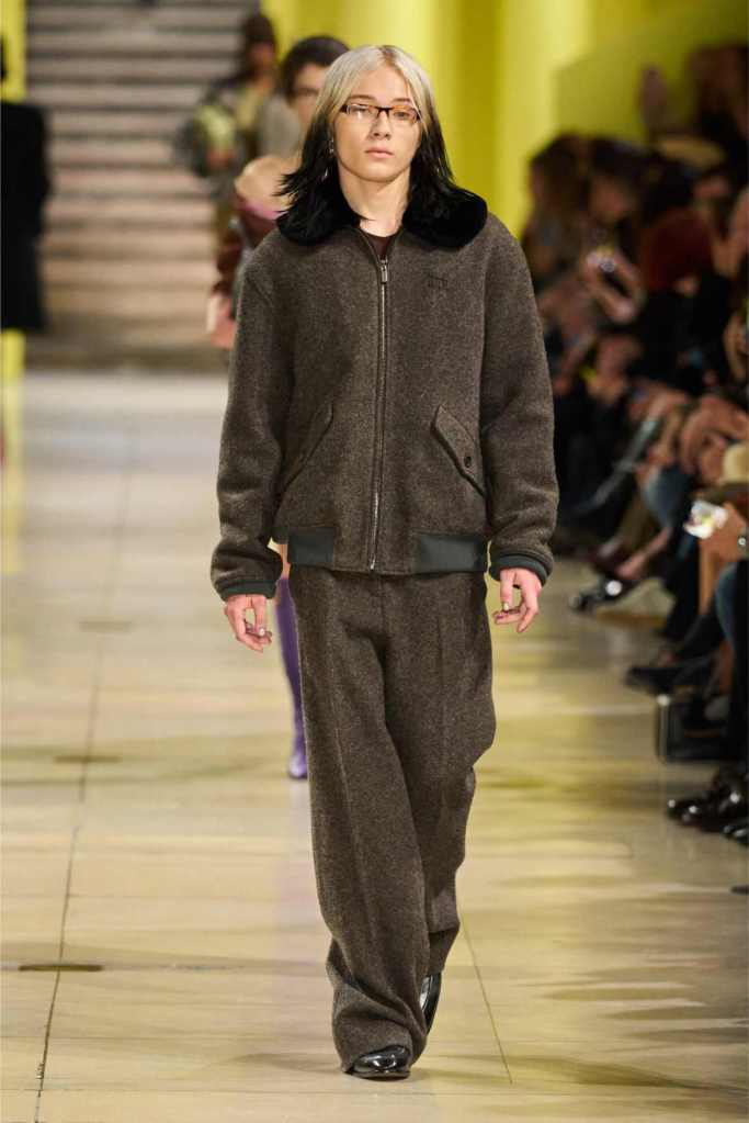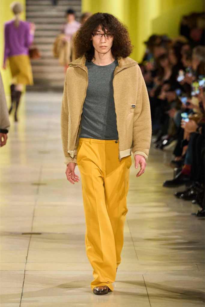 The color palette was as diverse as the silhouettes, ranging from muted earth tones—mustard, olive, camel—to more dramatic hues like royal purple, seafoam green, and acid yellow. Textures played an equally important role, with felted wool, cotton satin, and silk knit giving the collection a tactile richness that balanced the playful proportions.