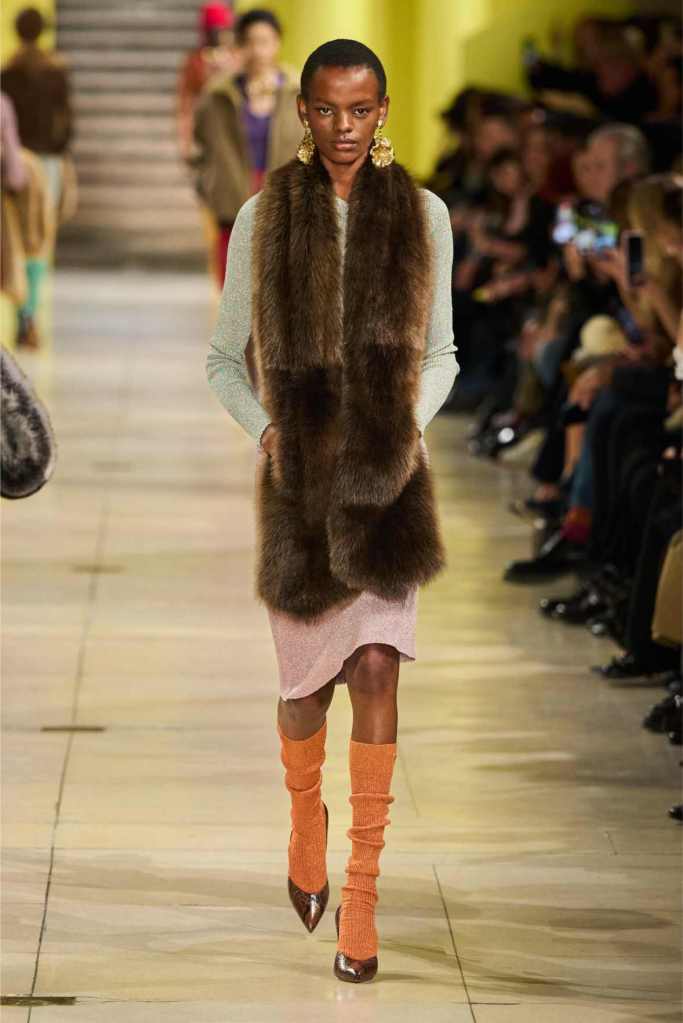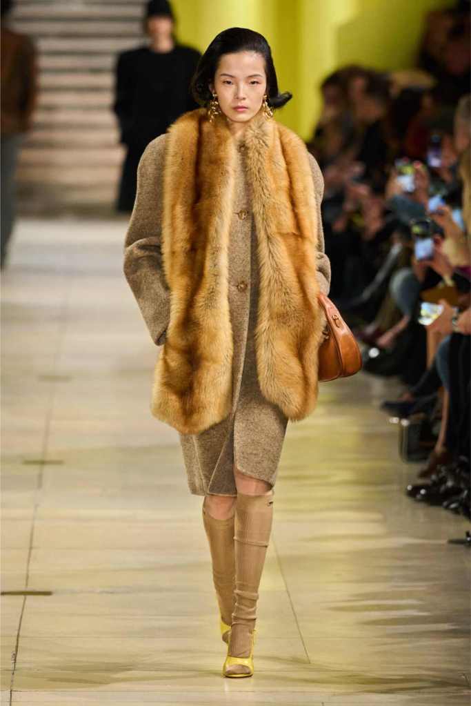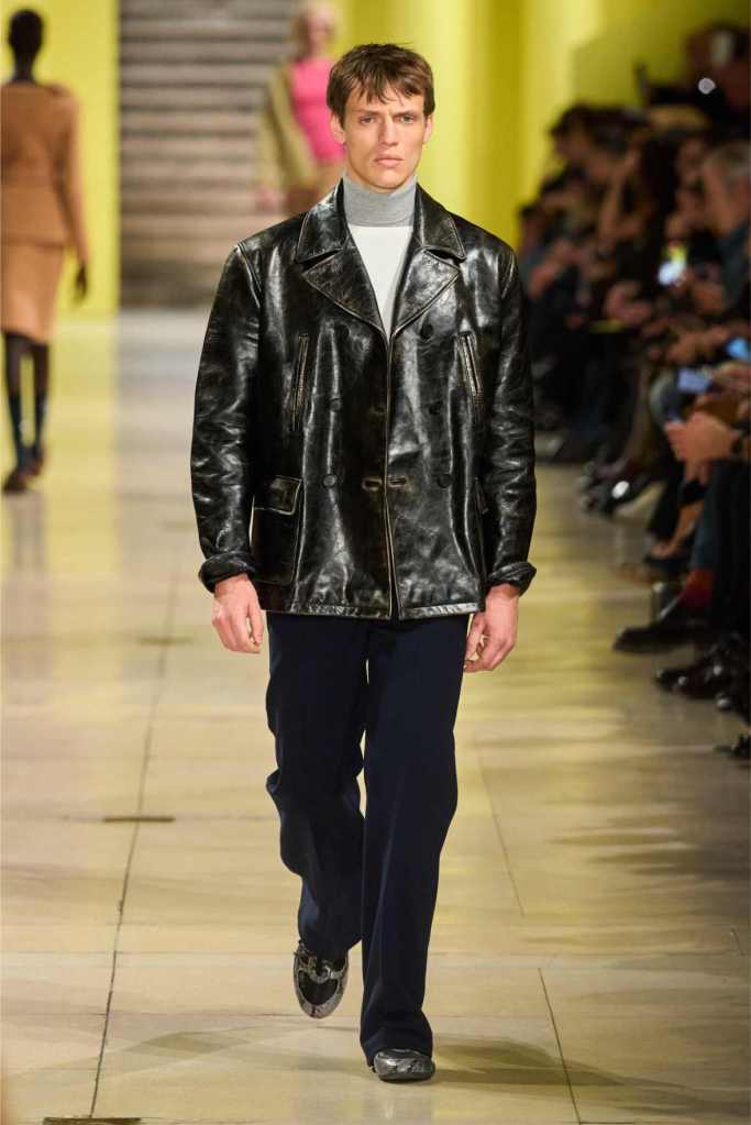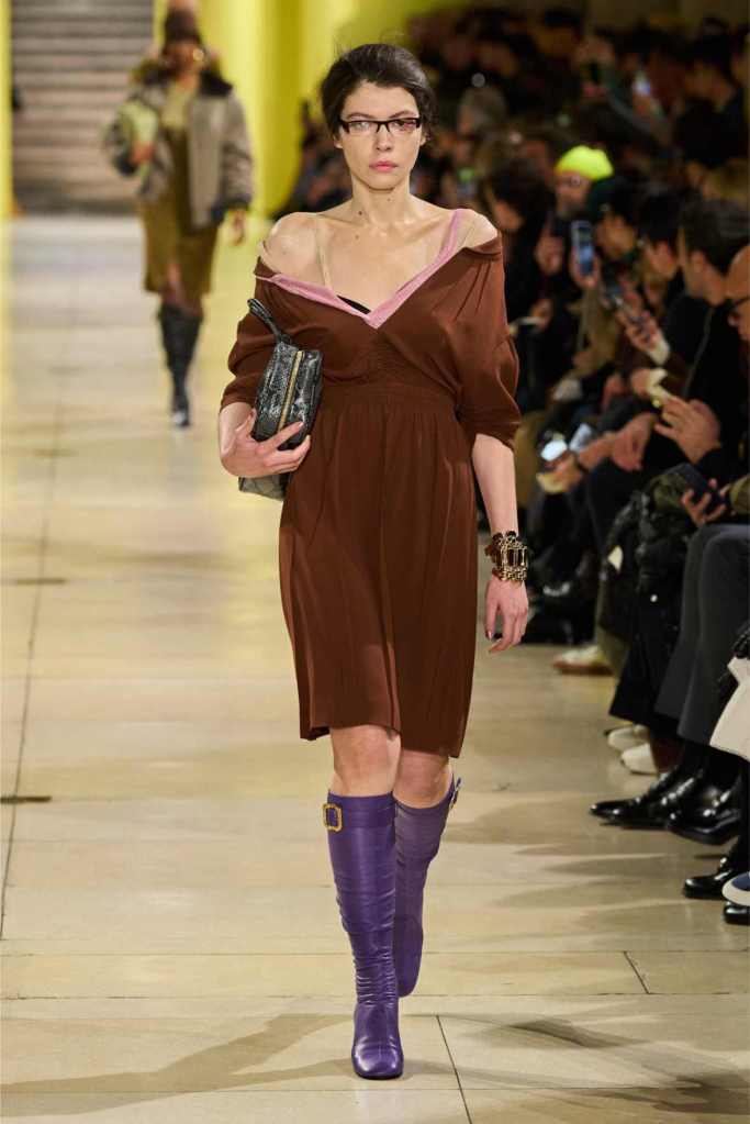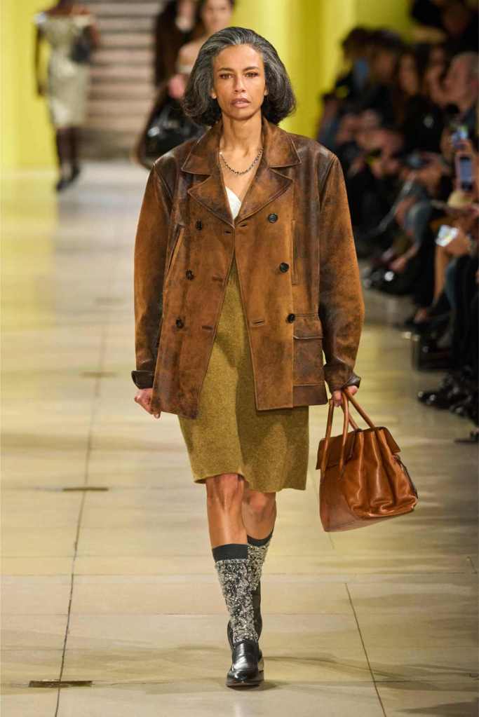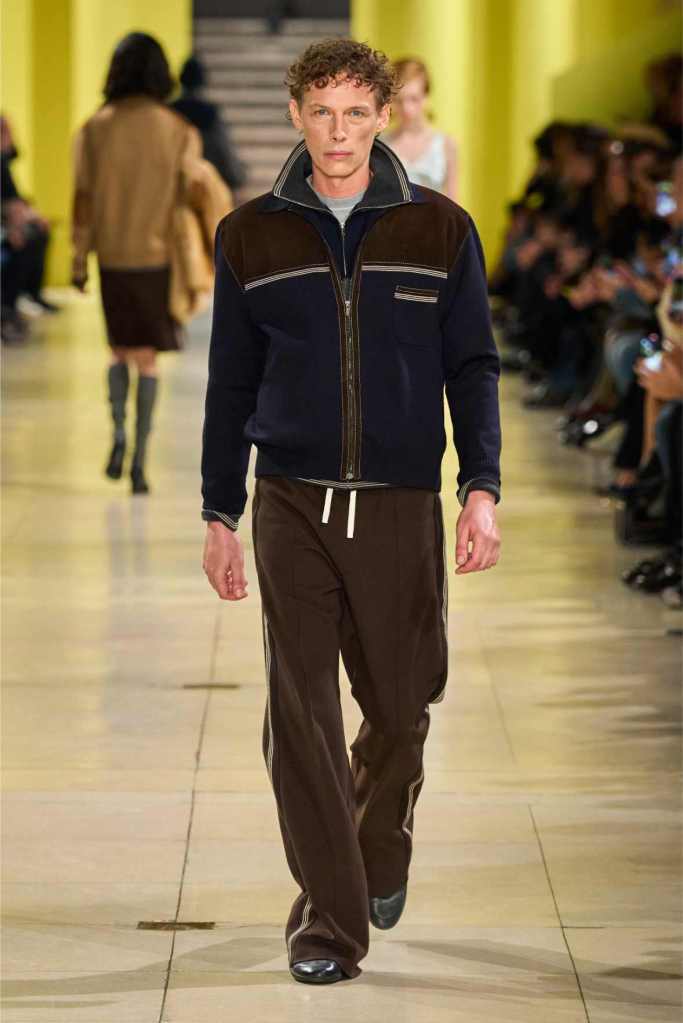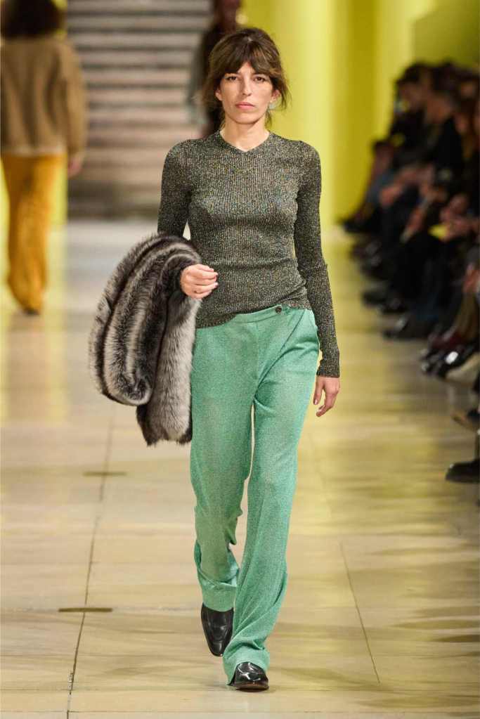 The color palette was as diverse as the silhouettes, ranging from muted earth tones—mustard, olive, camel—to more dramatic hues like royal purple, seafoam green, and acid yellow. Textures played an equally important role, with felted wool, cotton satin, and silk knit giving the collection a tactile richness that balanced the playful proportions.