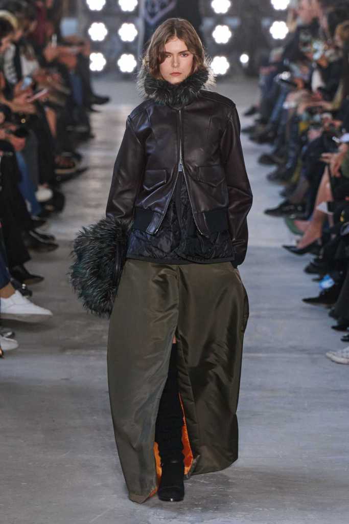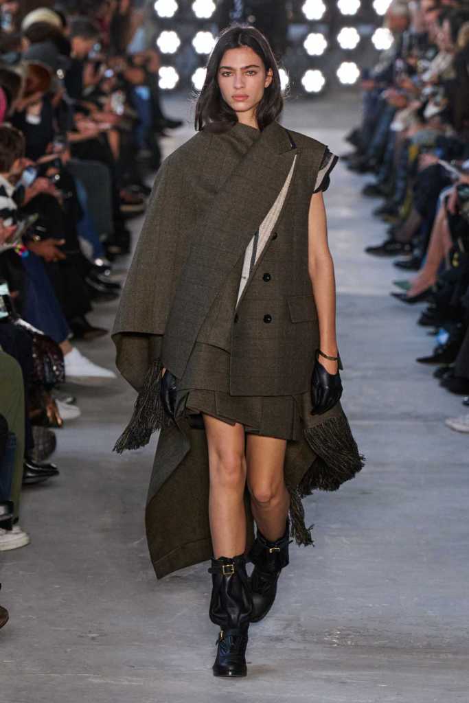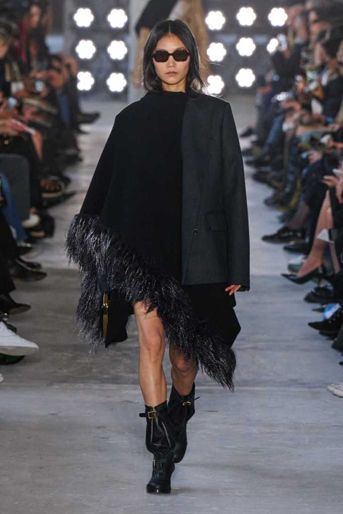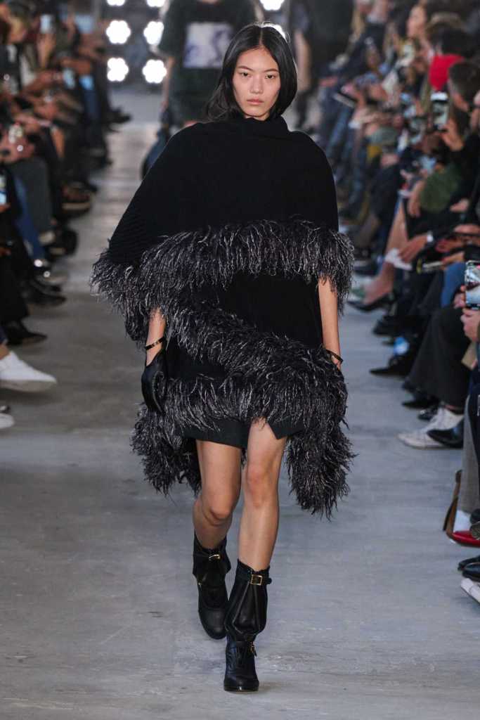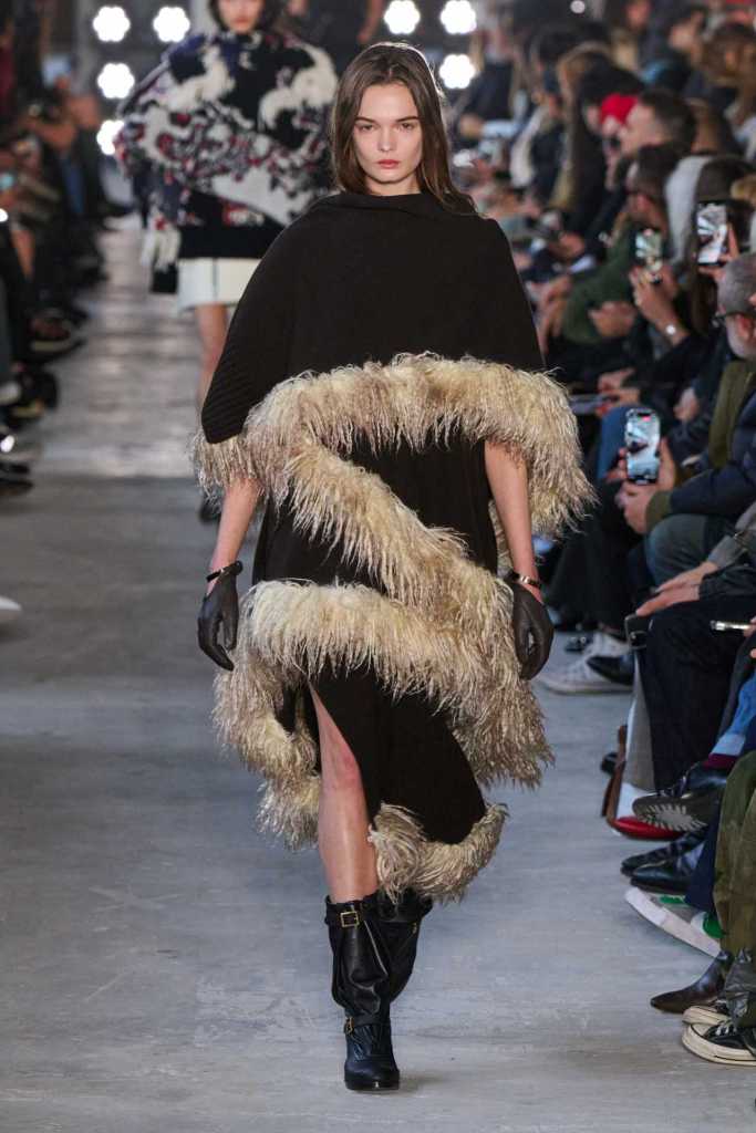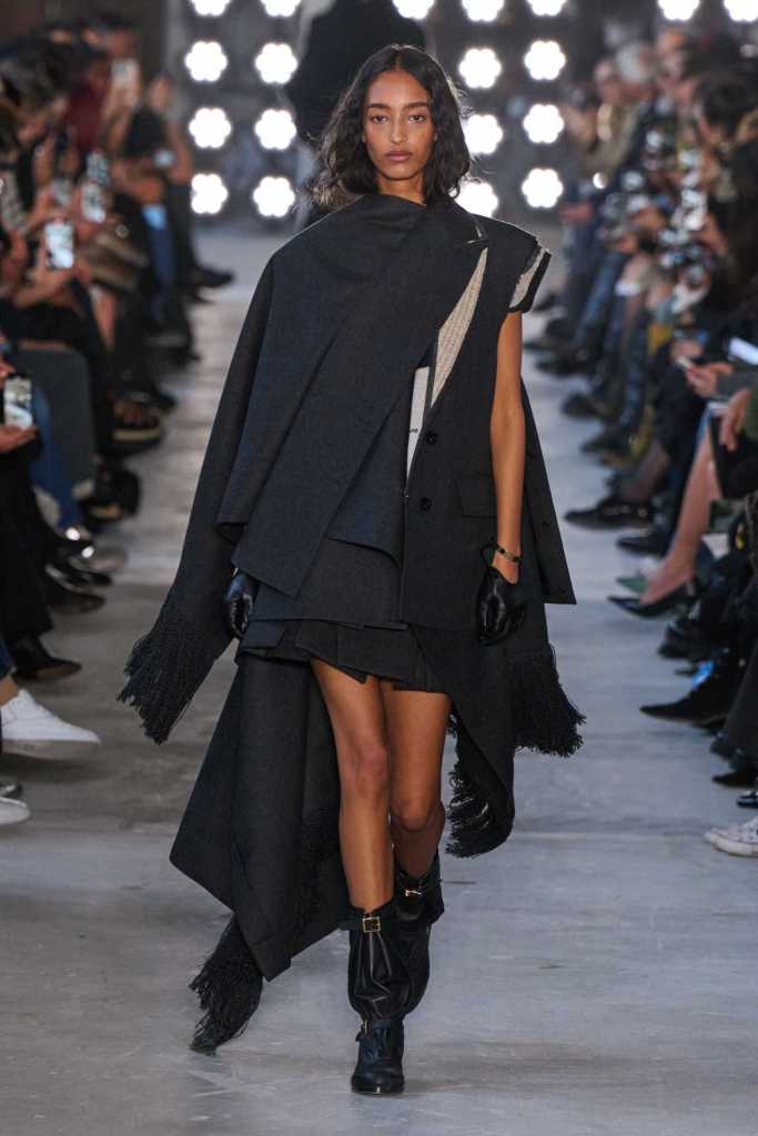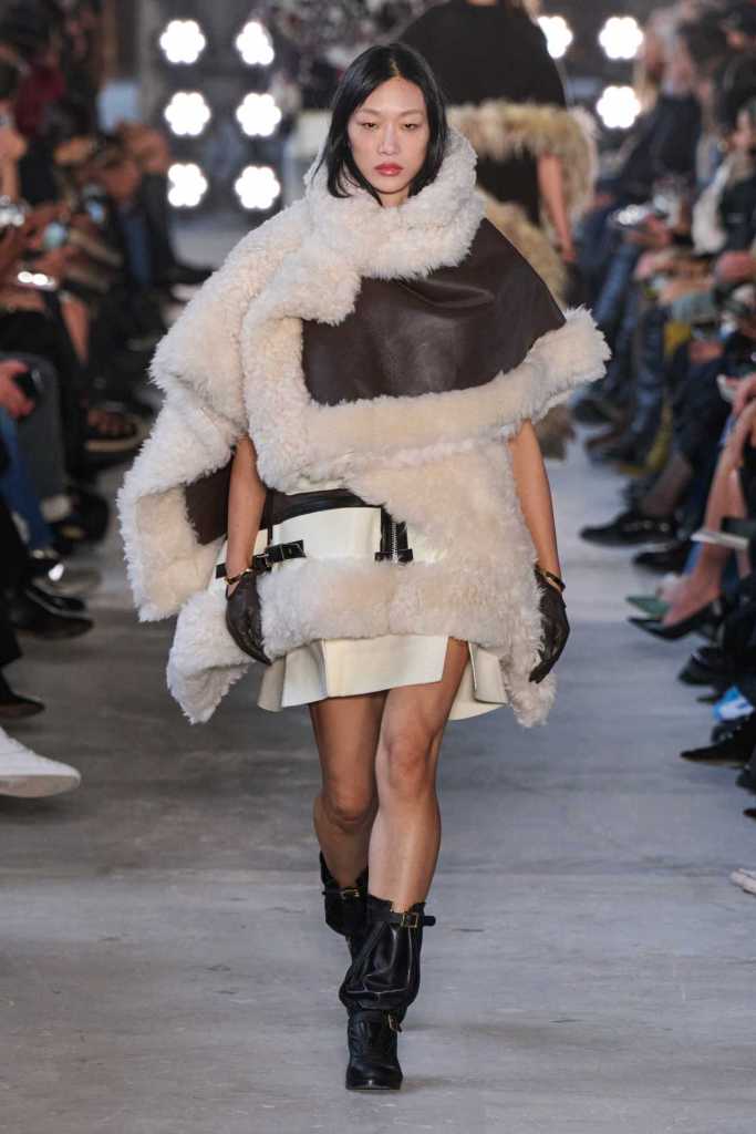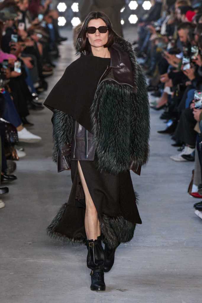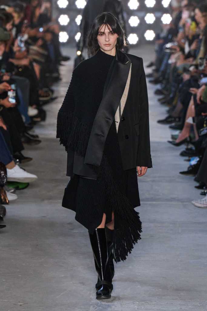 The Sacai woman has always embodied contrast, and this season was no different. Military jackets were softened with knitted panels, and tailored suiting was juxtaposed with chiffon and fringe knit panels, creating a layered, protective effect. Even Abe’s choice of footwear reflected this shift — gone were the towering platforms, replaced by faux-fur scuffs and low-heeled, slouchy boots.