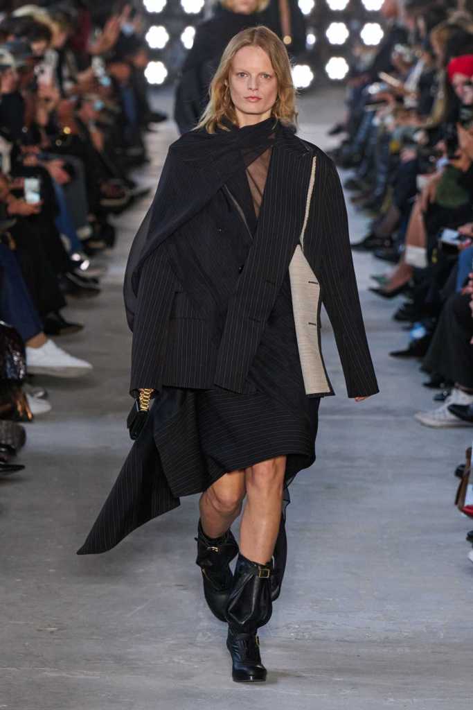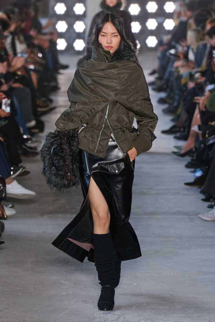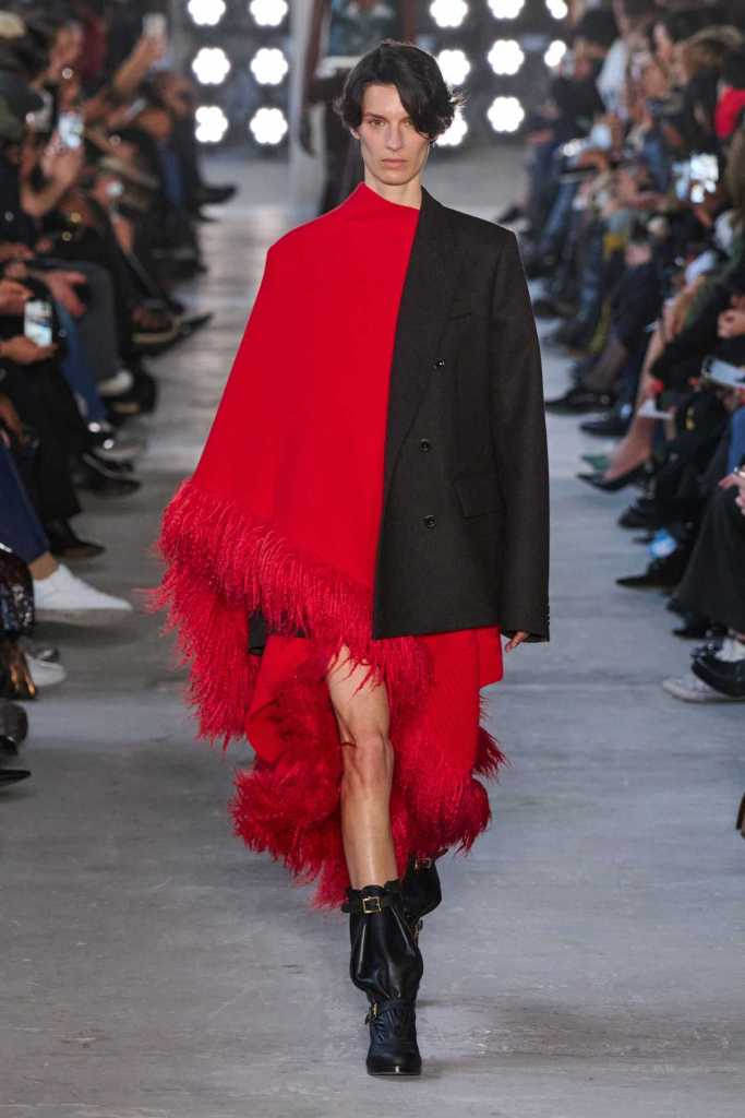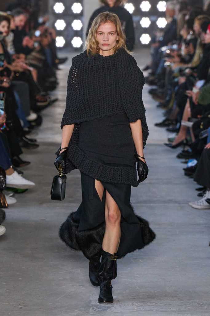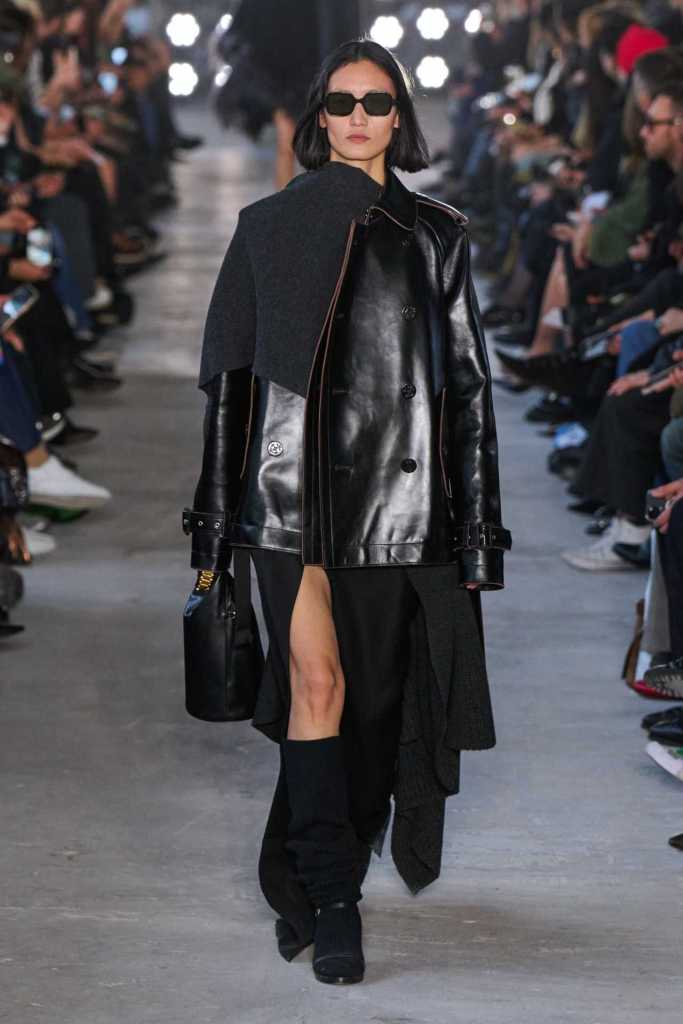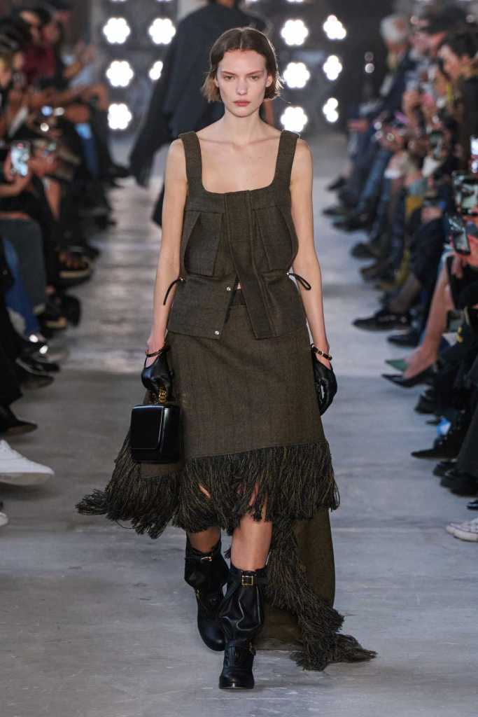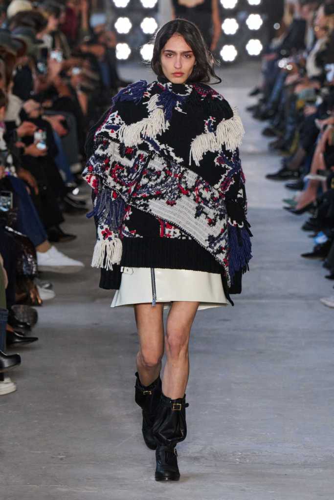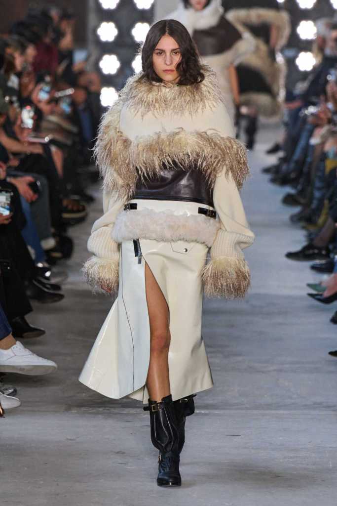 The Sacai woman has always embodied contrast, and this season was no different. Military jackets were softened with knitted panels, and tailored suiting was juxtaposed with chiffon and fringe knit panels, creating a layered, protective effect. Even Abe’s choice of footwear reflected this shift — gone were the towering platforms, replaced by faux-fur scuffs and low-heeled, slouchy boots.