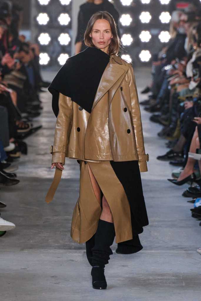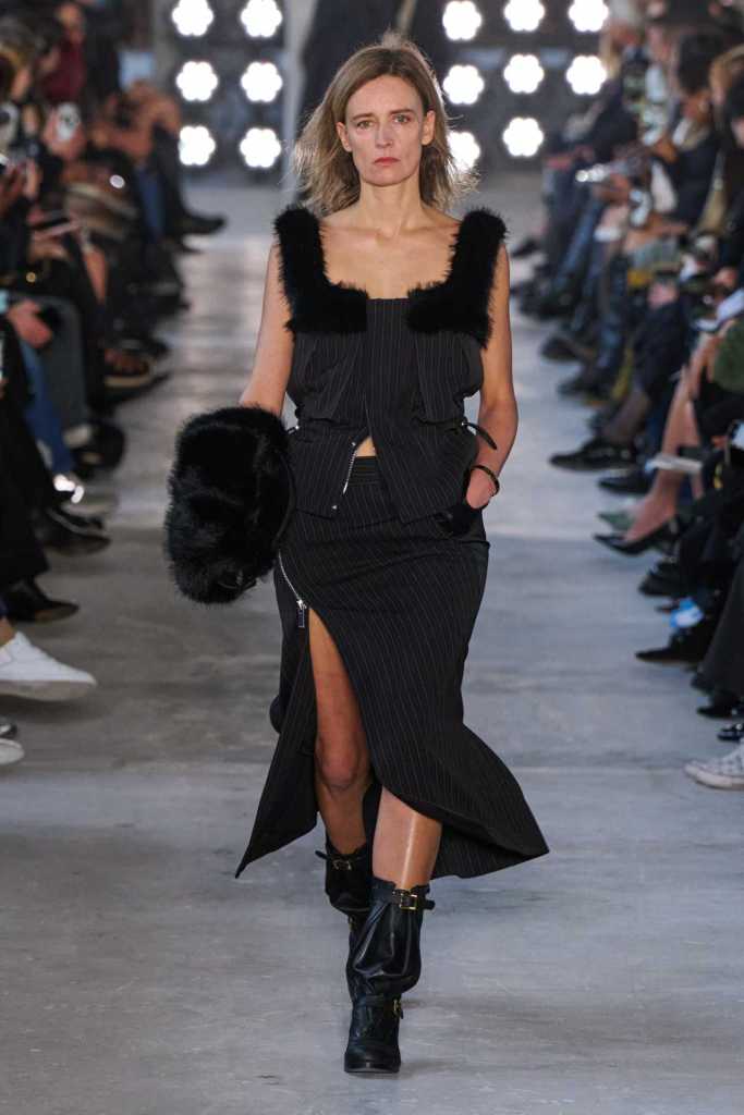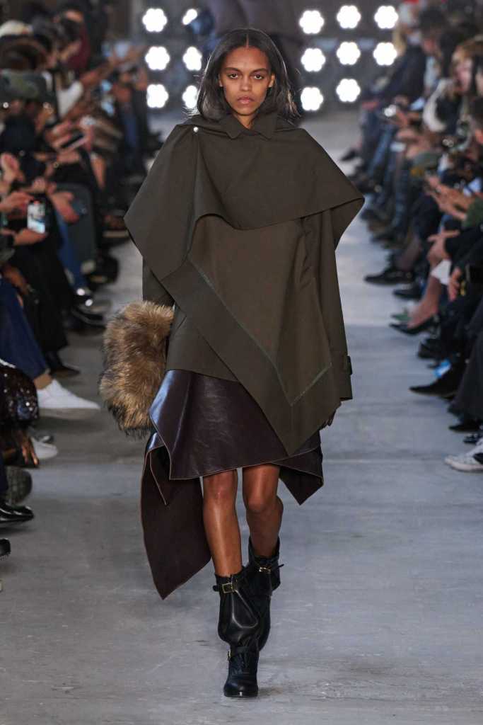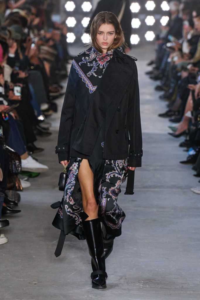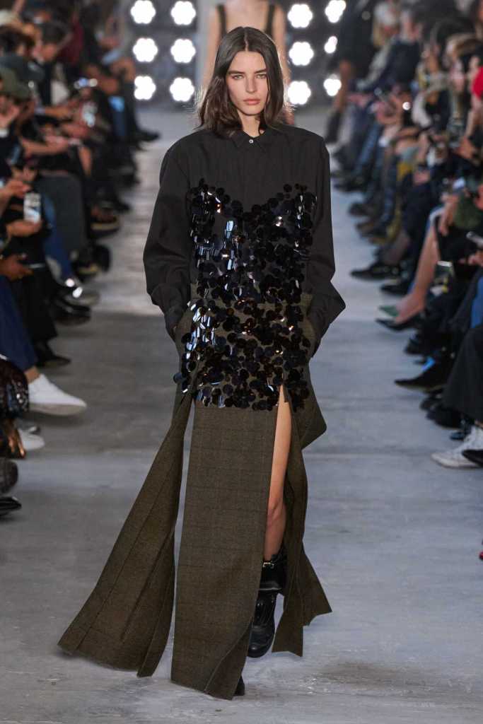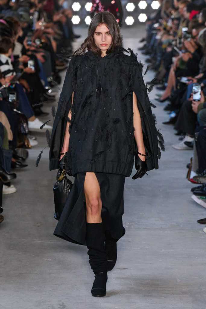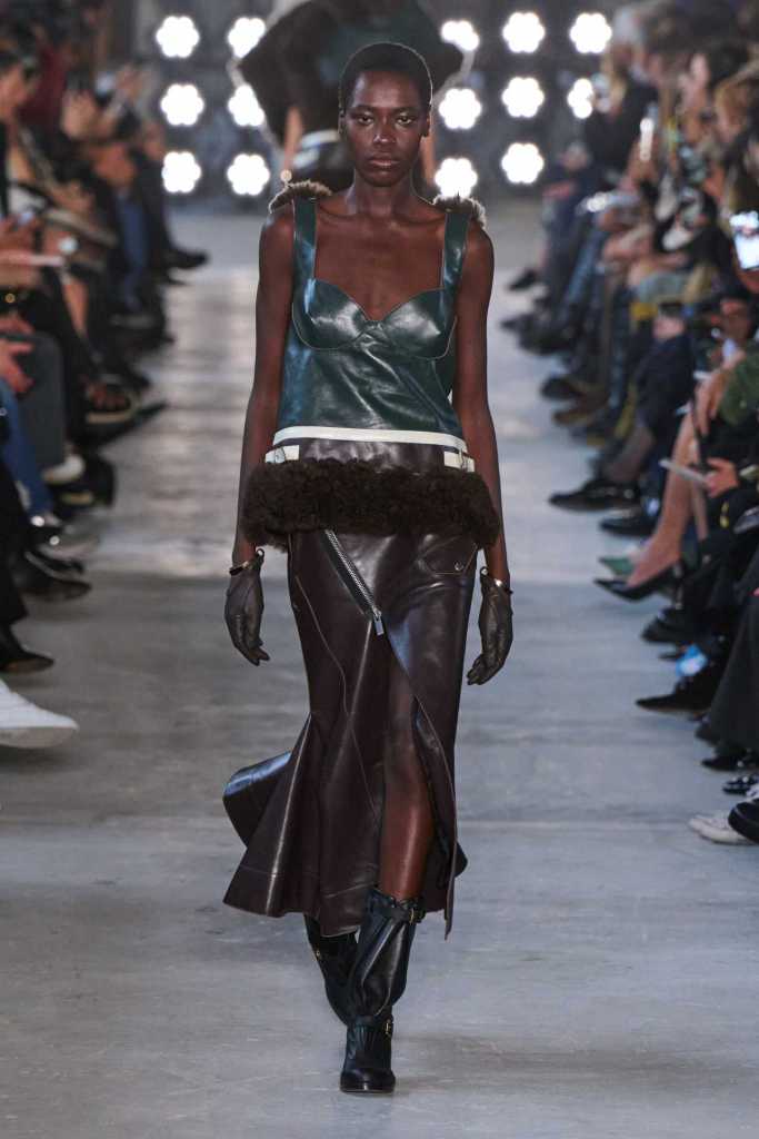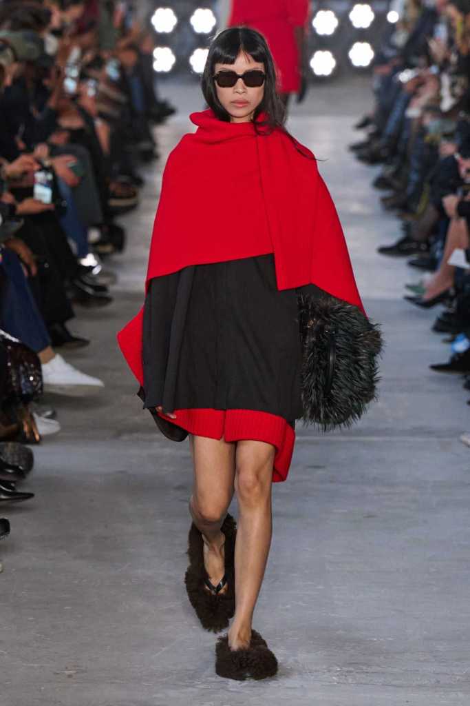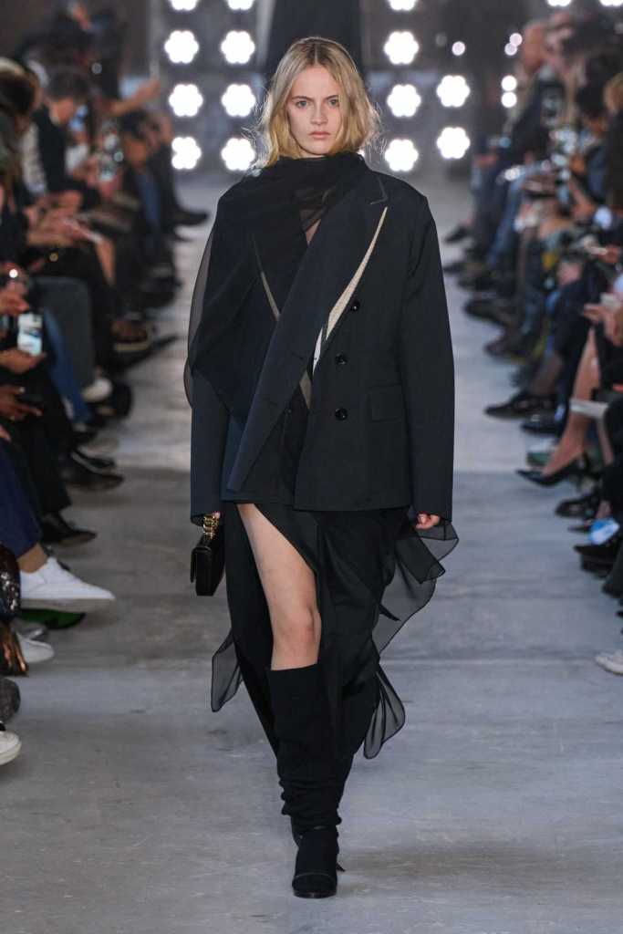 The Sacai woman has always embodied contrast, and this season was no different. Military jackets were softened with knitted panels, and tailored suiting was juxtaposed with chiffon and fringe knit panels, creating a layered, protective effect. Even Abe’s choice of footwear reflected this shift — gone were the towering platforms, replaced by faux-fur scuffs and low-heeled, slouchy boots.