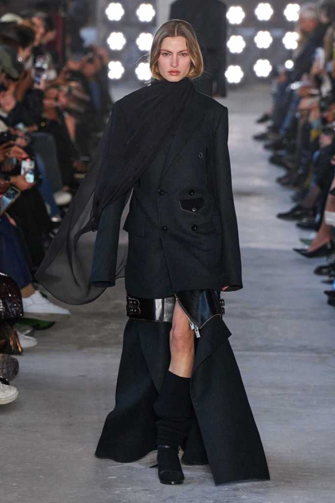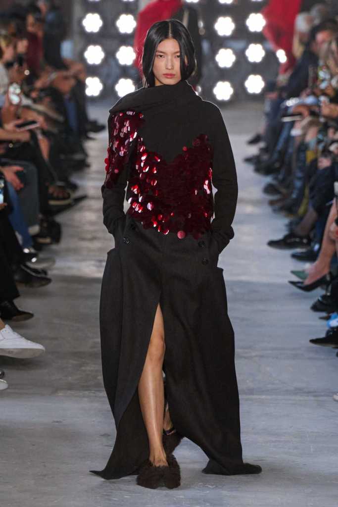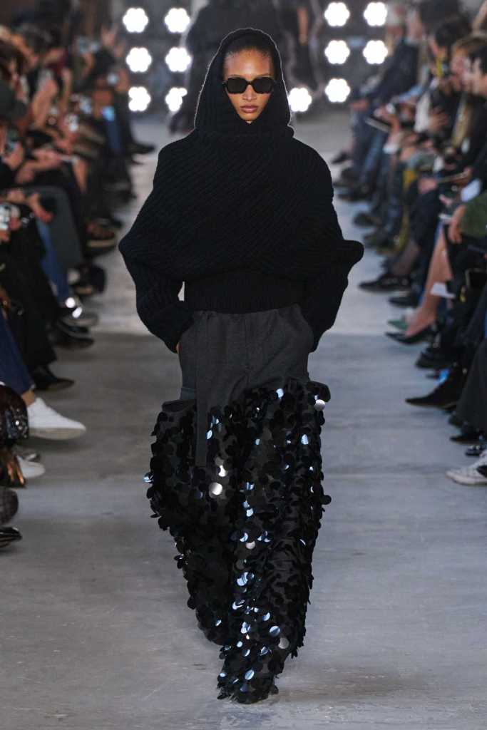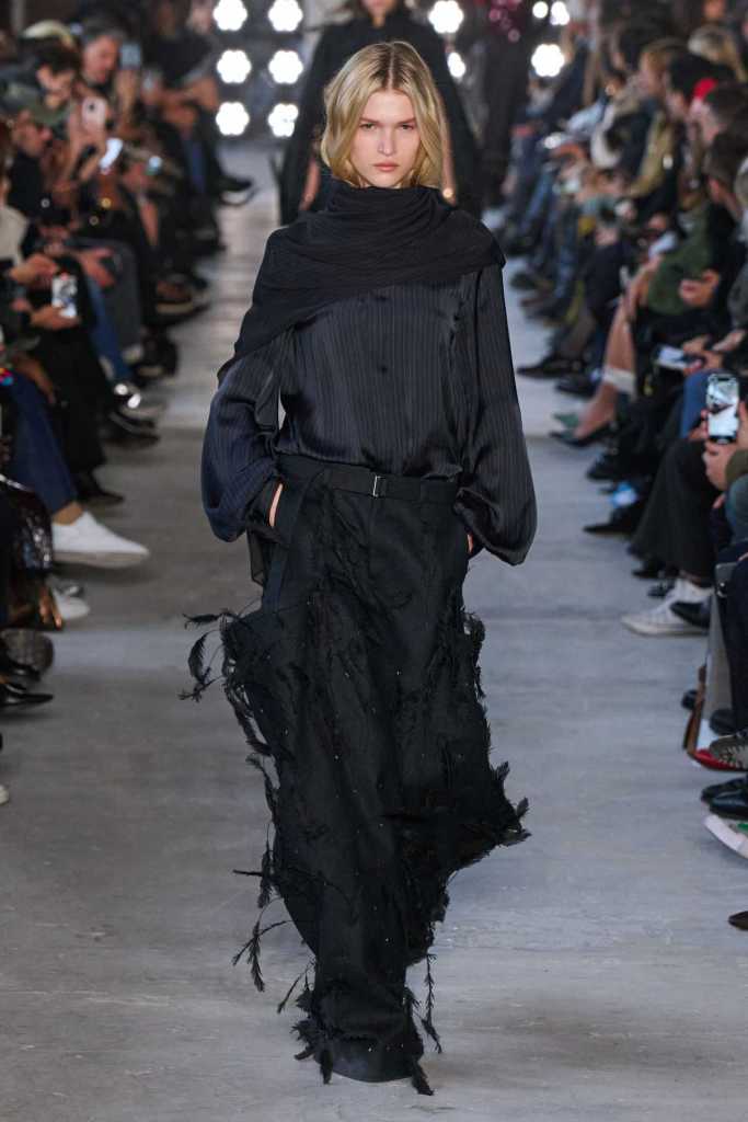 Abe reimagined familiar silhouettes by incorporating scarves seamlessly into jackets, allowing them to drape over one shoulder or hang loosely. This fluidity extended to wool blazers with integrated embellishments and ribbed hoodies paired with reflective, decorated cargo pants. Ponchos, crafted from puffer, wool, and fur, enveloped the models in warmth and protection, while mermaid skirts skimmed the body, bringing a delicate sensuality to the collection.