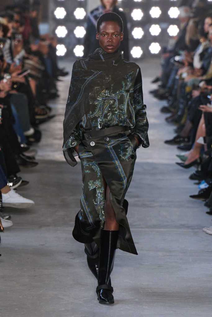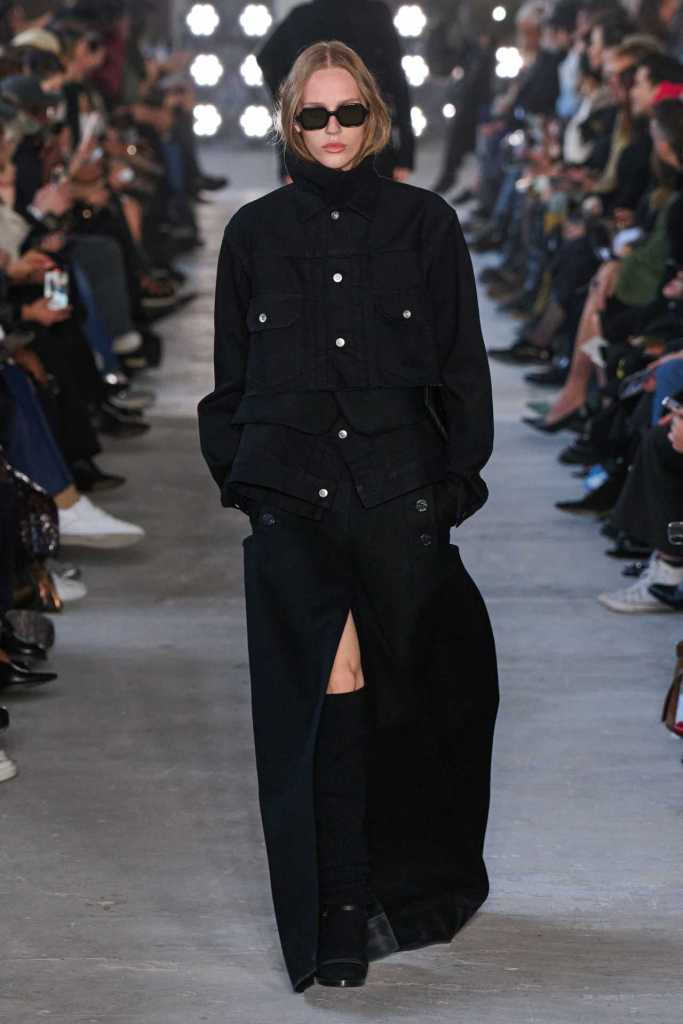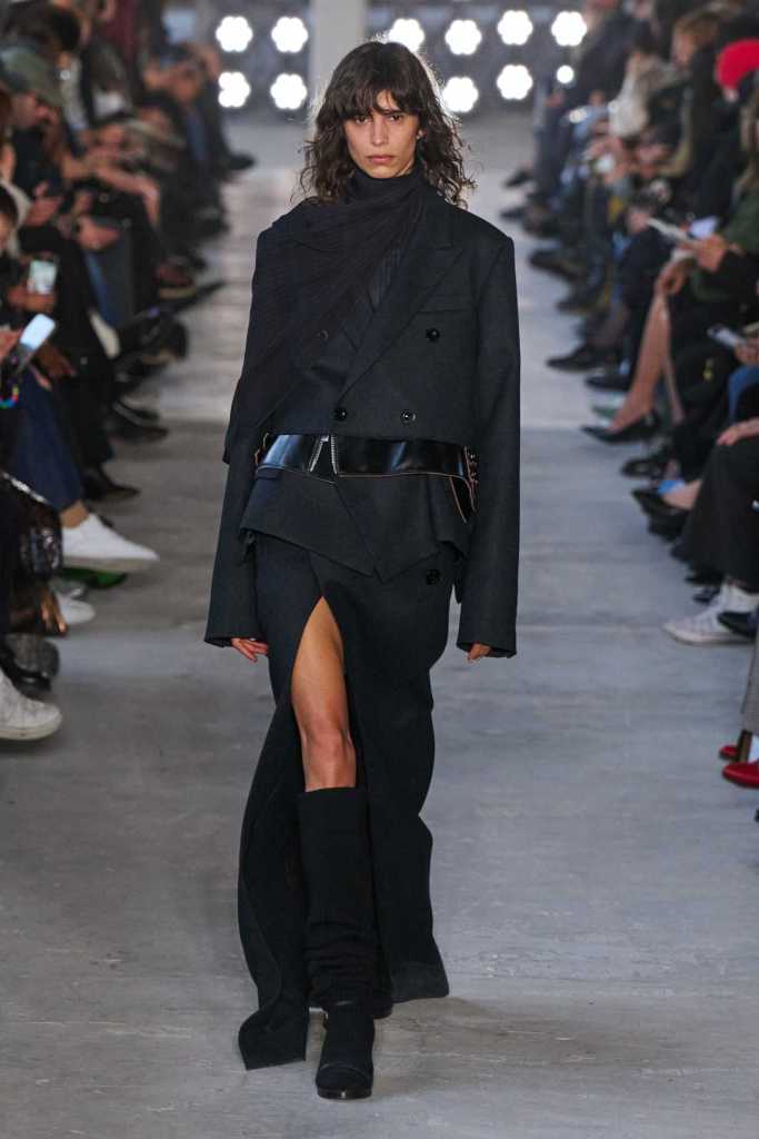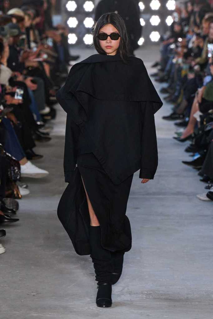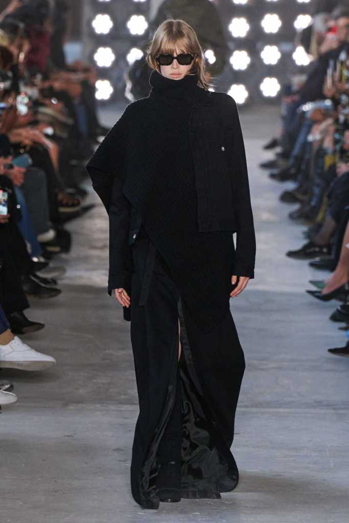 Abe reimagined familiar silhouettes by incorporating scarves seamlessly into jackets, allowing them to drape over one shoulder or hang loosely. This fluidity extended to wool blazers with integrated embellishments and ribbed hoodies paired with reflective, decorated cargo pants. Ponchos, crafted from puffer, wool, and fur, enveloped the models in warmth and protection, while mermaid skirts skimmed the body, bringing a delicate sensuality to the collection.