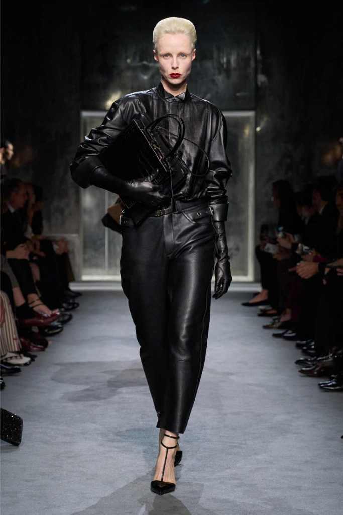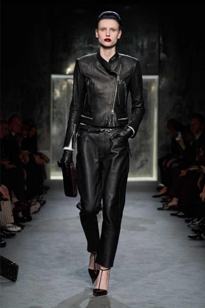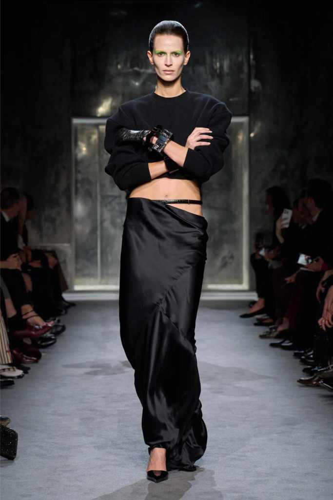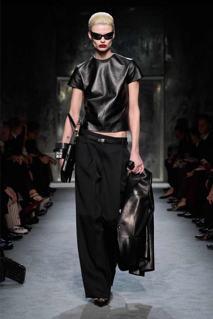 The show opened with a parade of sleek leather pieces in stark black and white, with pops of lipstick red and acid yellow. Leather T-shirts, moto jackets, and fluid bias-cut skirts created a tension between structure and fluidity. The standout? A cropped, fitted sweatshirt paired with a barely-there skirt, cinched at the waist with a skinny belt—quintessentially Ford, yet unmistakably Ackermann.