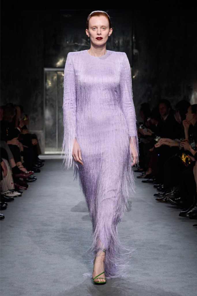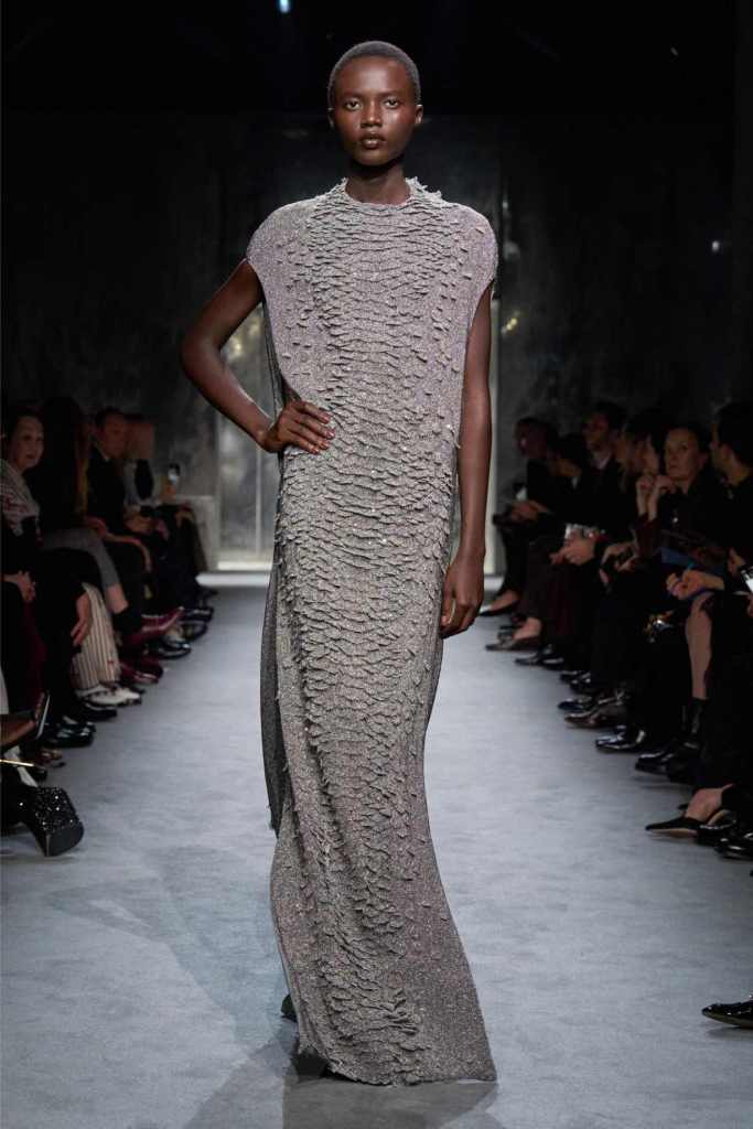 Ackermann’s approach to Ford’s iconic glamour was more about suggestion than overt seduction. He toyed with contrasts—hard and soft, masculine and feminine—while leaving room for the wearer’s imagination. His final looks, shimmering in grey with a texture that mimicked scales, paid homage to Ford’s love for exotic skins without being too literal.