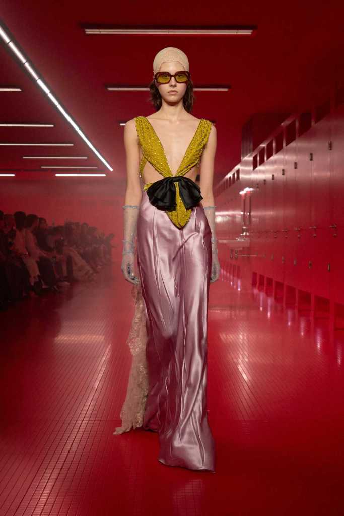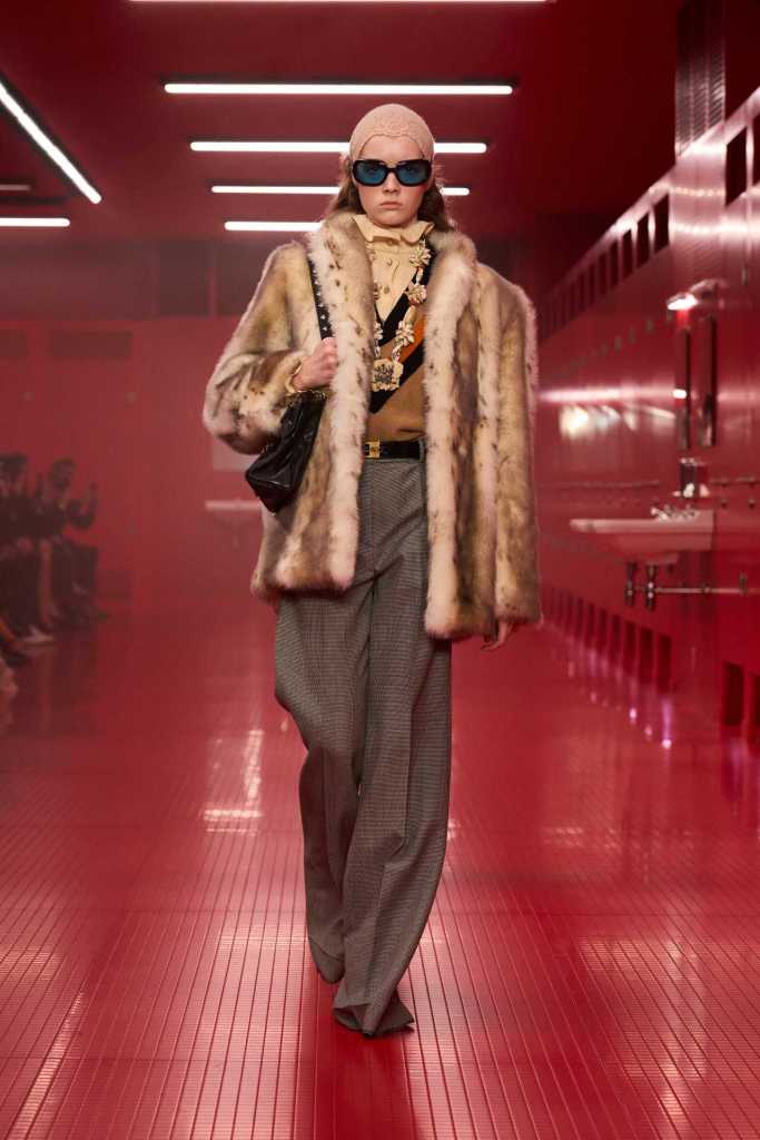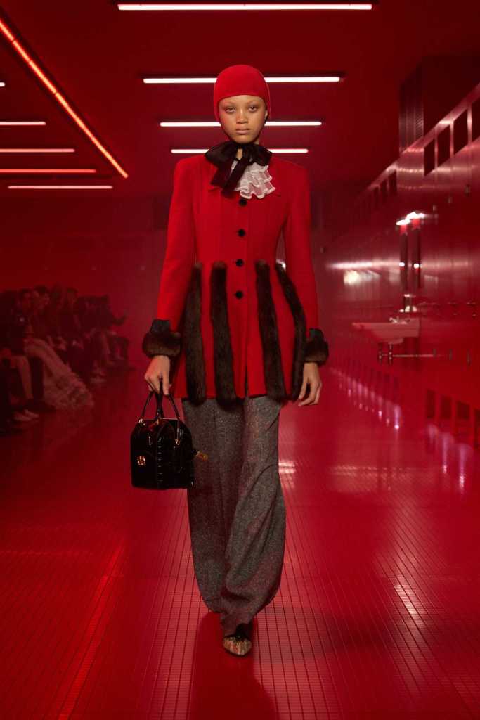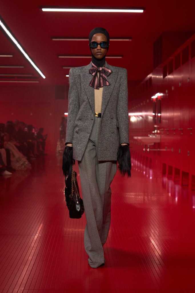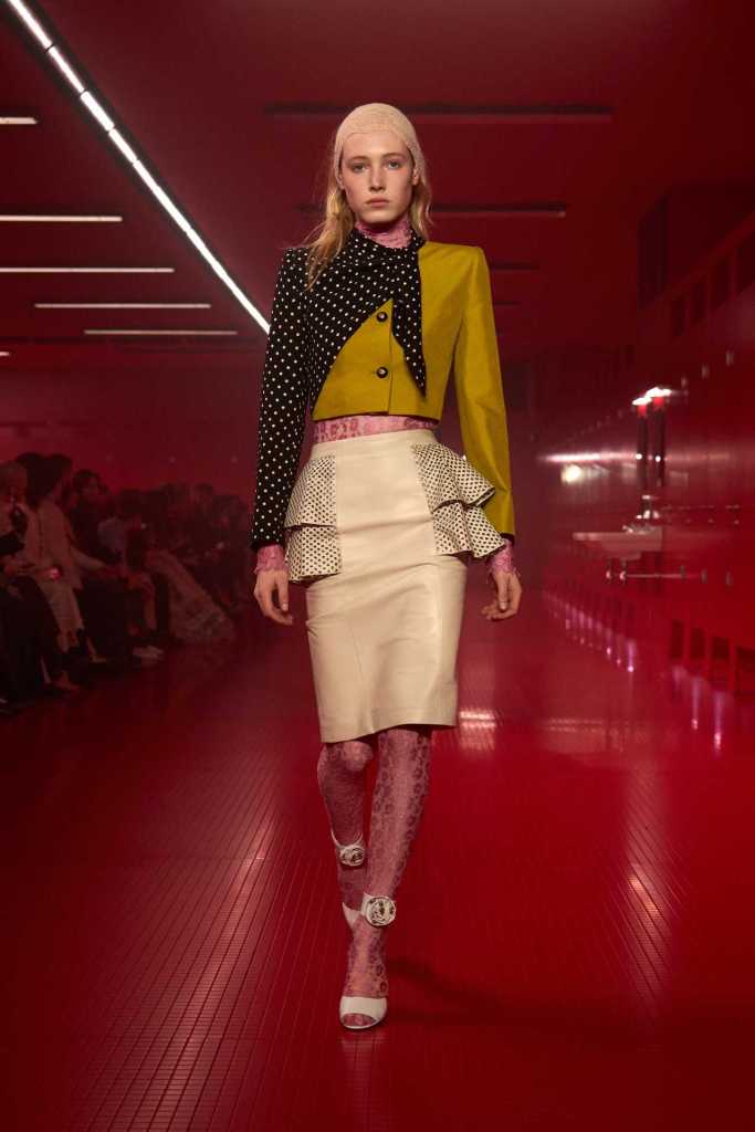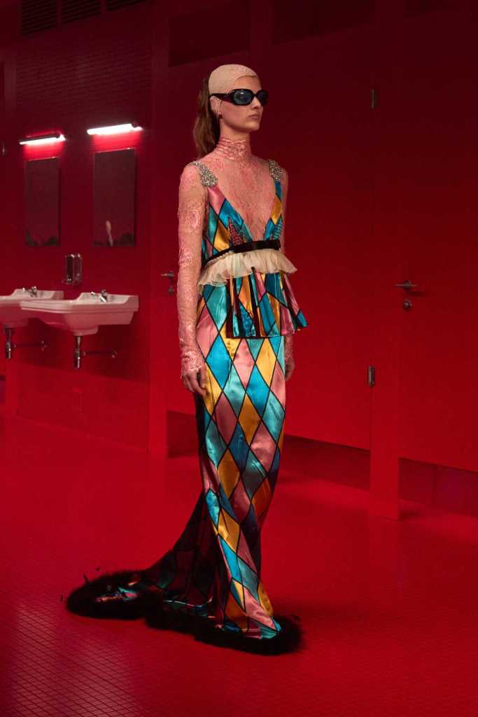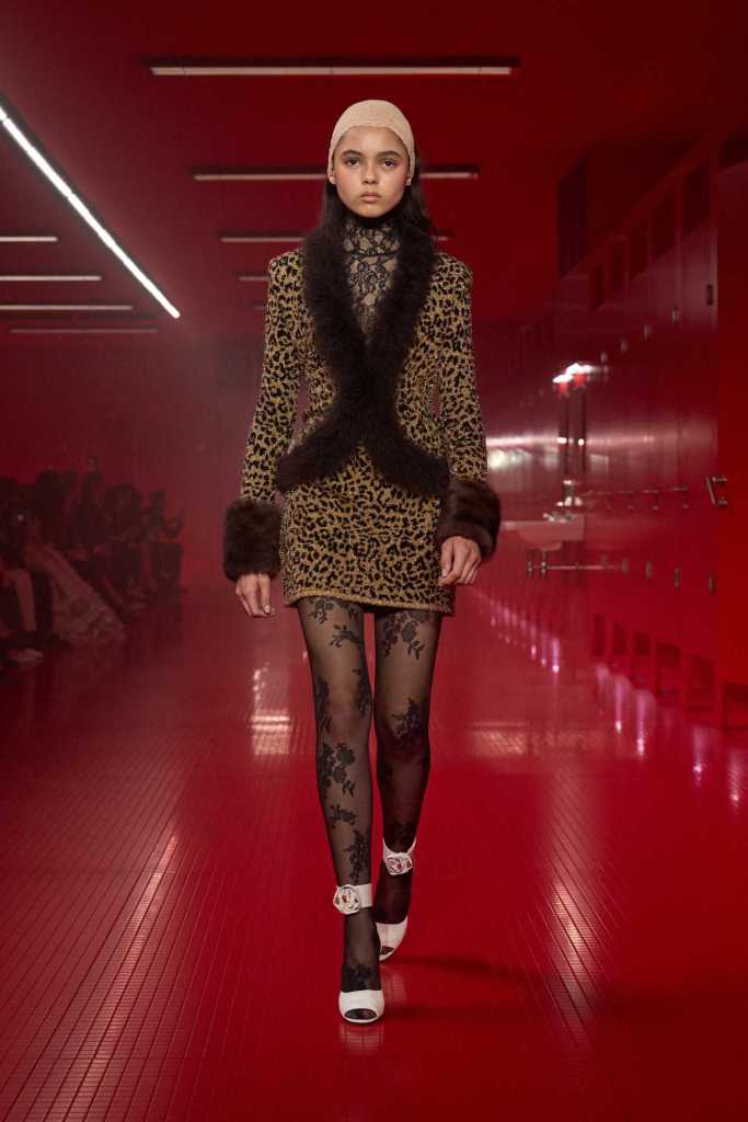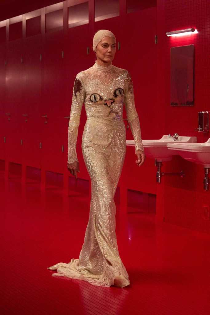 Michele revisited house codes, bringing back signature motifs like diamond prints and feline graphics while adding his playful, almost theatrical twist. He blended retro glamour with modern irreverence—think peekaboo bustiers with high-waisted ’70s jeans and slinky evening gowns with unexpected fur trims.