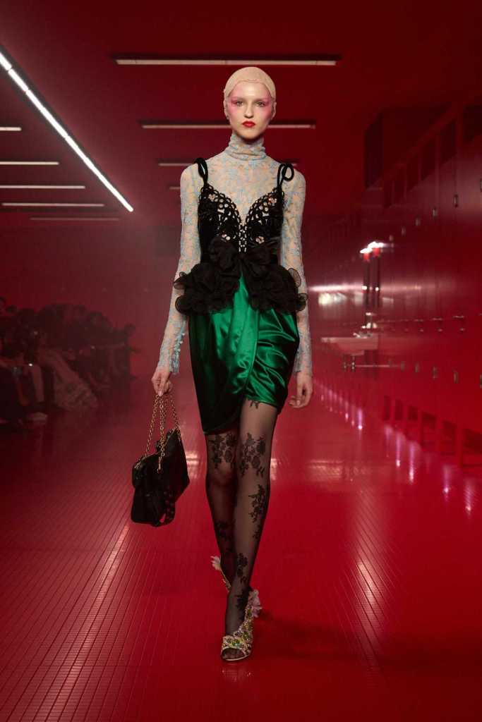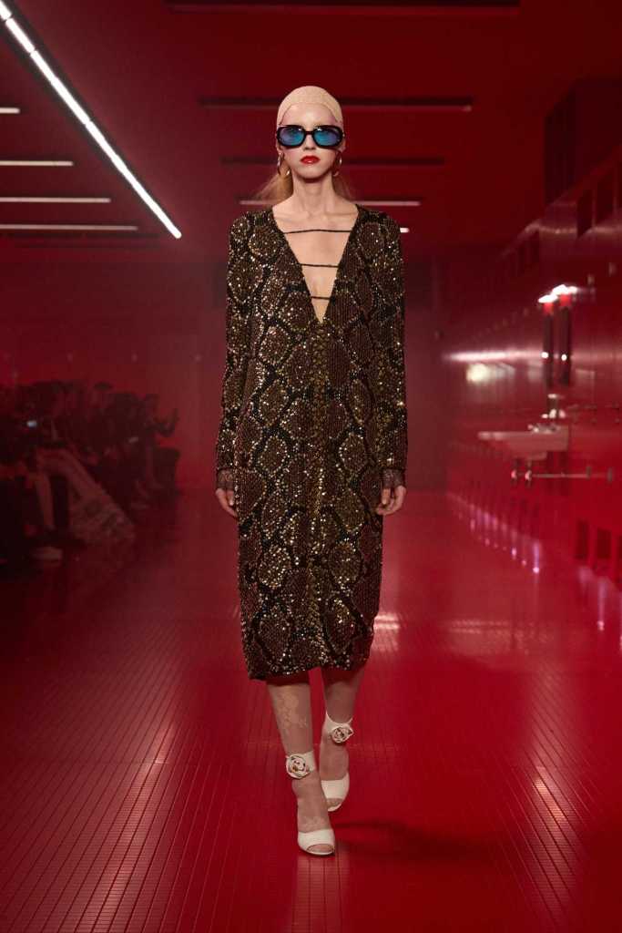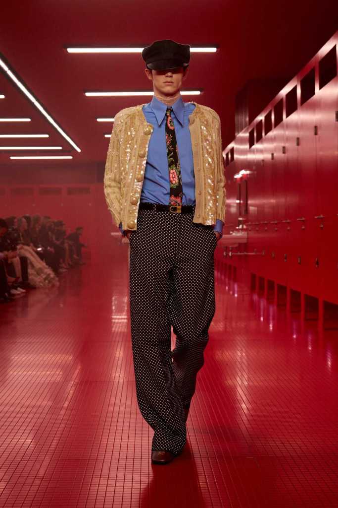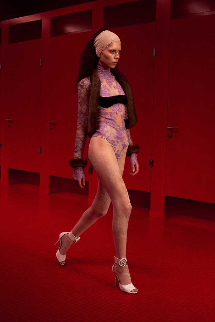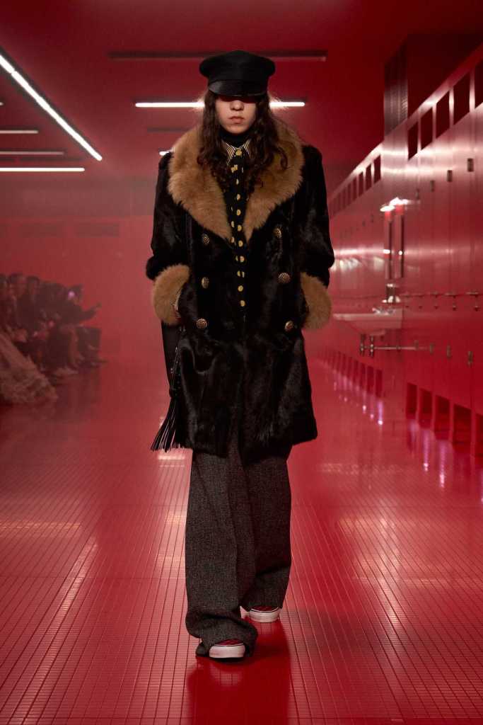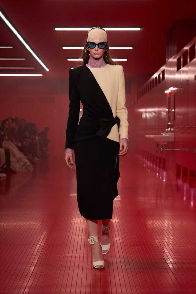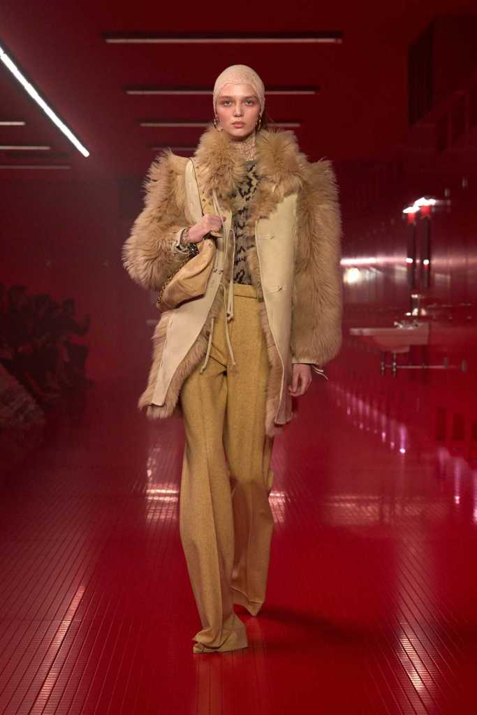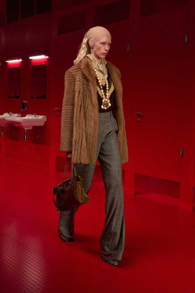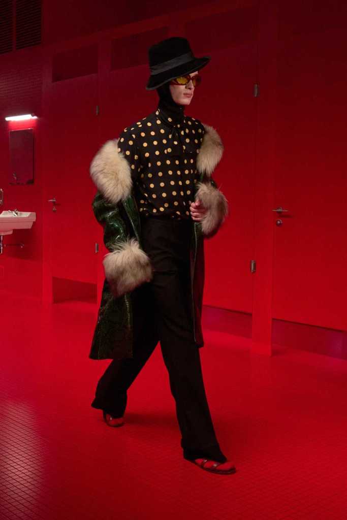 Michele revisited house codes, bringing back signature motifs like diamond prints and feline graphics while adding his playful, almost theatrical twist. He blended retro glamour with modern irreverence—think peekaboo bustiers with high-waisted ’70s jeans and slinky evening gowns with unexpected fur trims.