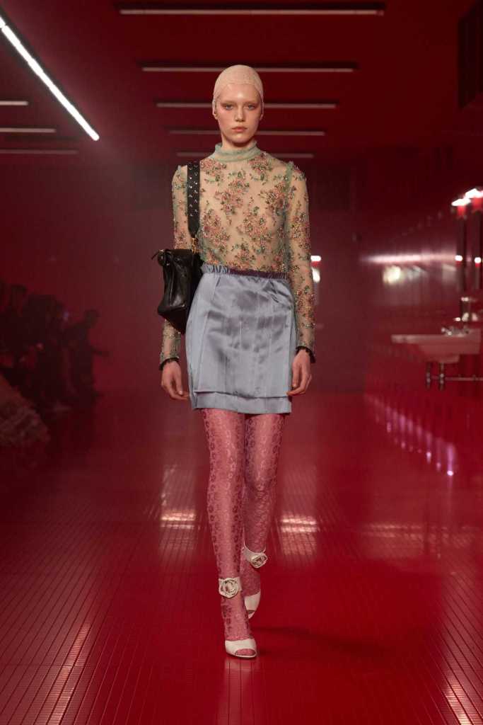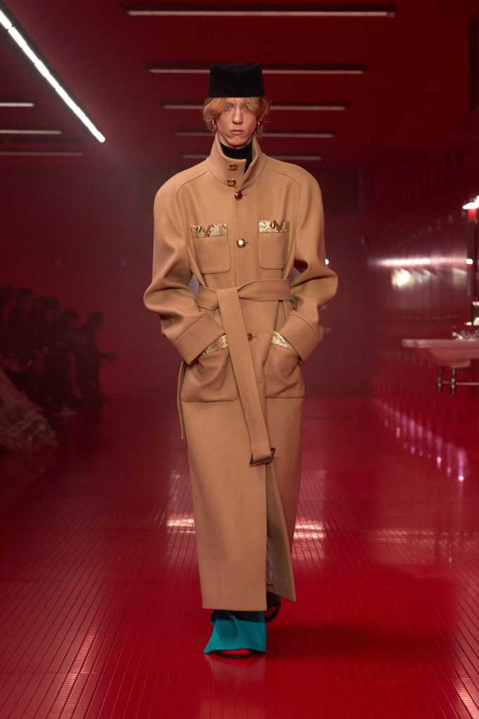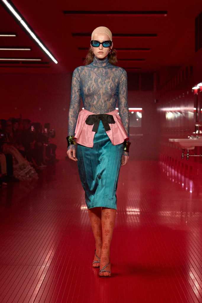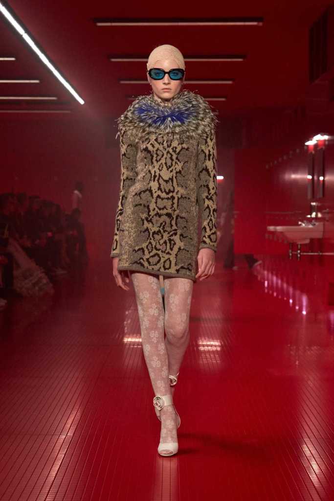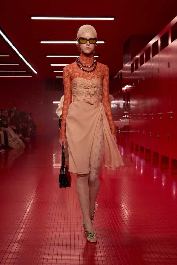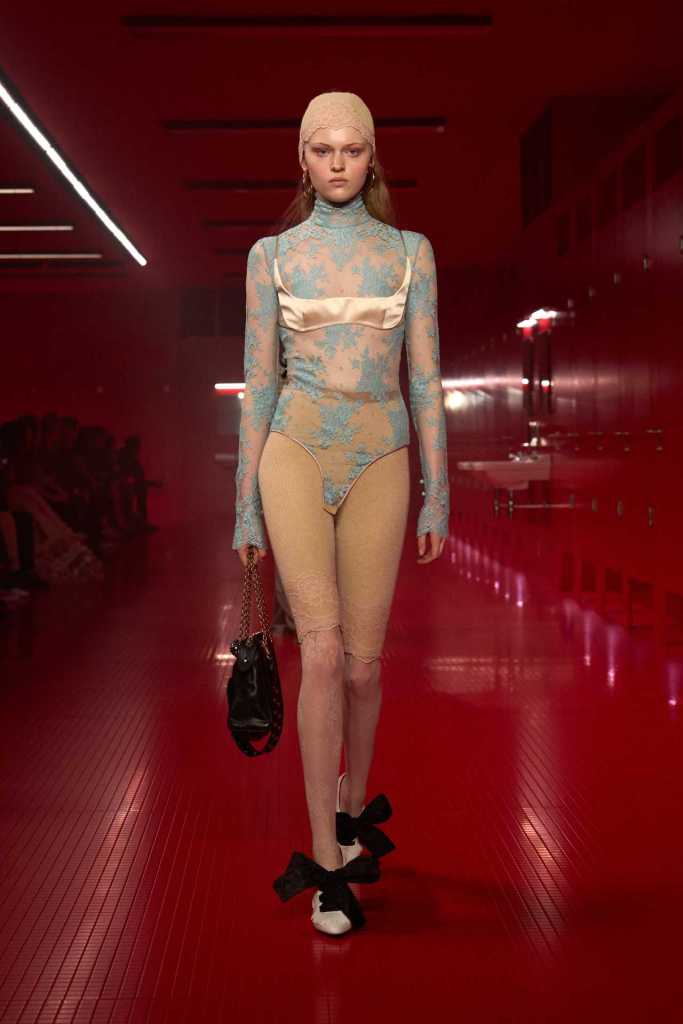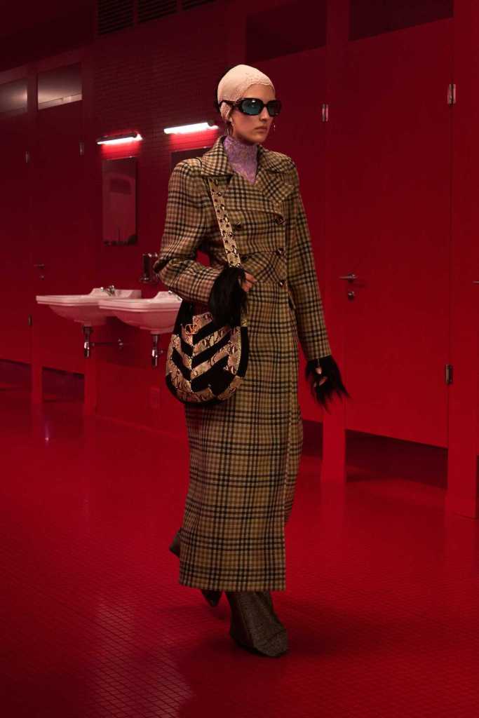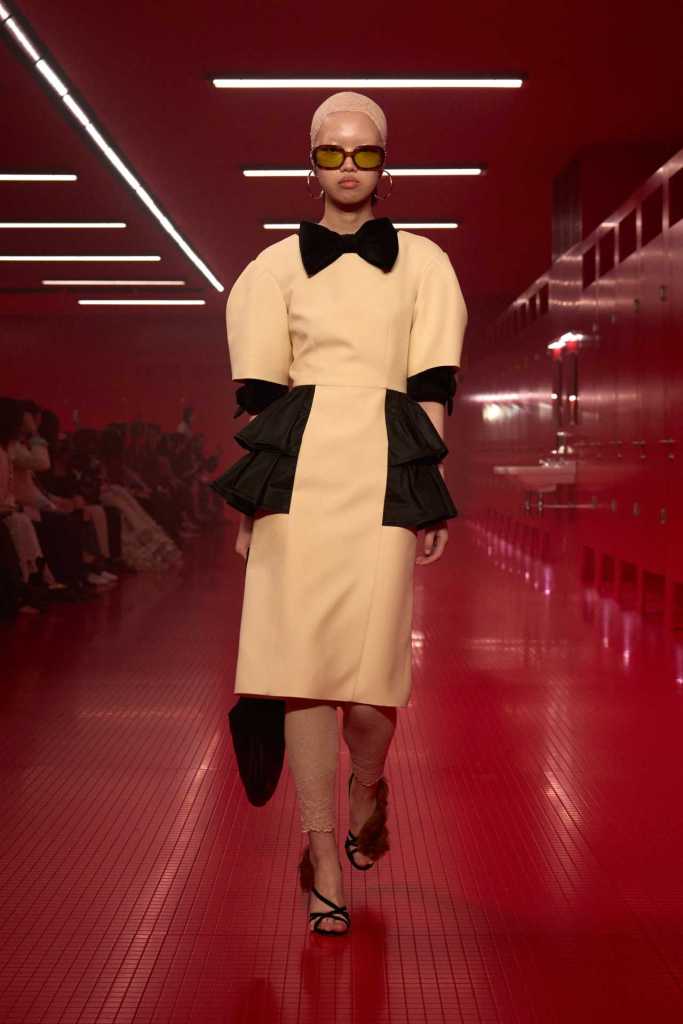 Michele revisited house codes, bringing back signature motifs like diamond prints and feline graphics while adding his playful, almost theatrical twist. He blended retro glamour with modern irreverence—think peekaboo bustiers with high-waisted ’70s jeans and slinky evening gowns with unexpected fur trims.