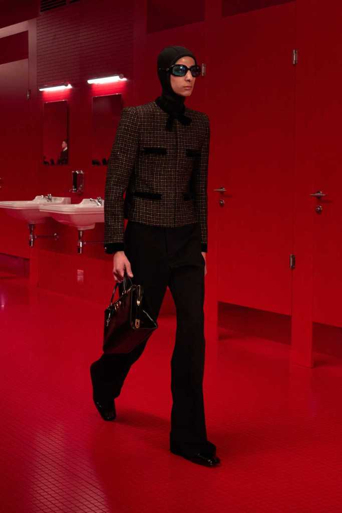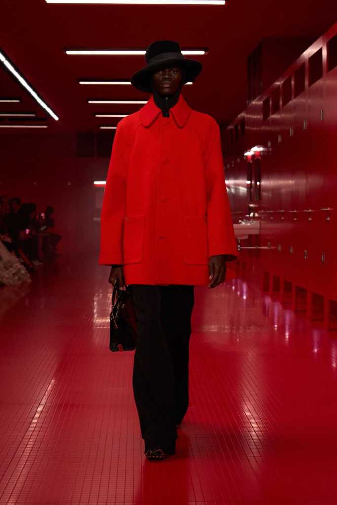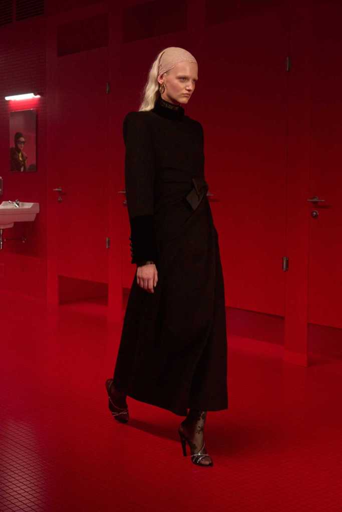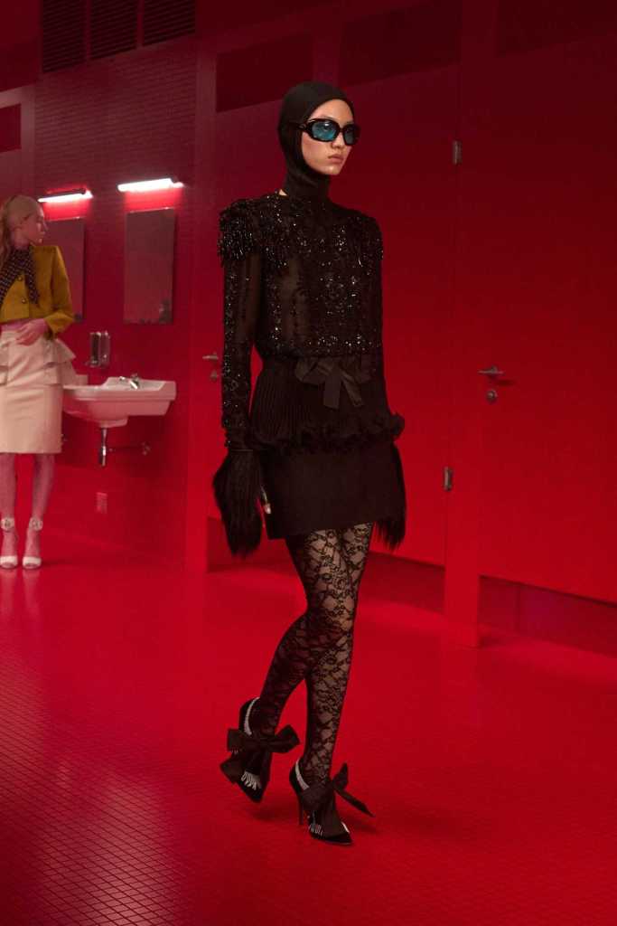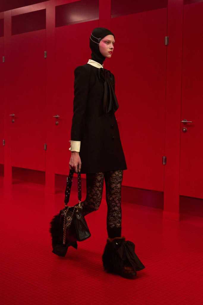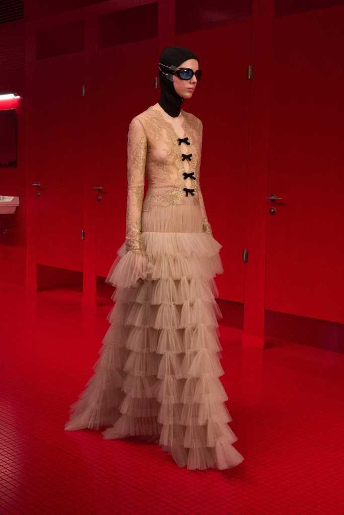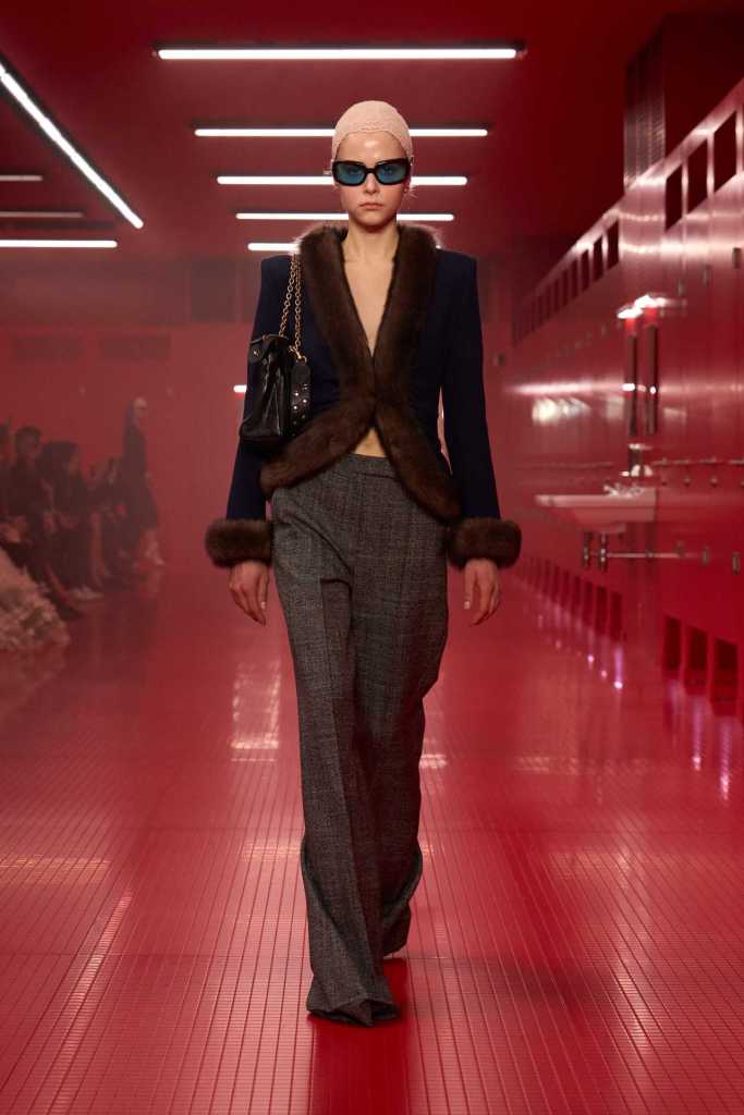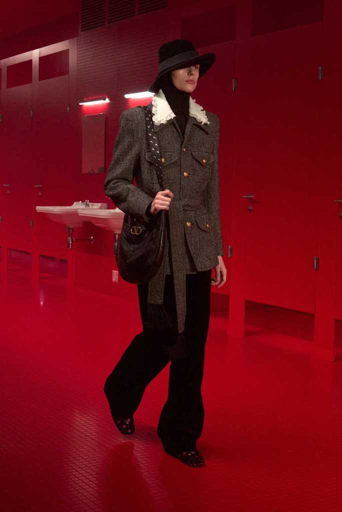 Models emerged from bathroom stalls, highlighting the idea that even our most private moments are a form of performance. The collection reflected this duality—lace bodysuits left undone at the crotch juxtaposed with slouchy tweed trousers and bow-tied ’40s day dresses. Elements of lingerie were paired with casual athleisure, while sheer slip dresses hid beneath voluminous coats. Michele’s signature maximalist touch was omnipresent—embellished sleeves, exaggerated peplums, and opulent accessories like broad-brimmed hats and vintage-inspired handbags. The colour palette was equally delicious—inky blacks, dusty roses, and deep plums punctuated by flashes of vibrant Valentino red. The mix of textures—structured wool, sheer organza, and plush fur—created a tactile experience that was playful.