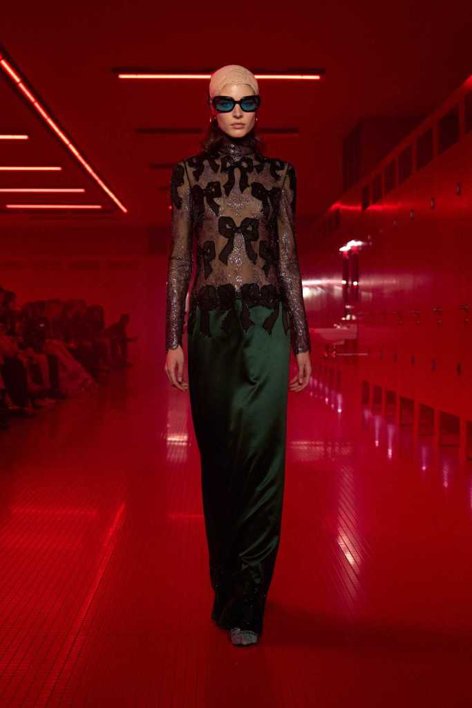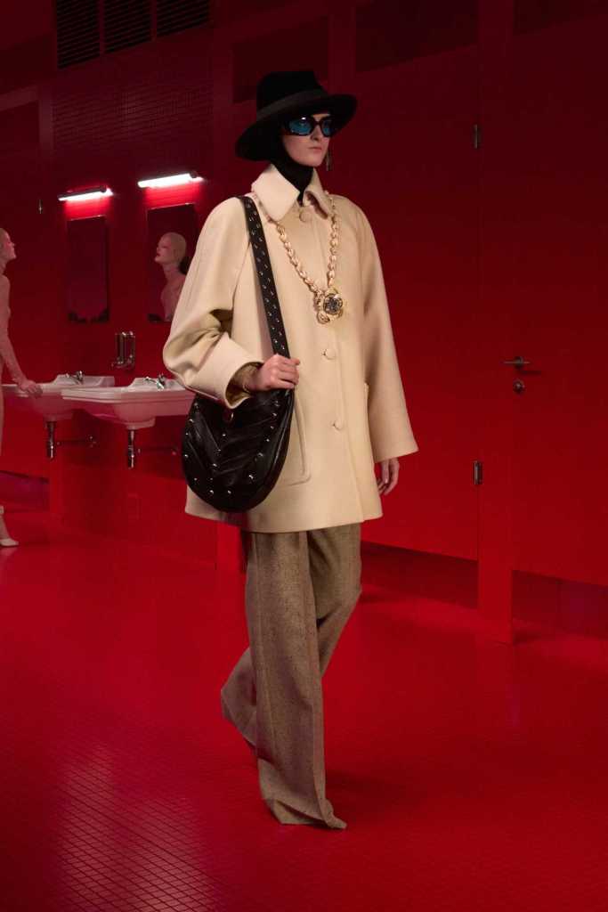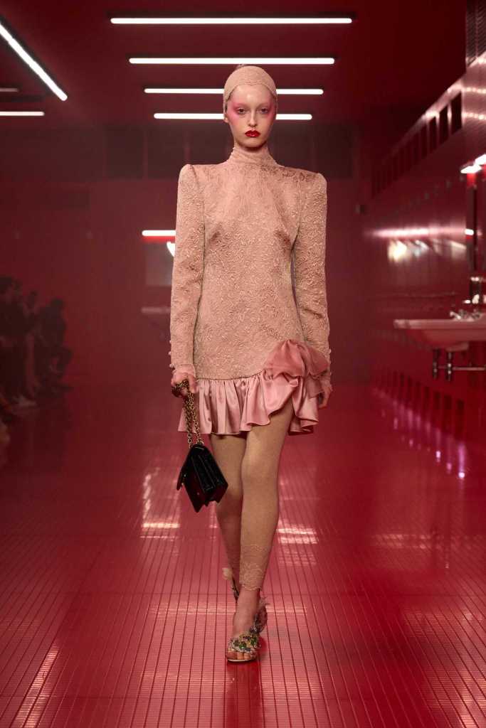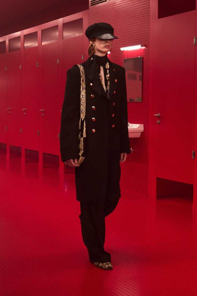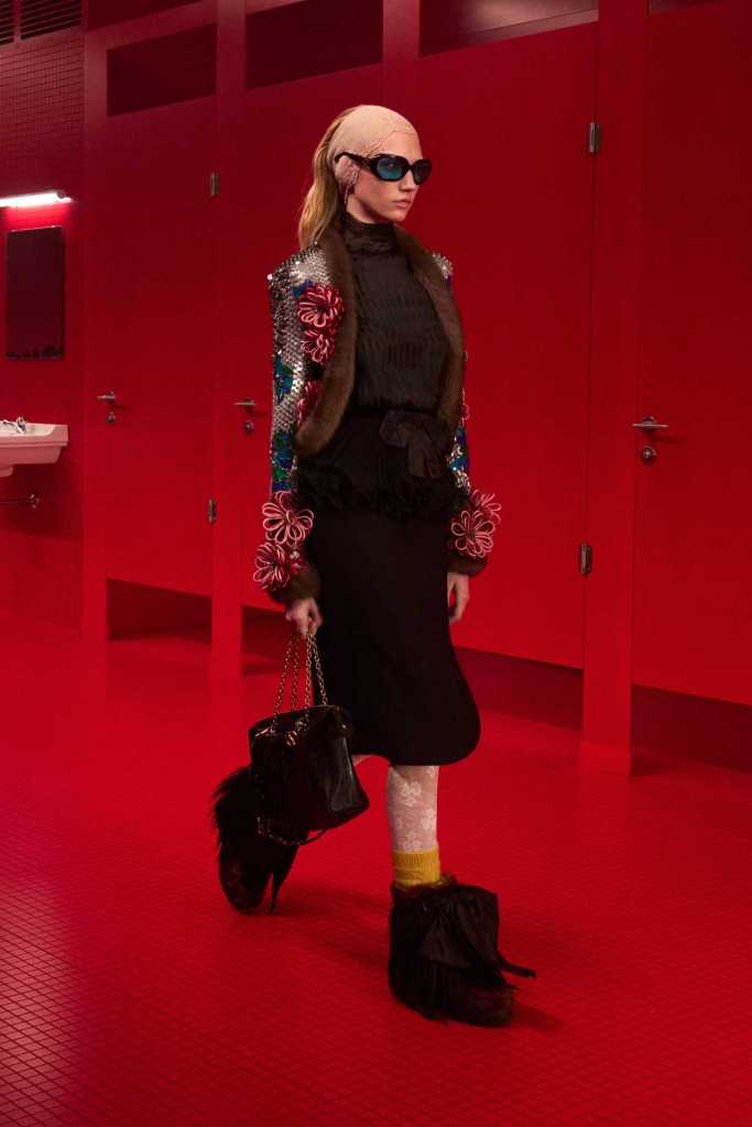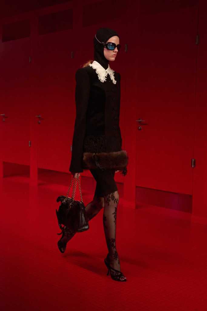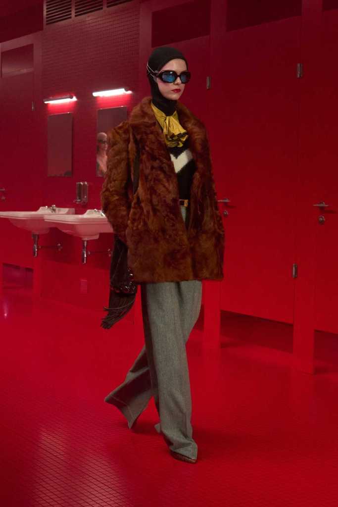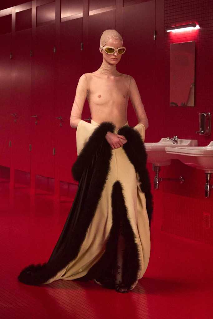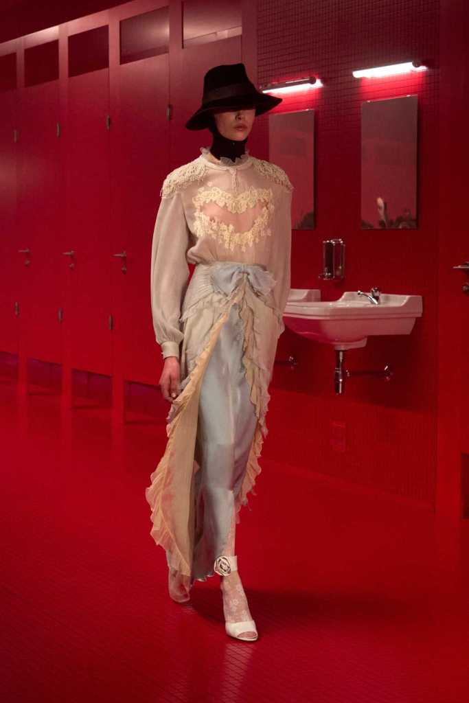 Models emerged from bathroom stalls, highlighting the idea that even our most private moments are a form of performance. The collection reflected this duality—lace bodysuits left undone at the crotch juxtaposed with slouchy tweed trousers and bow-tied ’40s day dresses. Elements of lingerie were paired with casual athleisure, while sheer slip dresses hid beneath voluminous coats. Michele’s signature maximalist touch was omnipresent—embellished sleeves, exaggerated peplums, and opulent accessories like broad-brimmed hats and vintage-inspired handbags. The colour palette was equally delicious—inky blacks, dusty roses, and deep plums punctuated by flashes of vibrant Valentino red. The mix of textures—structured wool, sheer organza, and plush fur—created a tactile experience that was playful.
