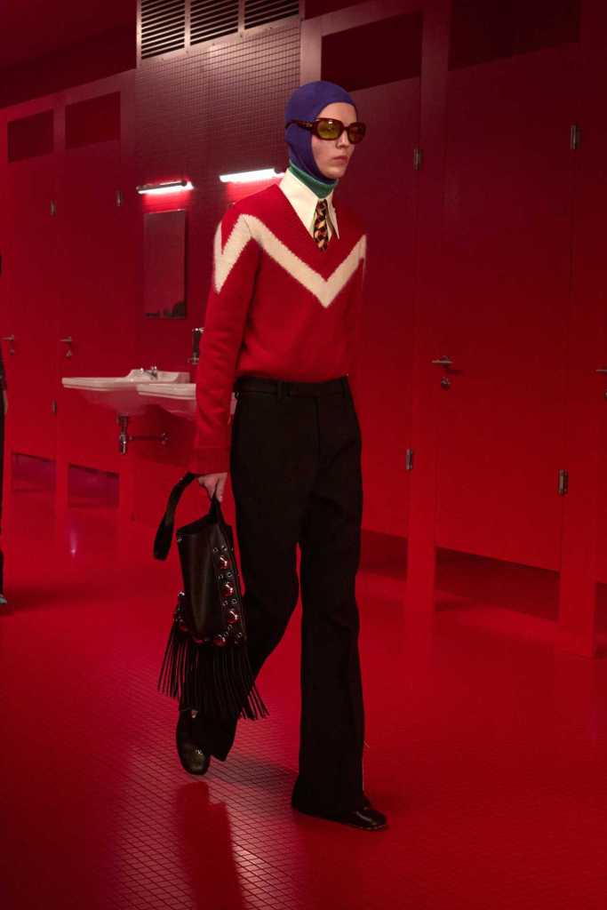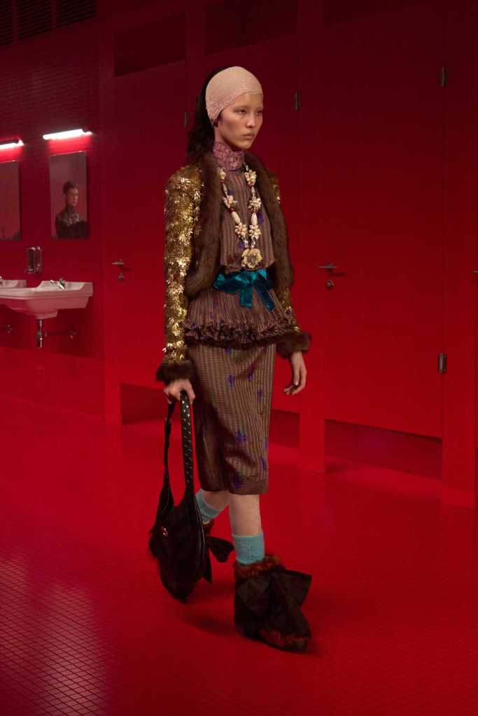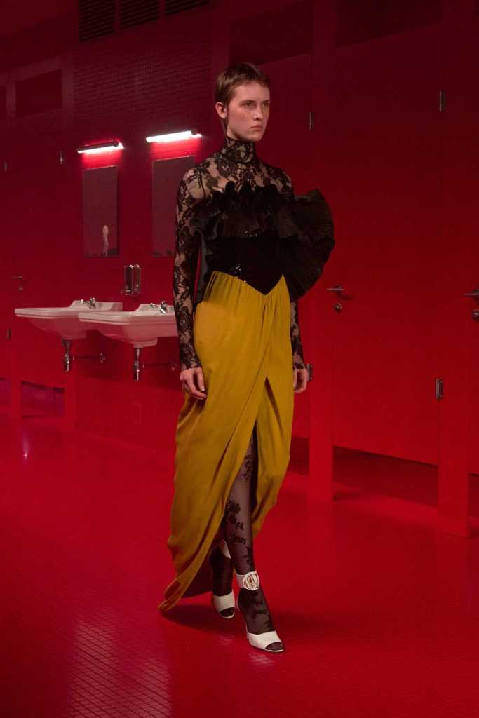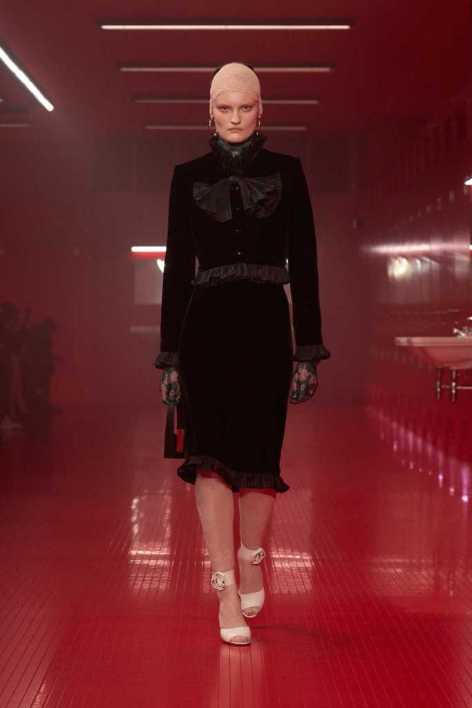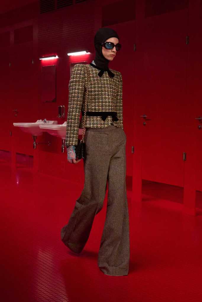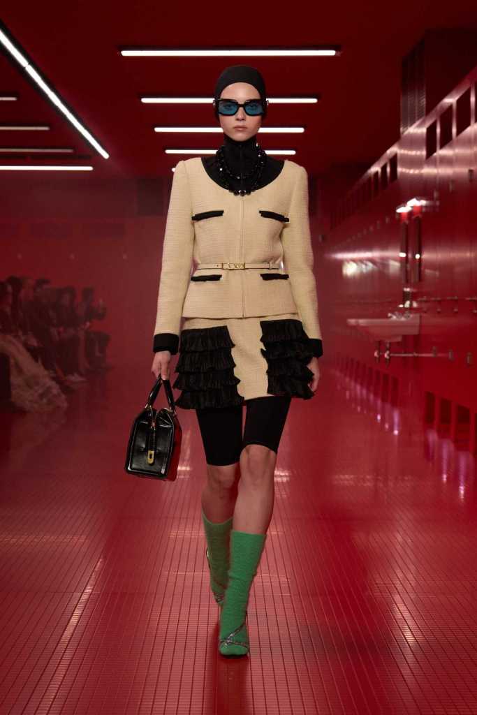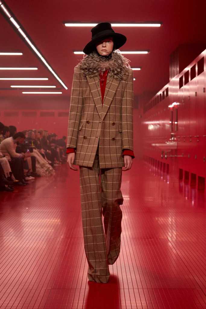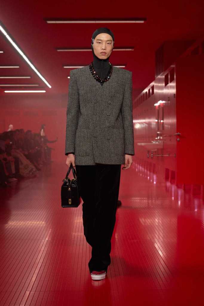 Models emerged from bathroom stalls, highlighting the idea that even our most private moments are a form of performance. The collection reflected this duality—lace bodysuits left undone at the crotch juxtaposed with slouchy tweed trousers and bow-tied ’40s day dresses. Elements of lingerie were paired with casual athleisure, while sheer slip dresses hid beneath voluminous coats. Michele’s signature maximalist touch was omnipresent—embellished sleeves, exaggerated peplums, and opulent accessories like broad-brimmed hats and vintage-inspired handbags. The colour palette was equally delicious—inky blacks, dusty roses, and deep plums punctuated by flashes of vibrant Valentino red. The mix of textures—structured wool, sheer organza, and plush fur—created a tactile experience that was playful.